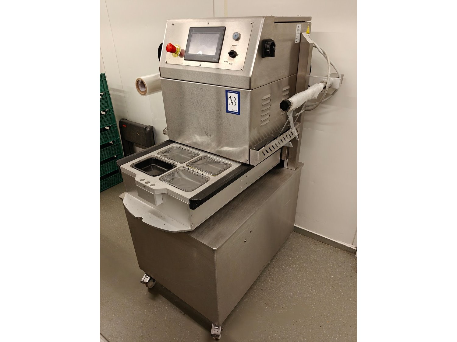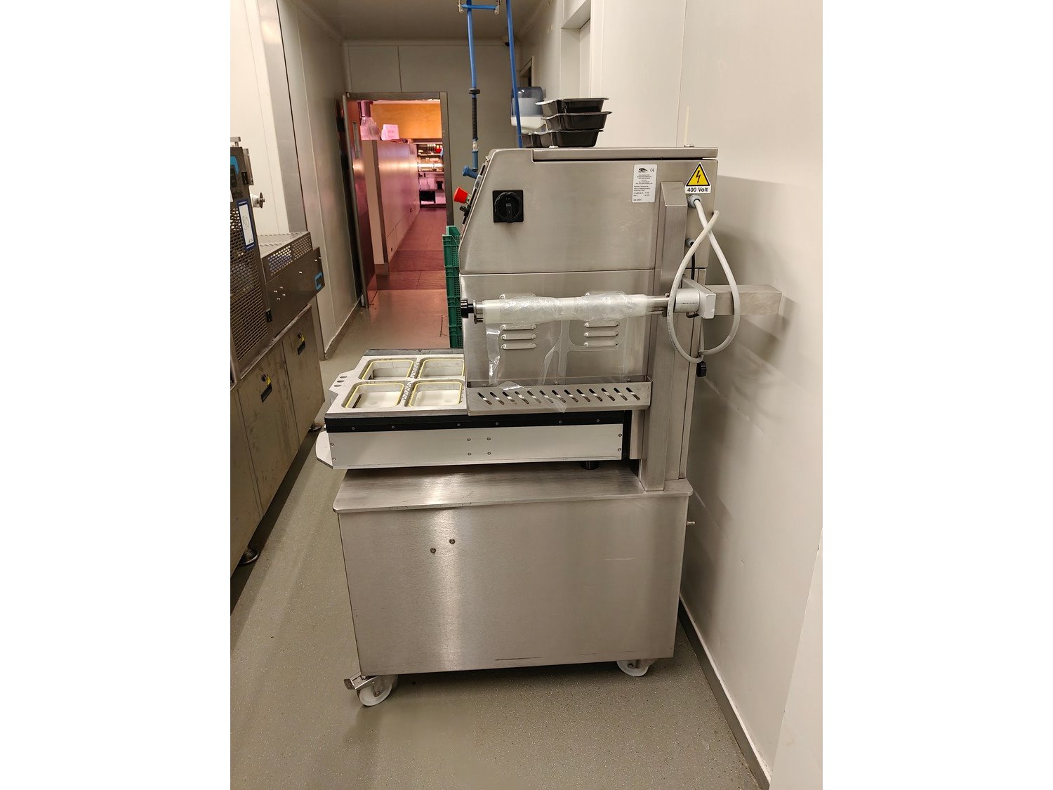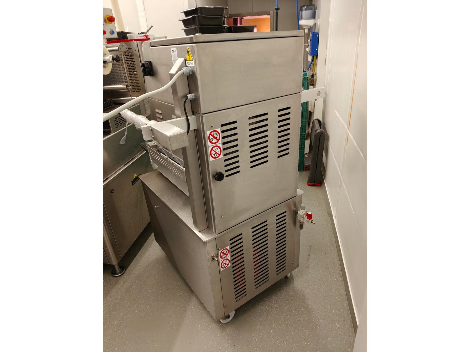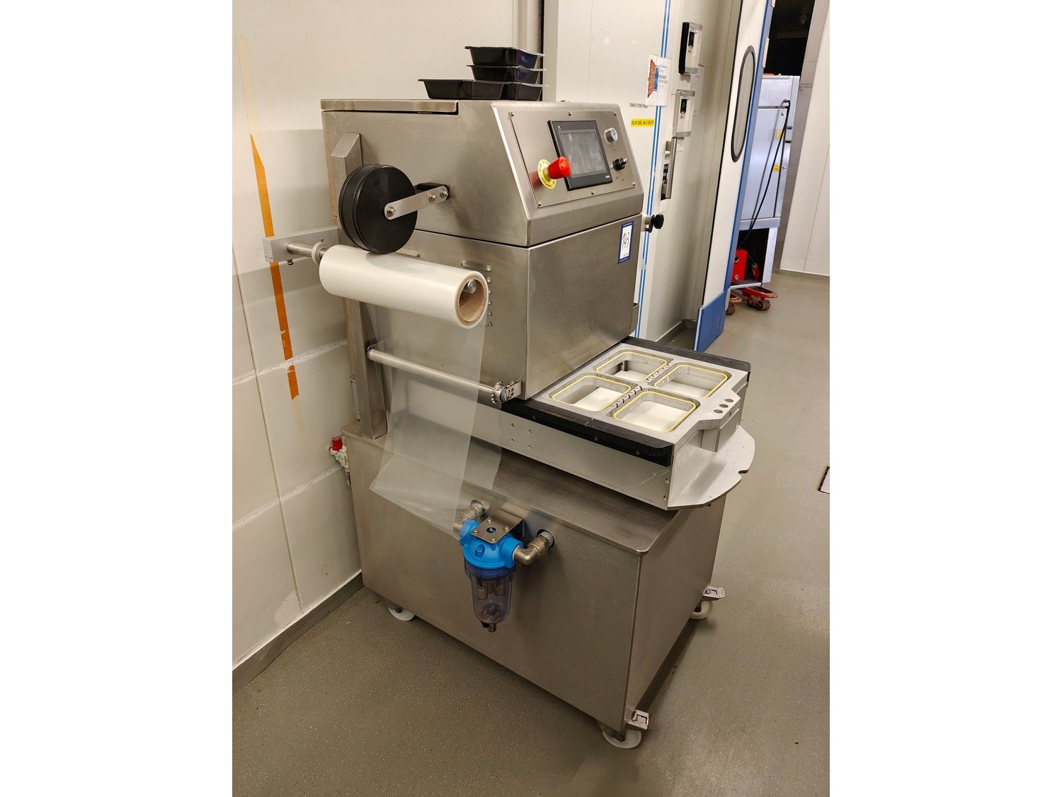 Olympus mobile traysealer, type: OLYV060OCEpFIMPIcR, serial number: 185015, year of construction: 2018, 400 V, 3 Ph, 50 Hz, 4 kW, 320 kg, 320 kg , dye: (4x) 173 mm x 122 mm, Busch vacuum pump, type: RA 0063 F 4S3, serial number: D18091646, year of construction: 2018, 63 m³/h, total dimensions: 990 mm x 1050 mm x 1520 mm. Kavel locatie: Ieperstraat 14, 8980 Zonnebeke, België