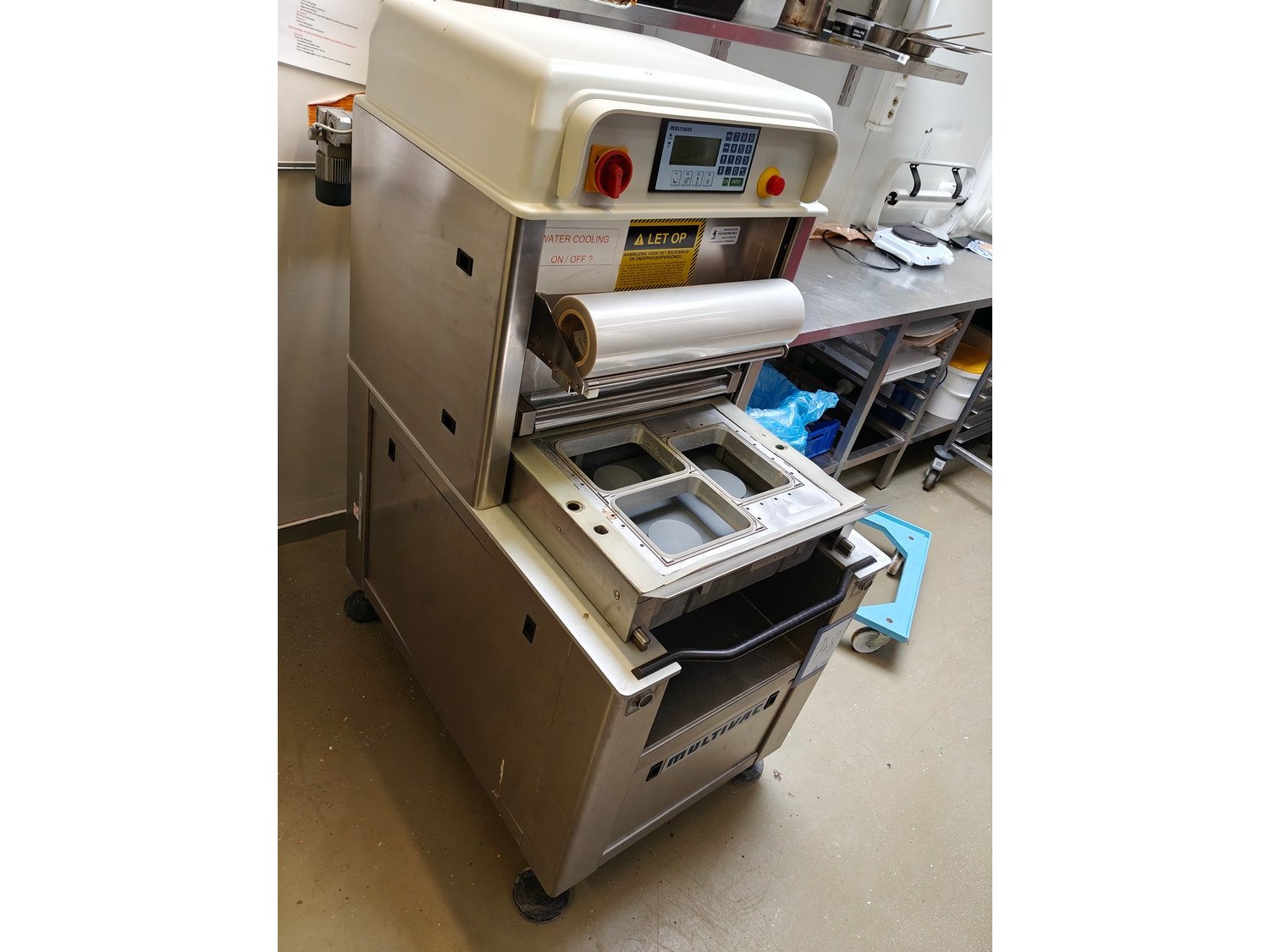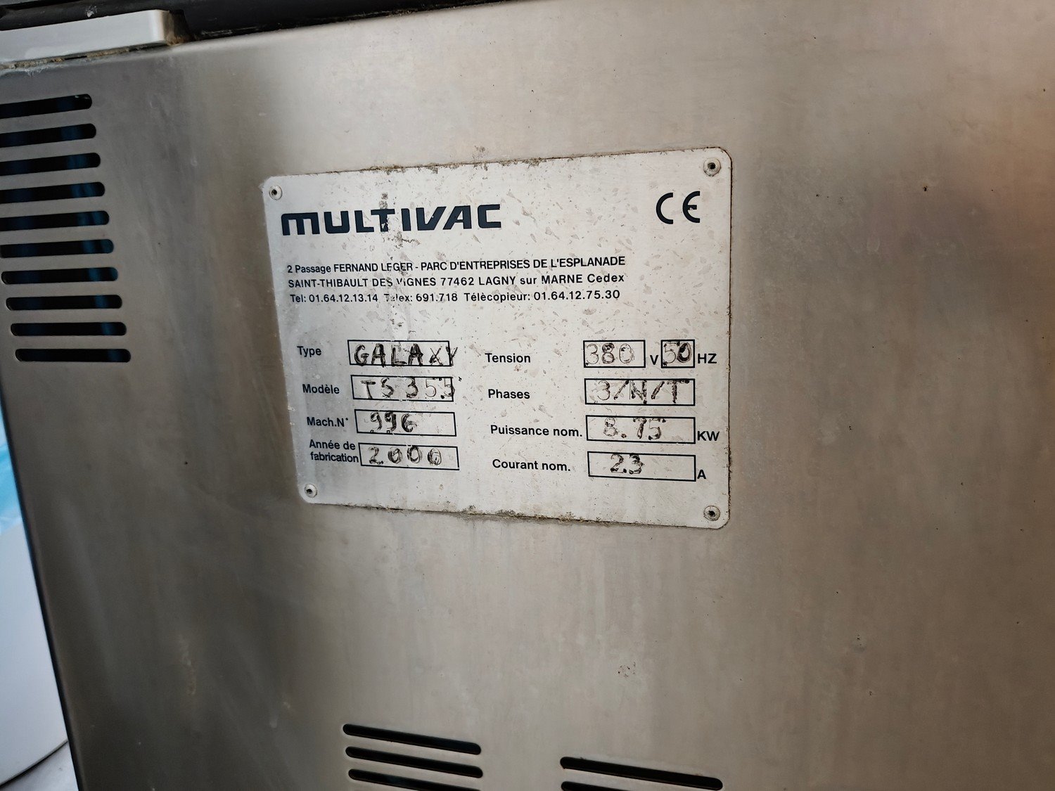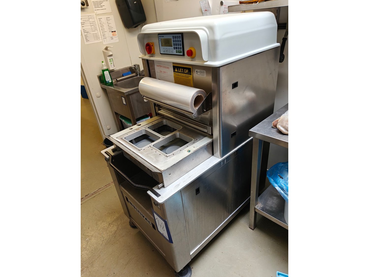 Multivac traysealer, type: Galaxy, model: TS 355, machine number: 996, year of construction: 2000, 380 V, 3 Ph, 50 Hz, 2.3 A, 8.75 kW, film width: 500 mm, dye: (3x) 211 mm x 163 mm, with Busch vacuum pump, type: RA 0063 E 5Z1, 63 m³ per hour, total dimensions: 730 mm x 1250 mm x 1540 mm. Kavel locatie: Ieperstraat 14, 8980 Zonnebeke, België