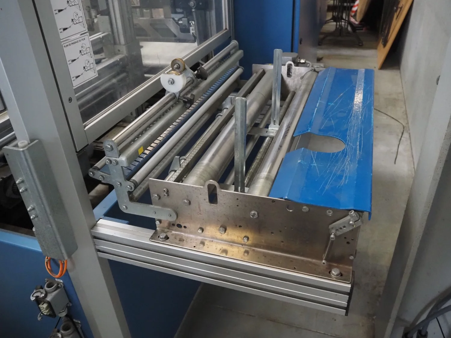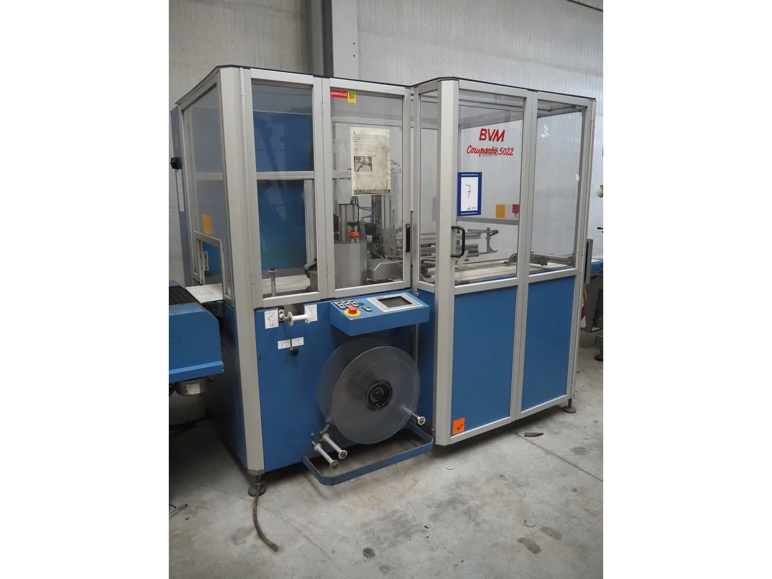 BVM Brunner GmbH u. Co.KG film packaging machine, type: Compacta 5022 EGS, number: 20090641881, year of construction: 2009, 400 V, 3 Ph, 50 Hz, 8 kvA, plastic belt, belt width: 400 mm, knife width: 560 mm, total dimensions: 2600 mm x 1800 mm x 1800 mm.