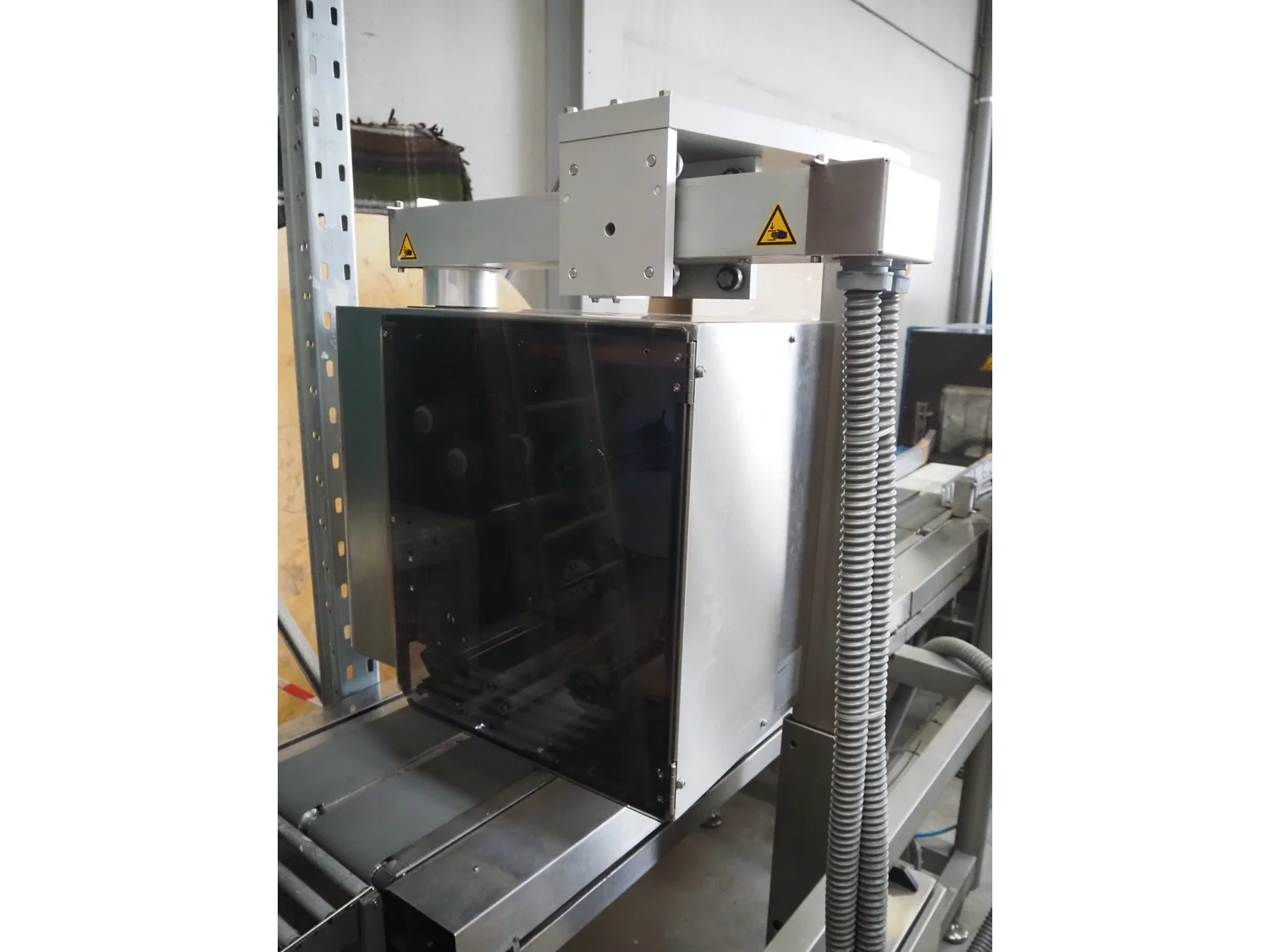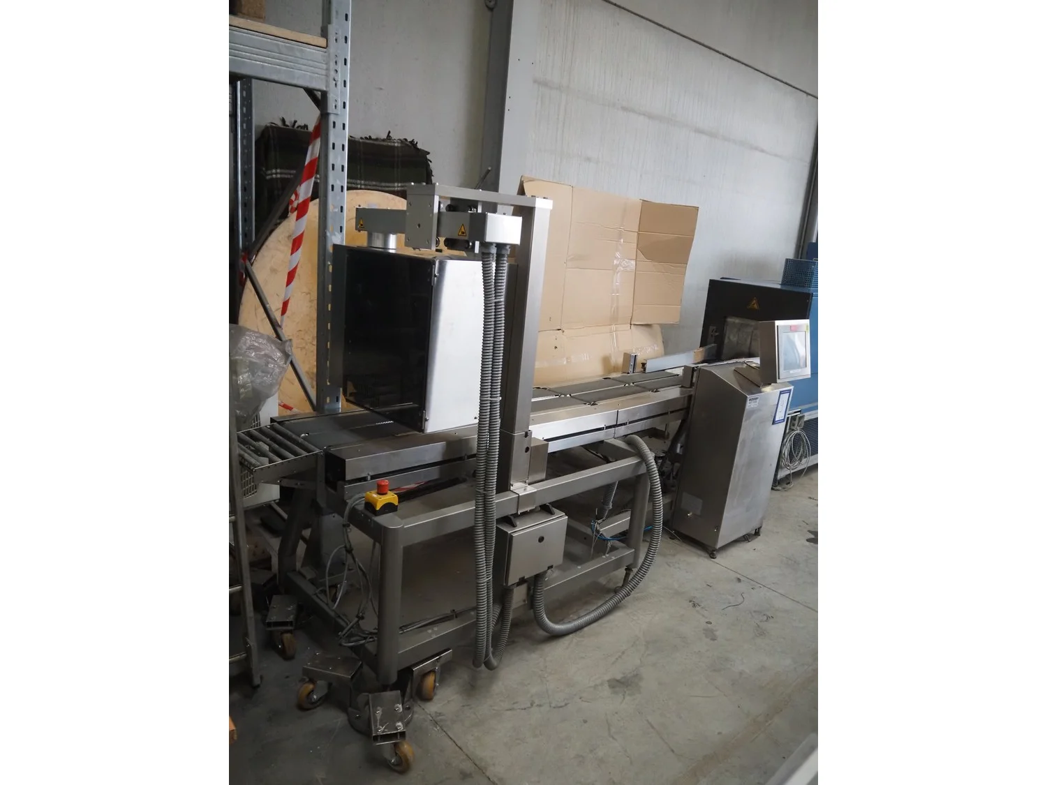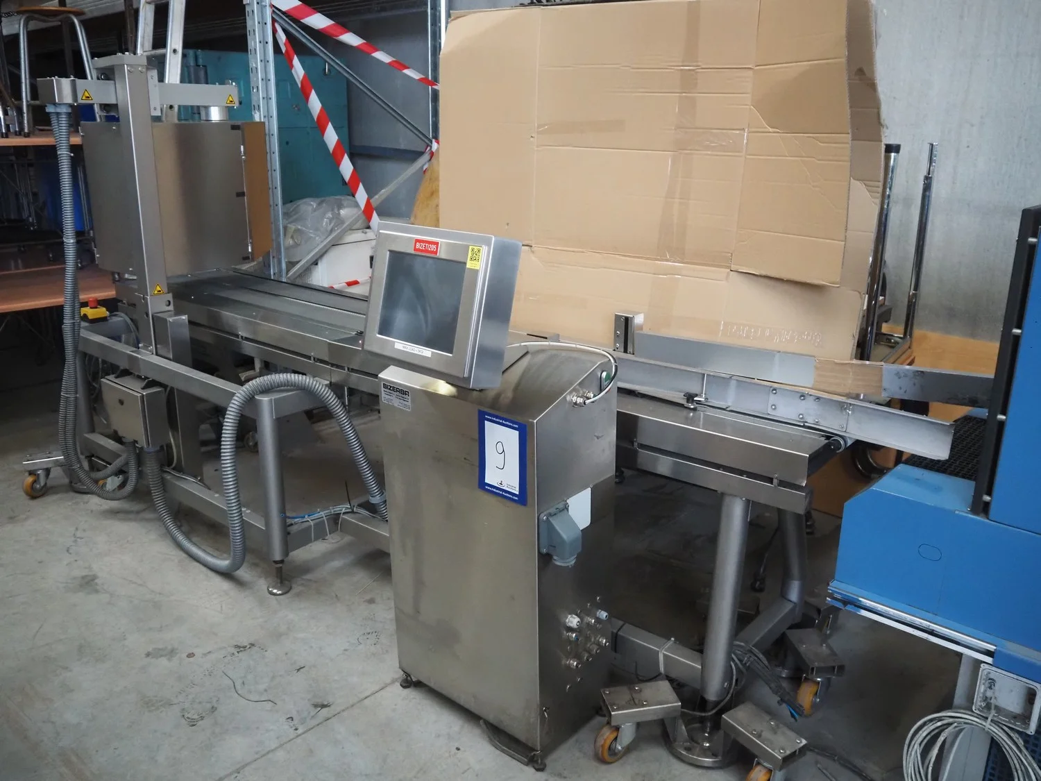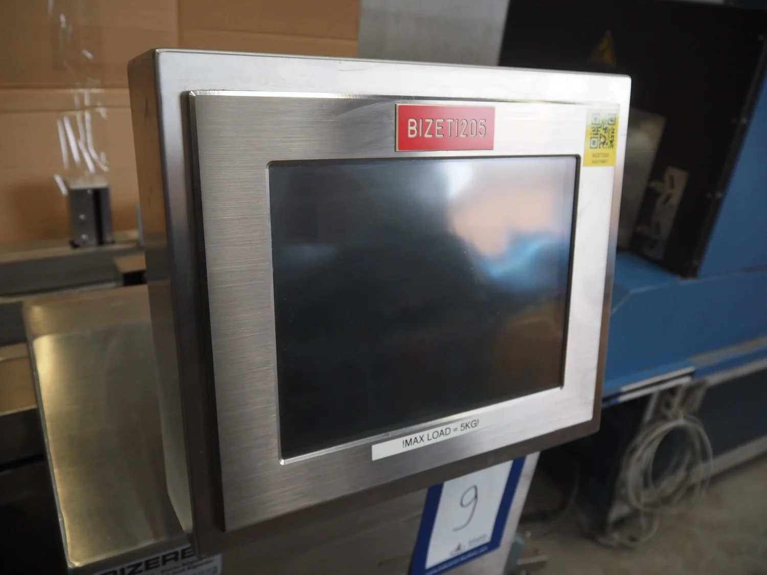 Bizerba checkweigher with labeller, number: 10743142, 230 V, 50 Hz, 2.4 A, plastic belt, belt width: (2x) 135 mm and 30 mm, labeller number: 10743131, total dimensions: 3550 mm x 950 mm x 1750 mm. Without rollies.