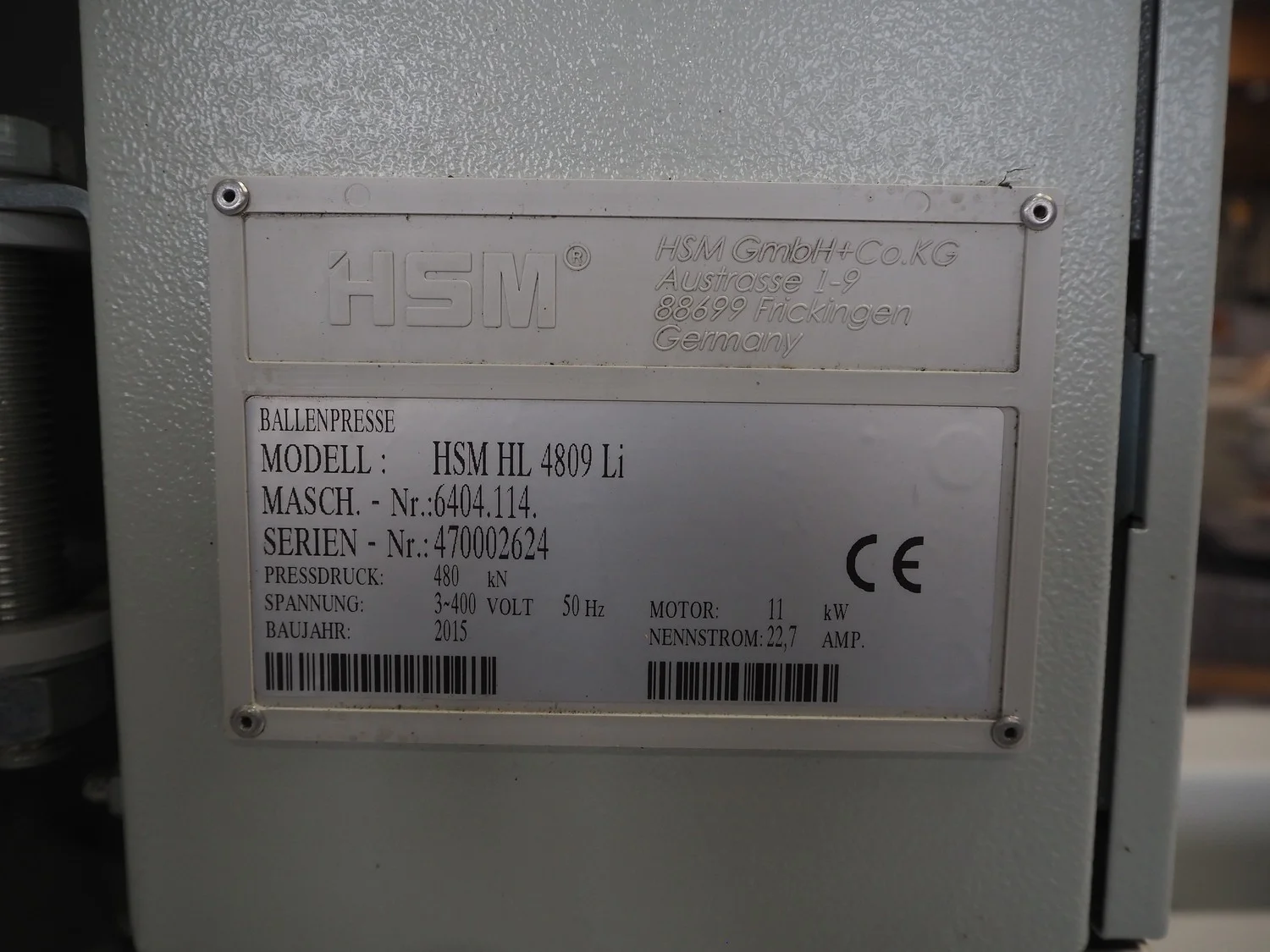 HSM GmbH+Co.KG horizontal bale press, model: HSM HL 4809 Li, number: 6404.114, serial number: 470002624, year of construction: 2015, 400 V, 3 Ph, 50 Hz, 22.7 A, 11 kW, dimensions inside: 1020 mm x 900 mm, total dimensions: 4630 mm x 2150 mm x 2680 mm. Without rollies.
