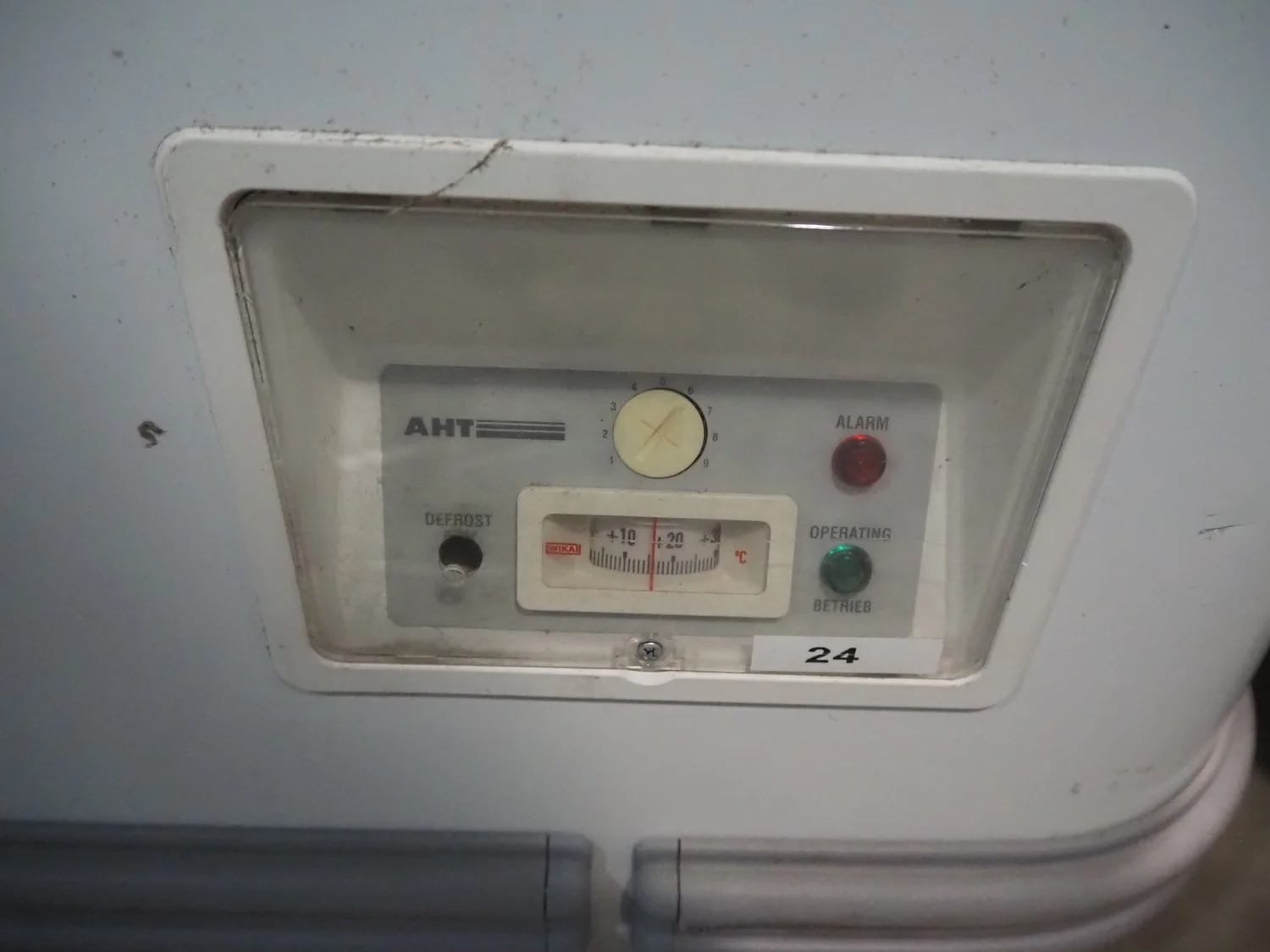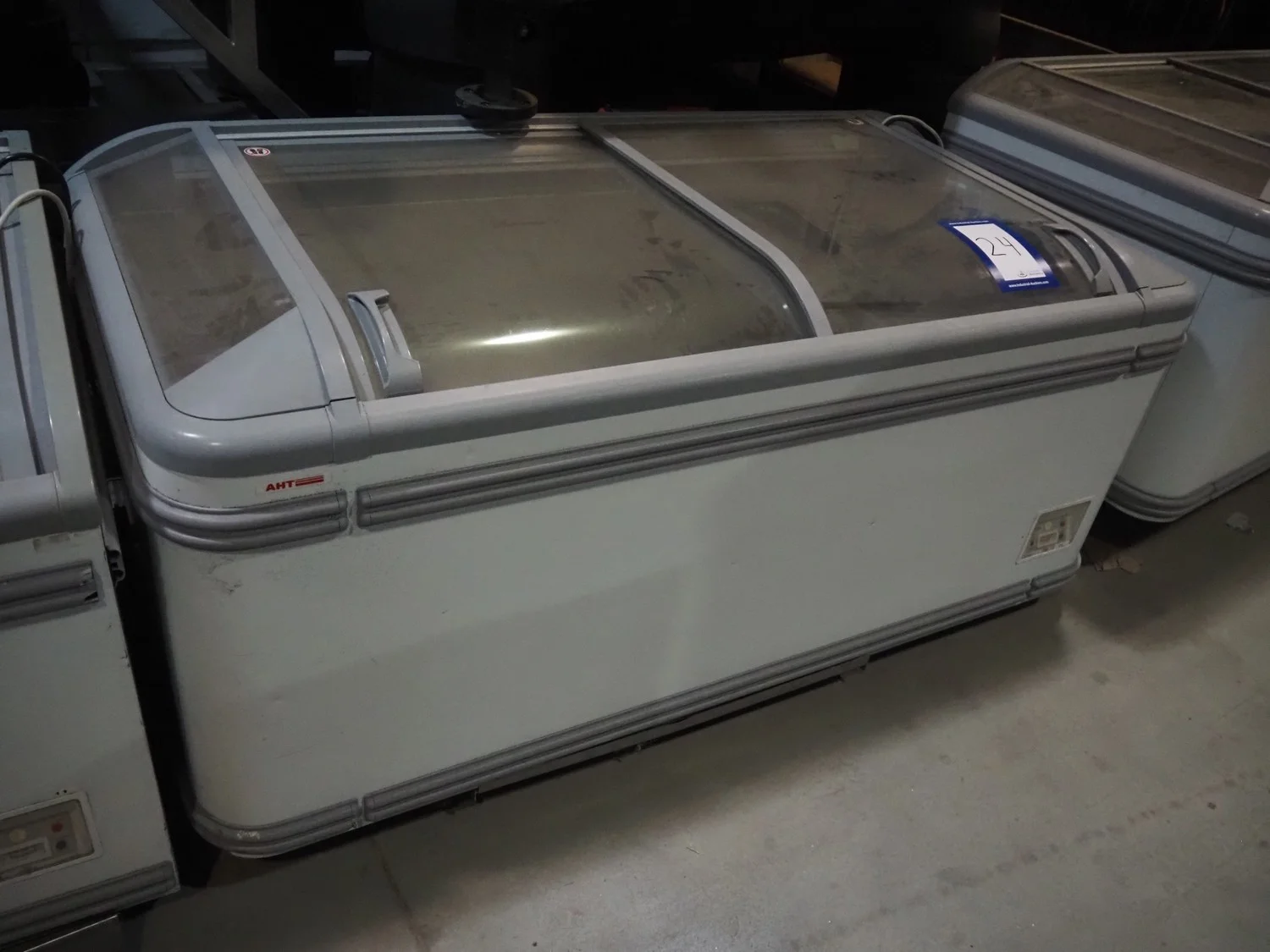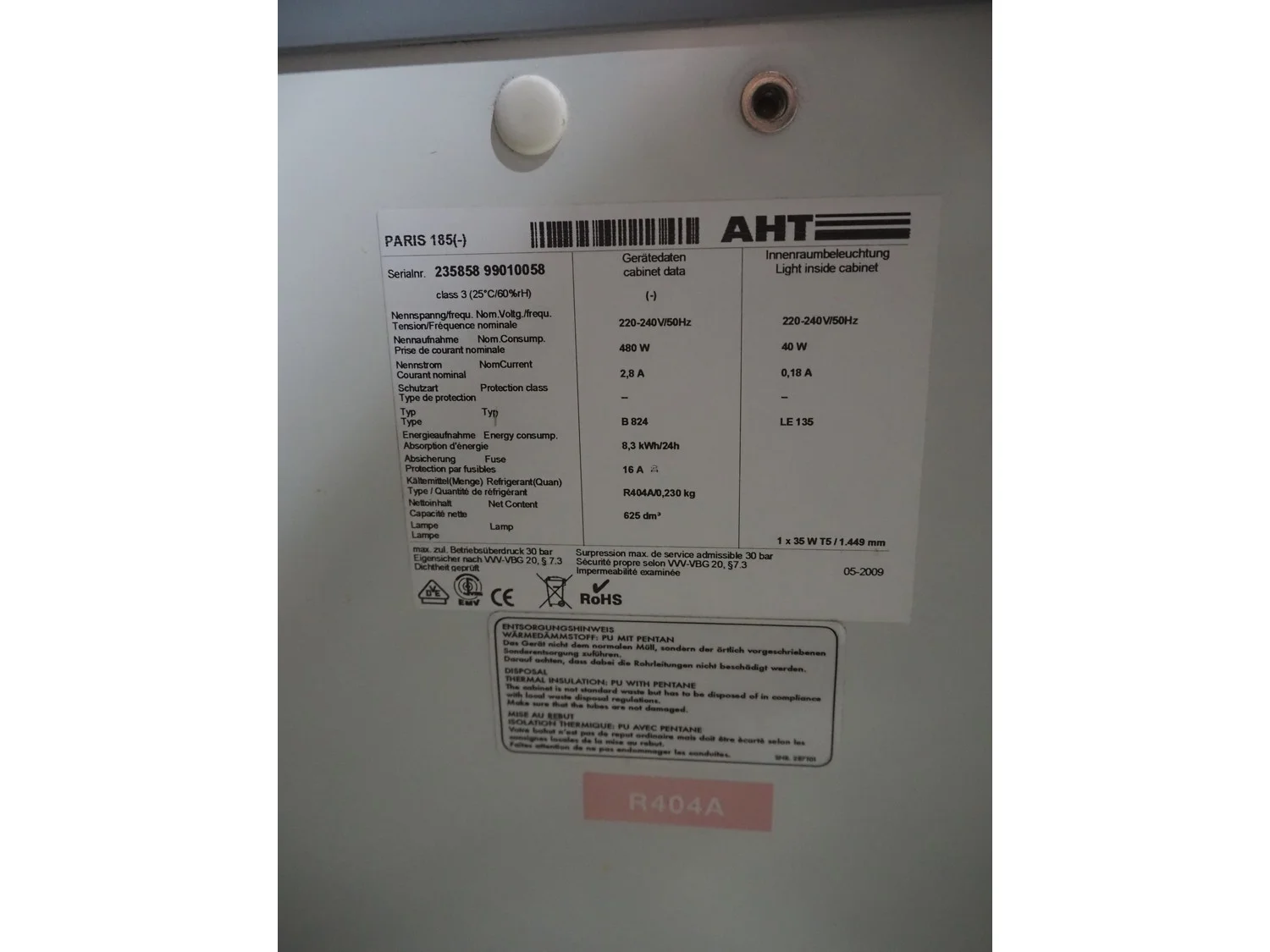 AHT freezer, type: PARIS 185, serail number: 235858 99010058, year of construction: 05/09, 220-240 V, 50 Hz, 2,8 A, 480 W, refrigerant: R404A/0,230 kg, capacity: 625 dm³, total dimensions: 1870 mm x 860 mm x 840 mm.