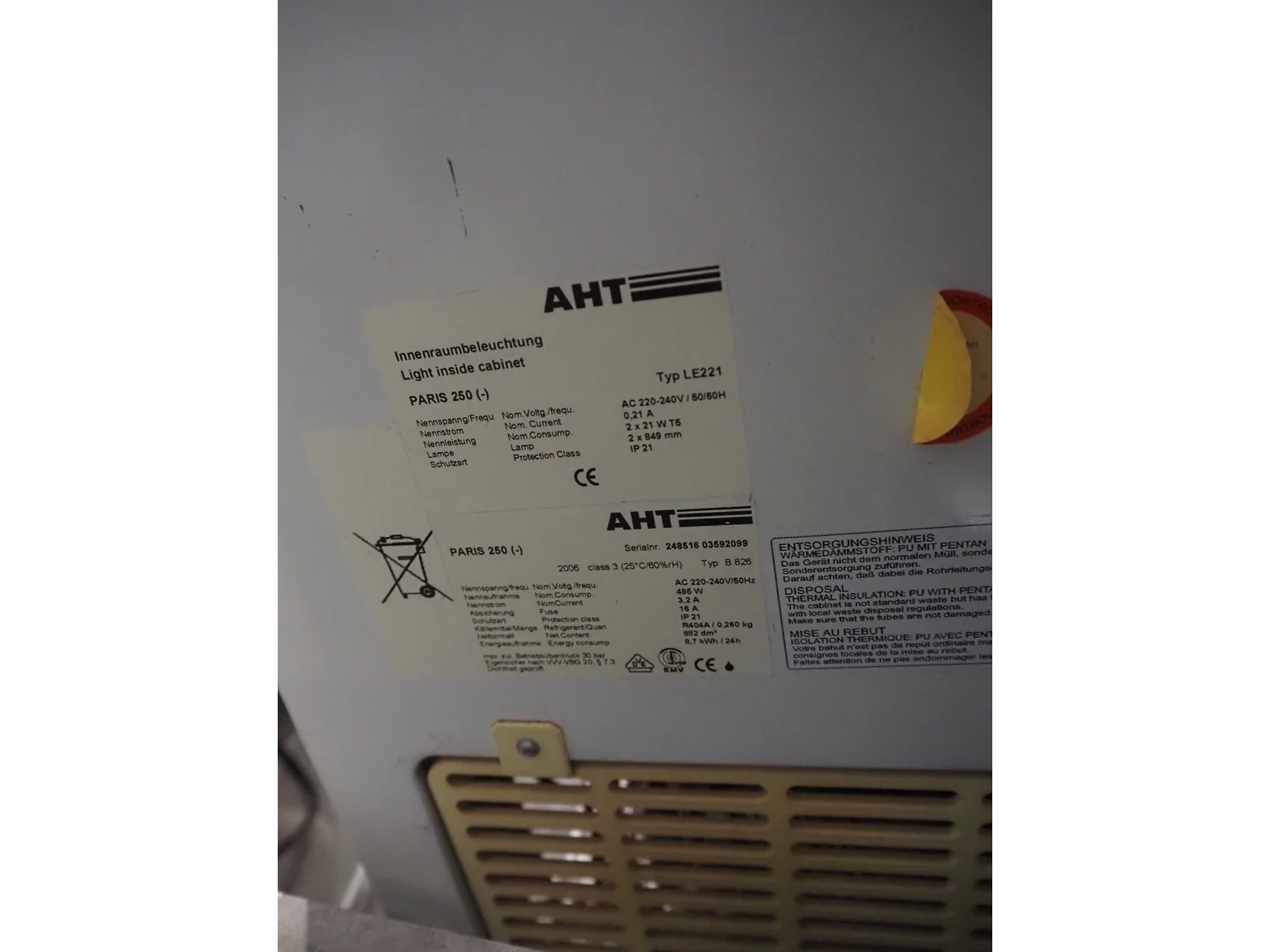 AHT freezer, type: PARIS 250, serial number: 248516 03592099, year of construction: 2006, 220-240 V, 50 Hz, 3,2 A, 495 W, refrigerant: R404/0,260 kg, capacity: 882 dm³, total dimensions: 2500 mm x 870 mm x 800 mm.