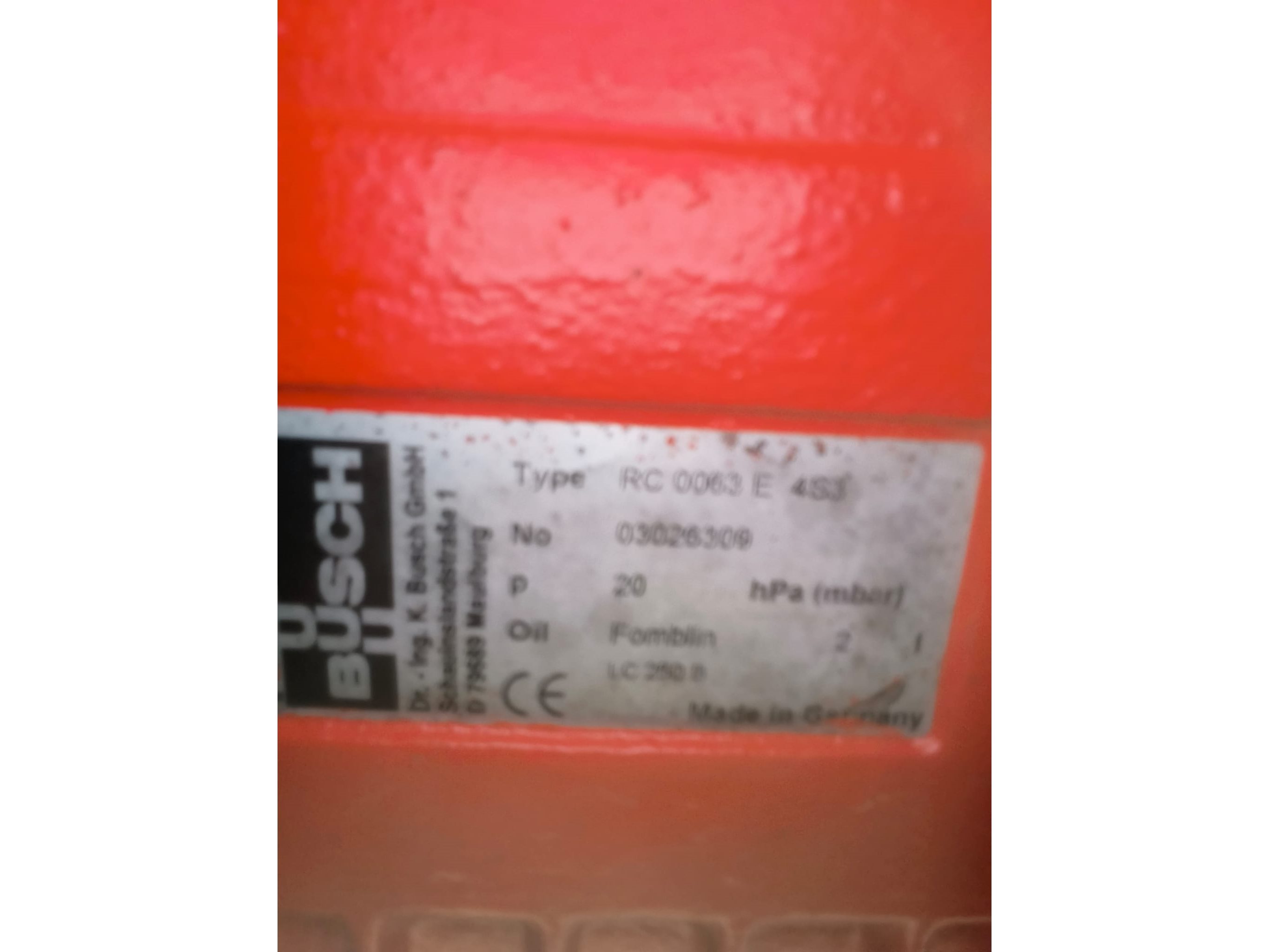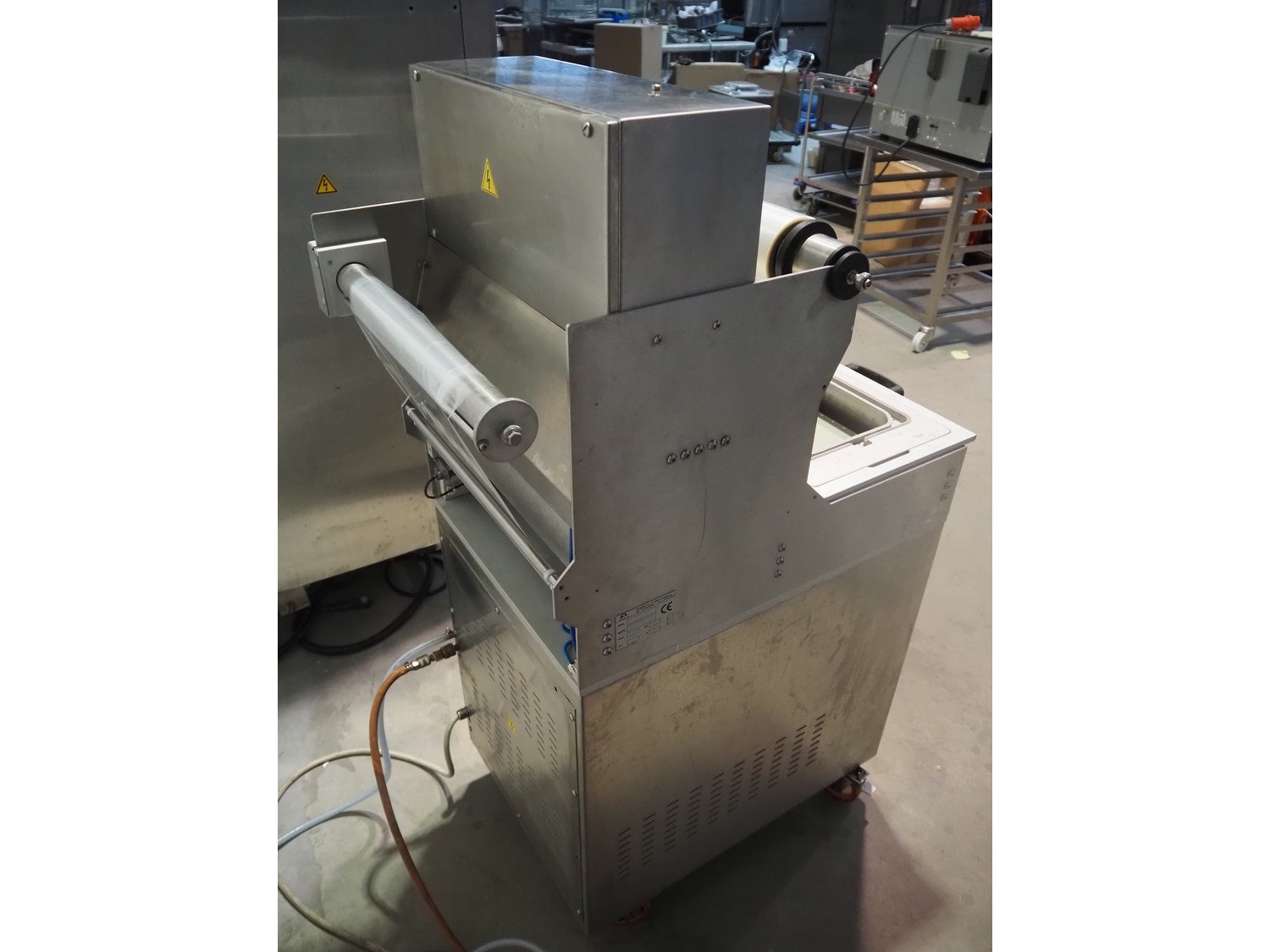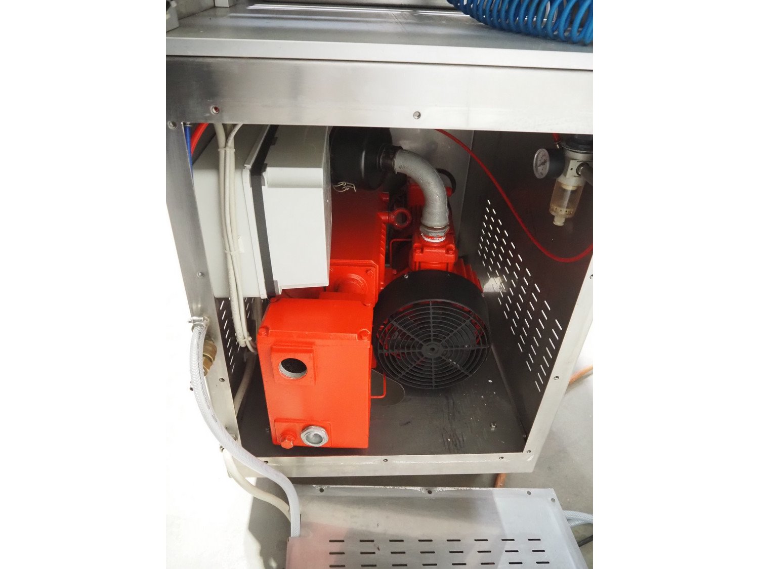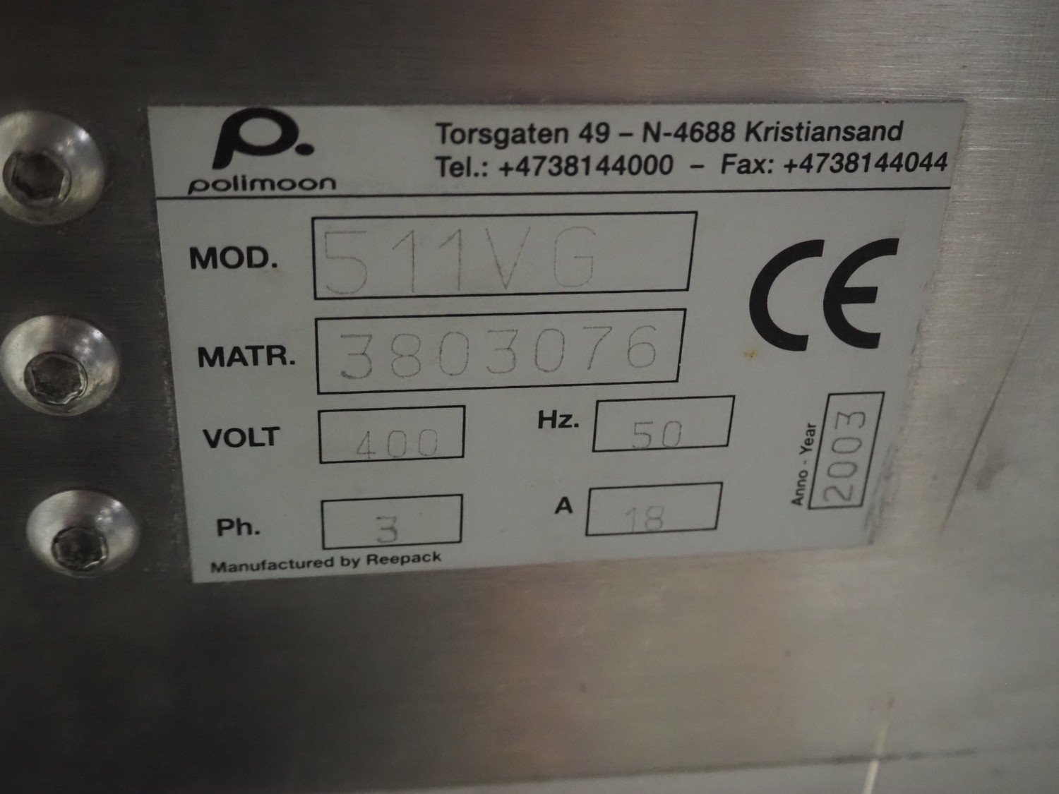 Reepack mobile tray sealer, model: 511VG, number: 3803076, year of construction: 2003, 400 V, 3 Ph, 50 Hz, 18 A, dye: 320 mm x 255 mm, film width: 360 mm, with Busch oxygen vacuum pump, type: RC 0063 E 453, number: 03026309, capacity: 63 m ³ per hour, total dimensions: 950 mm x 600 mm x 1540 mm. Including 3 boxes with plastic trays, model trays: 1/2 GN 100 WH CMH 950 CTN.