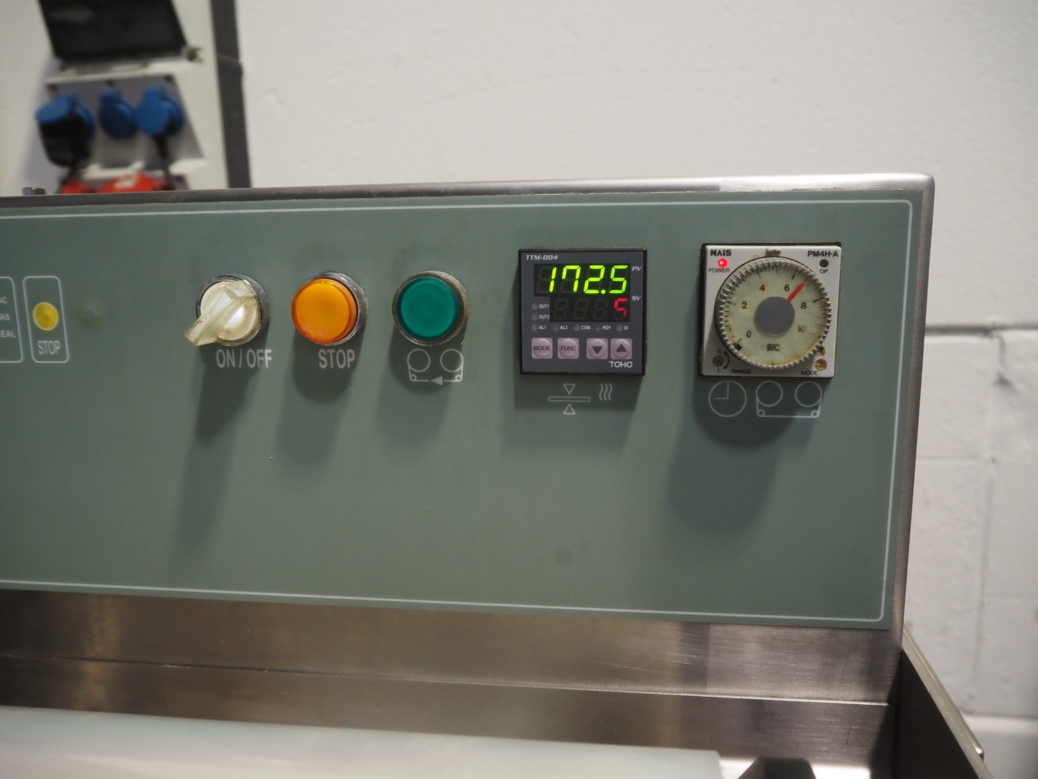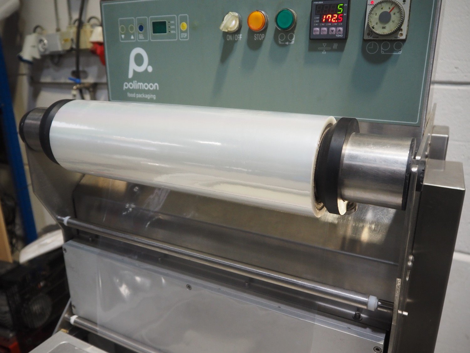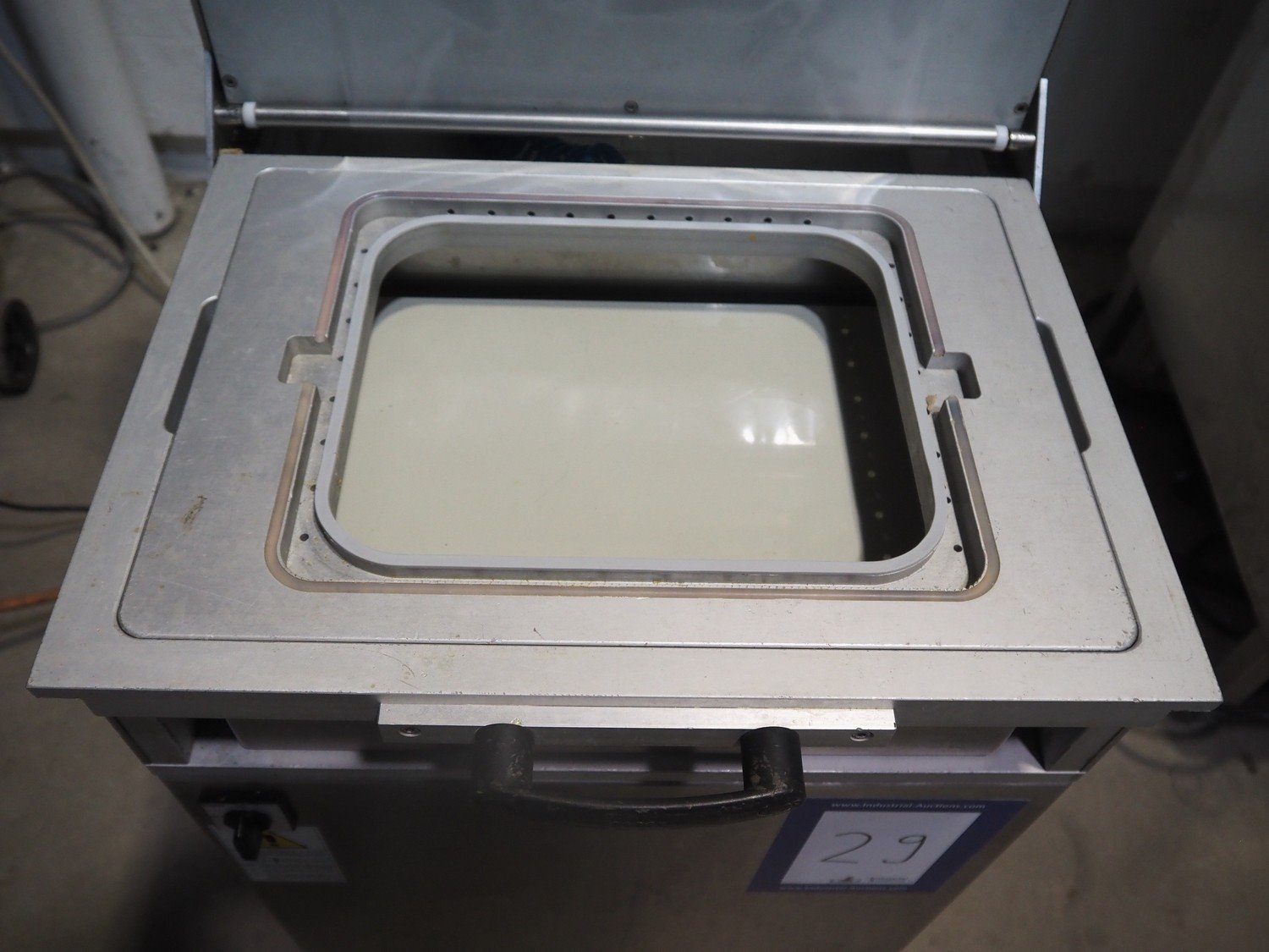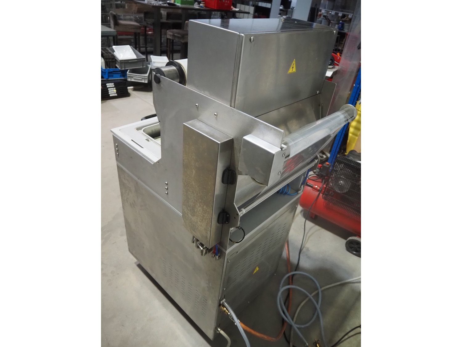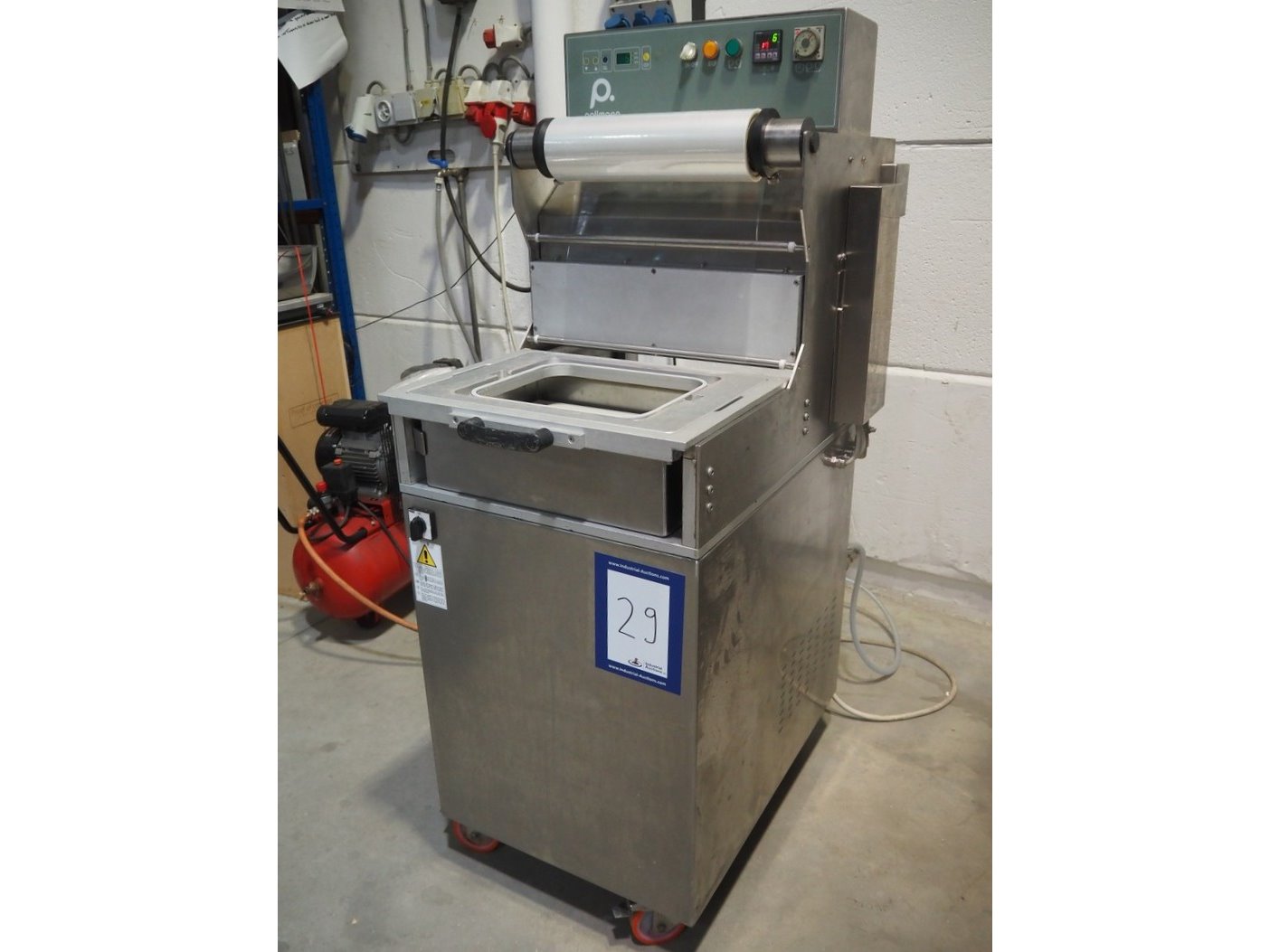 Reepack mobile tray sealer, model: 511VG, number: 3803076, year of construction: 2003, 400 V, 3 Ph, 50 Hz, 18 A, dye: 320 mm x 255 mm, film width: 360 mm, with Busch oxygen vacuum pump, type: RC 0063 E 453, number: 03026309, capacity: 63 m ³ per hour, total dimensions: 950 mm x 600 mm x 1540 mm. Including 3 boxes with plastic trays, model trays: 1/2 GN 100 WH CMH 950 CTN.