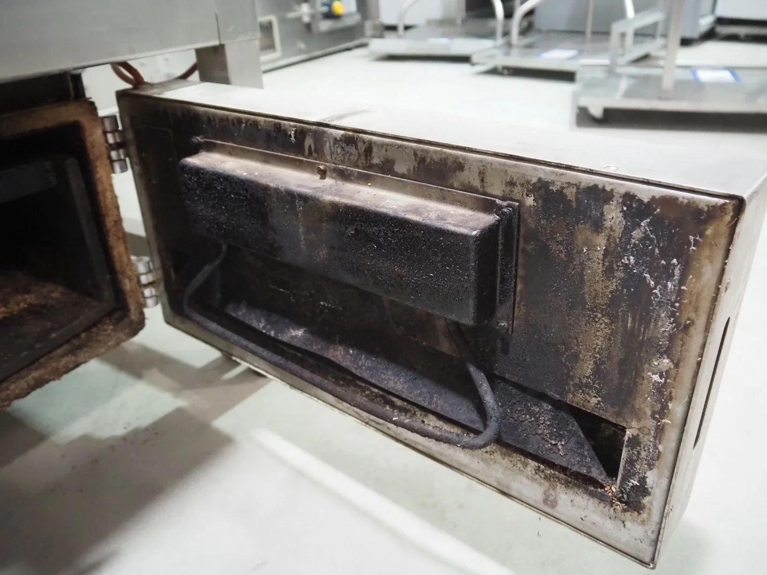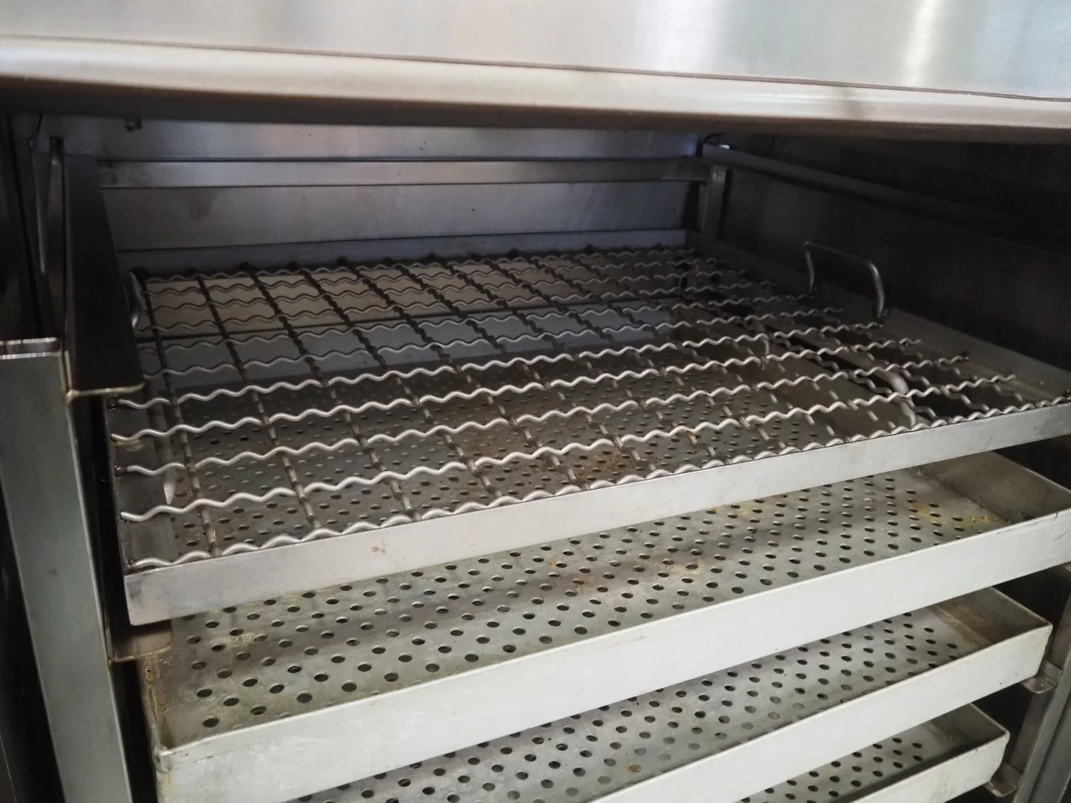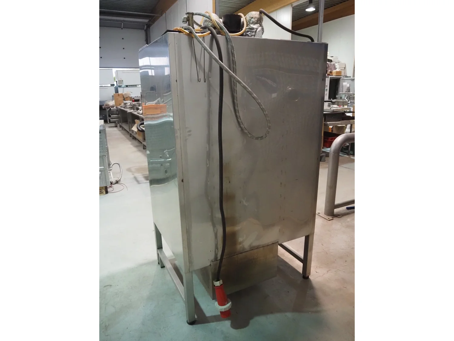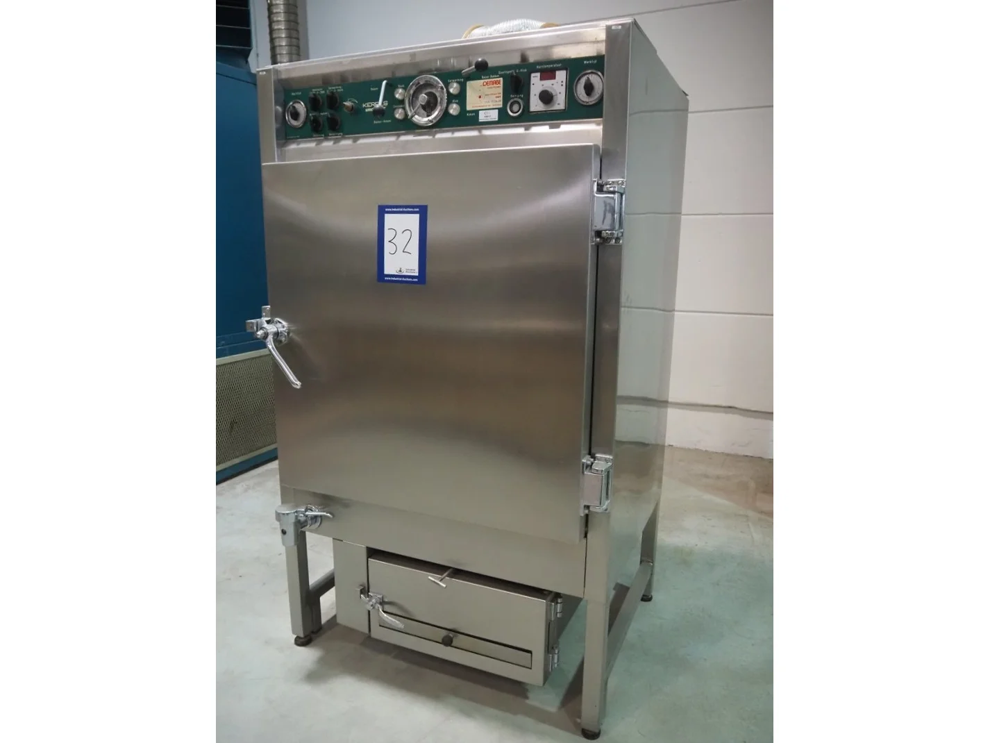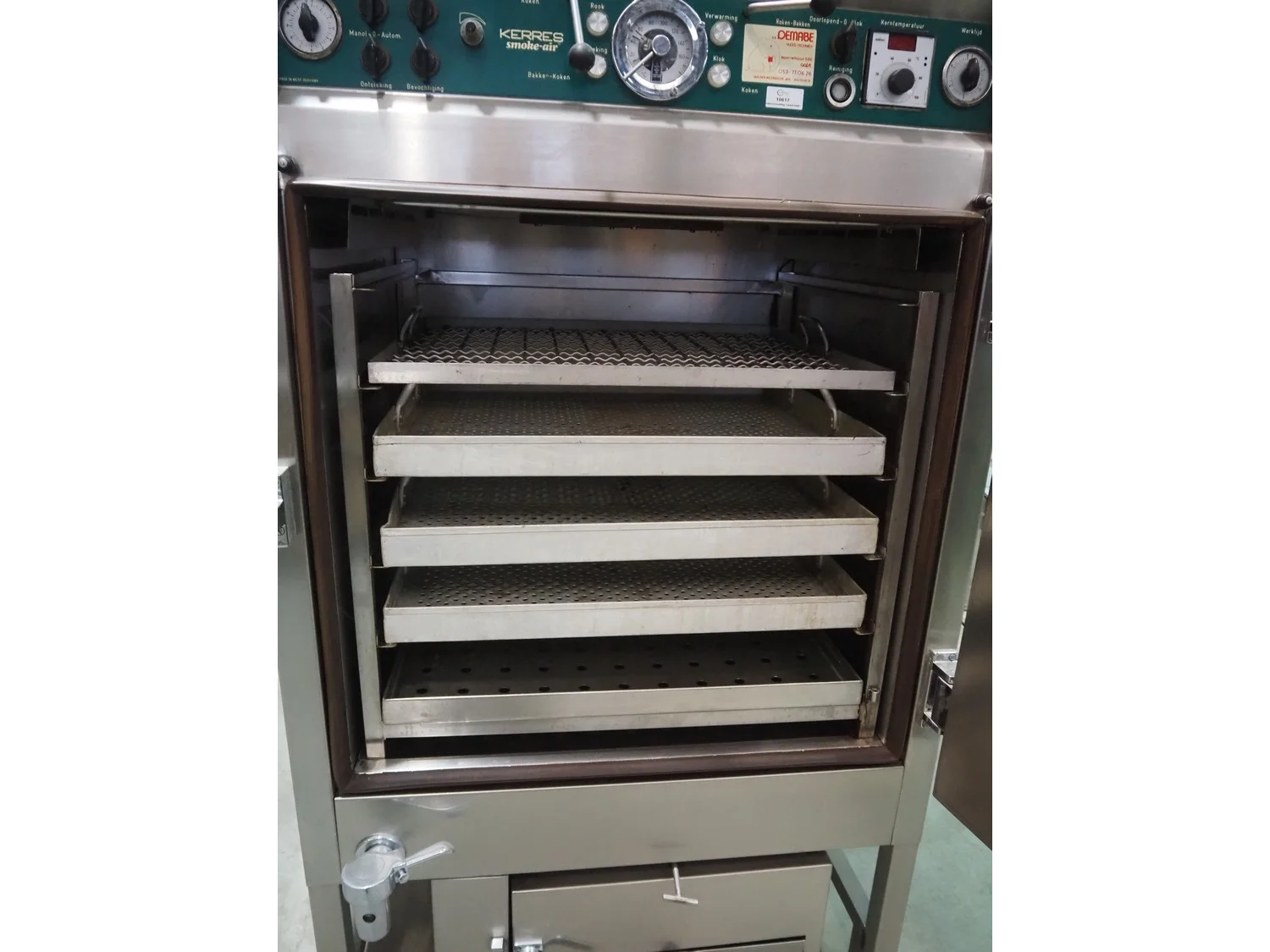 Kerres smoking, cooking and frying chamber with smoke generator for wood chips, type: 0S 700 o1, serial number: 09.0323, year of construction: 09.89, 380 V, 50 Hz, 6 floors, dimensions floor: (6x) 700 mm x 800 mm, total dimensions: 1060 mm x 920 mm x 1800 mm.