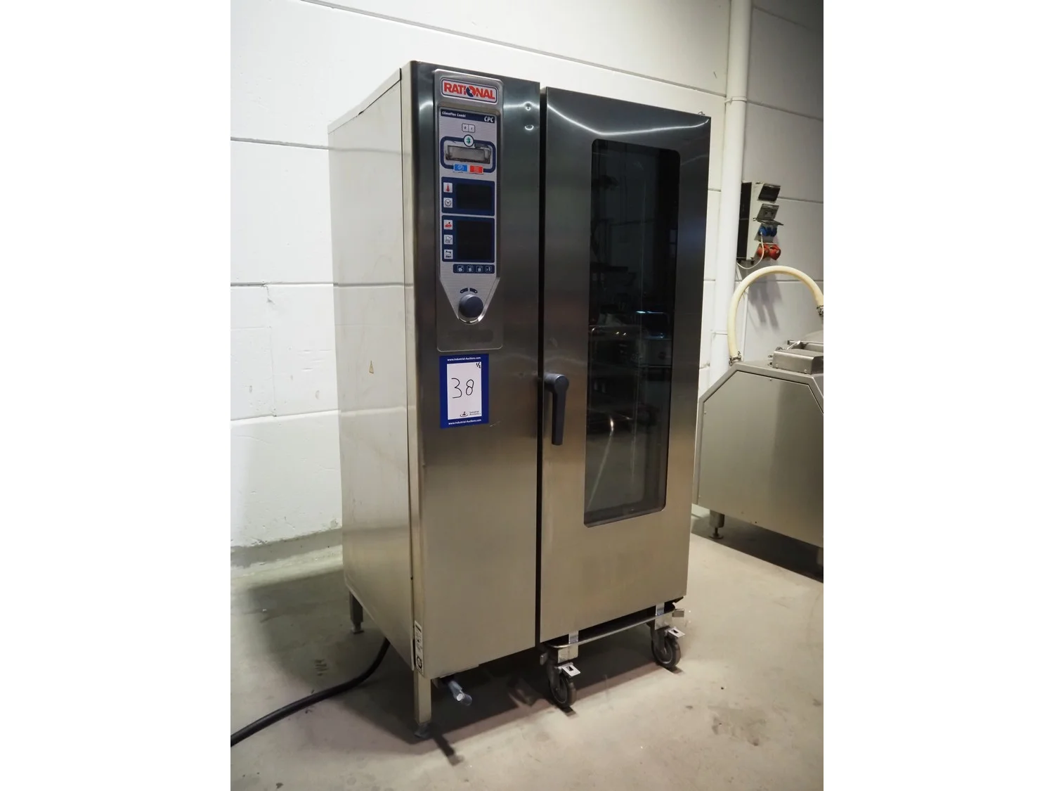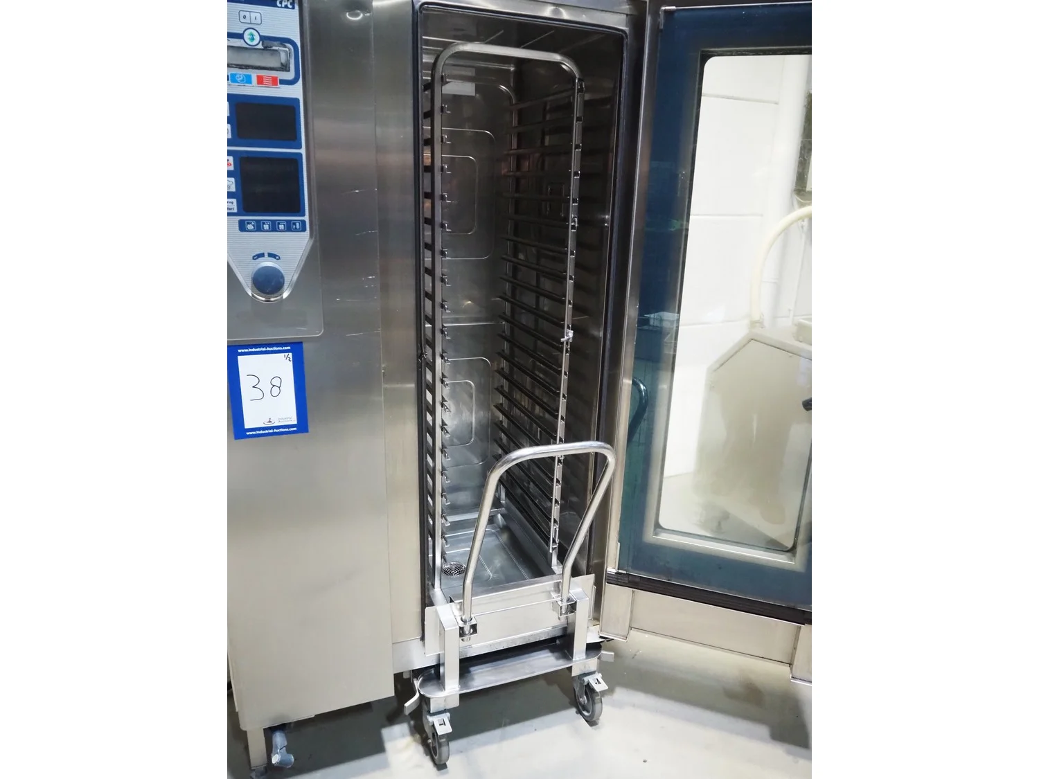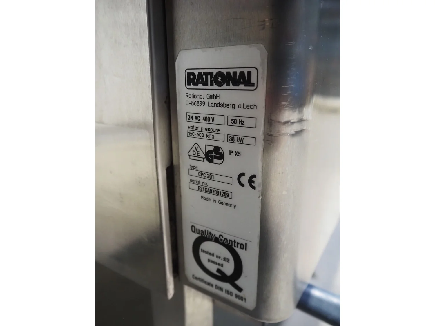 Rational combi steamer, type: CPC 201, serial number: E21CA97091209, 400 V, 3 Ph, 50 Hz, 38 kW, electric heated, with s/s trolley, 20 floors, dimensions each floor: 530 mm x 325 mm, total dimensions: 900 mm x 500 mm x 1800 mm.