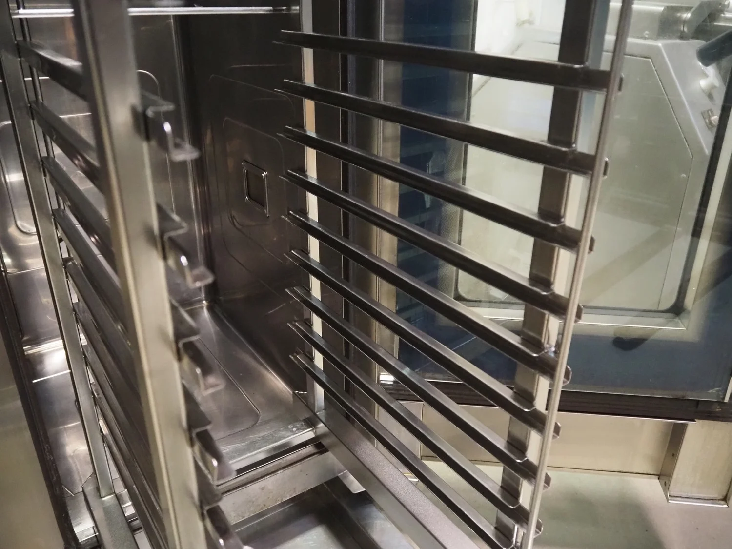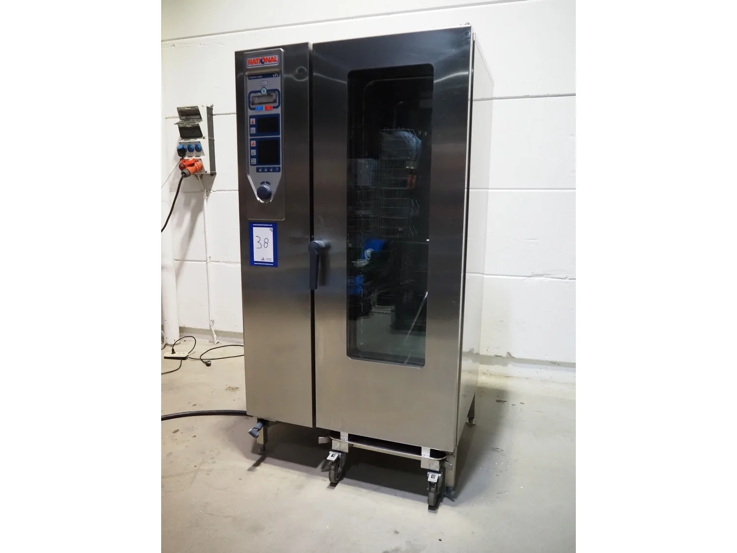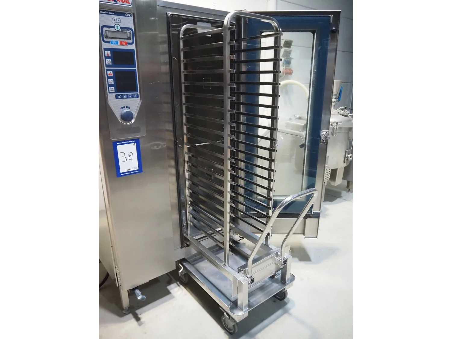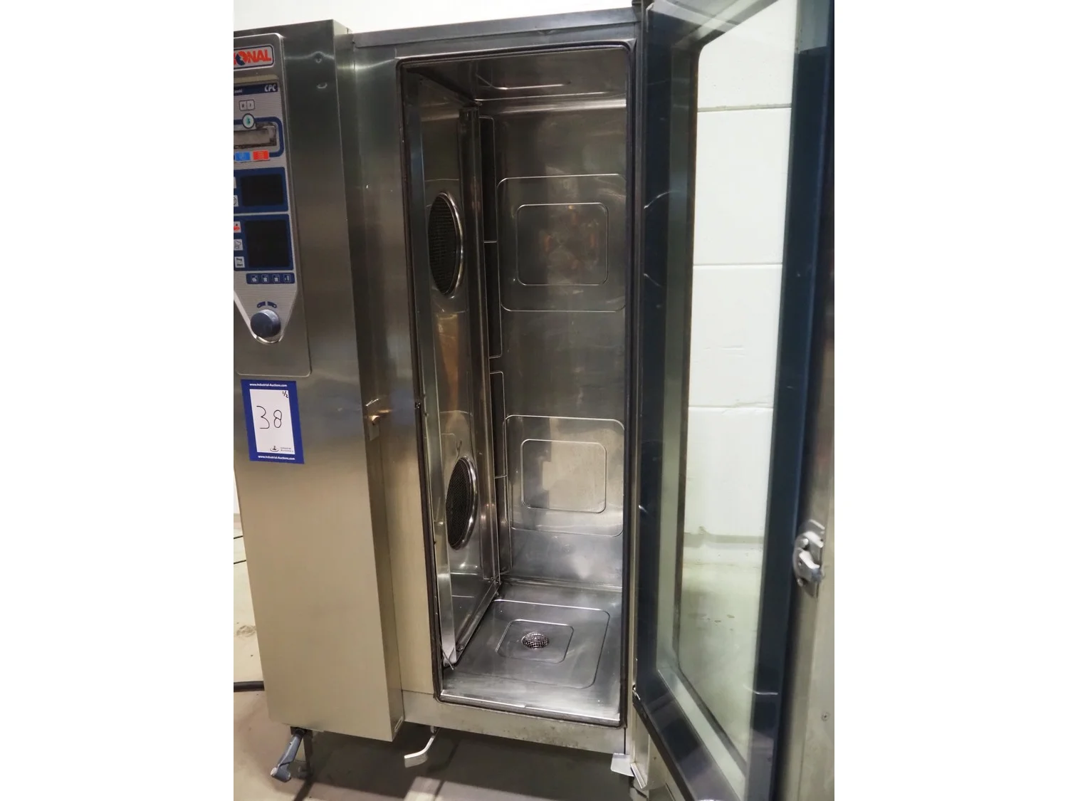 Rational combi steamer, type: CPC 201, serial number: E21CA97091209, 400 V, 3 Ph, 50 Hz, 38 kW, electric heated, with s/s trolley, 20 floors, dimensions each floor: 530 mm x 325 mm, total dimensions: 900 mm x 500 mm x 1800 mm.