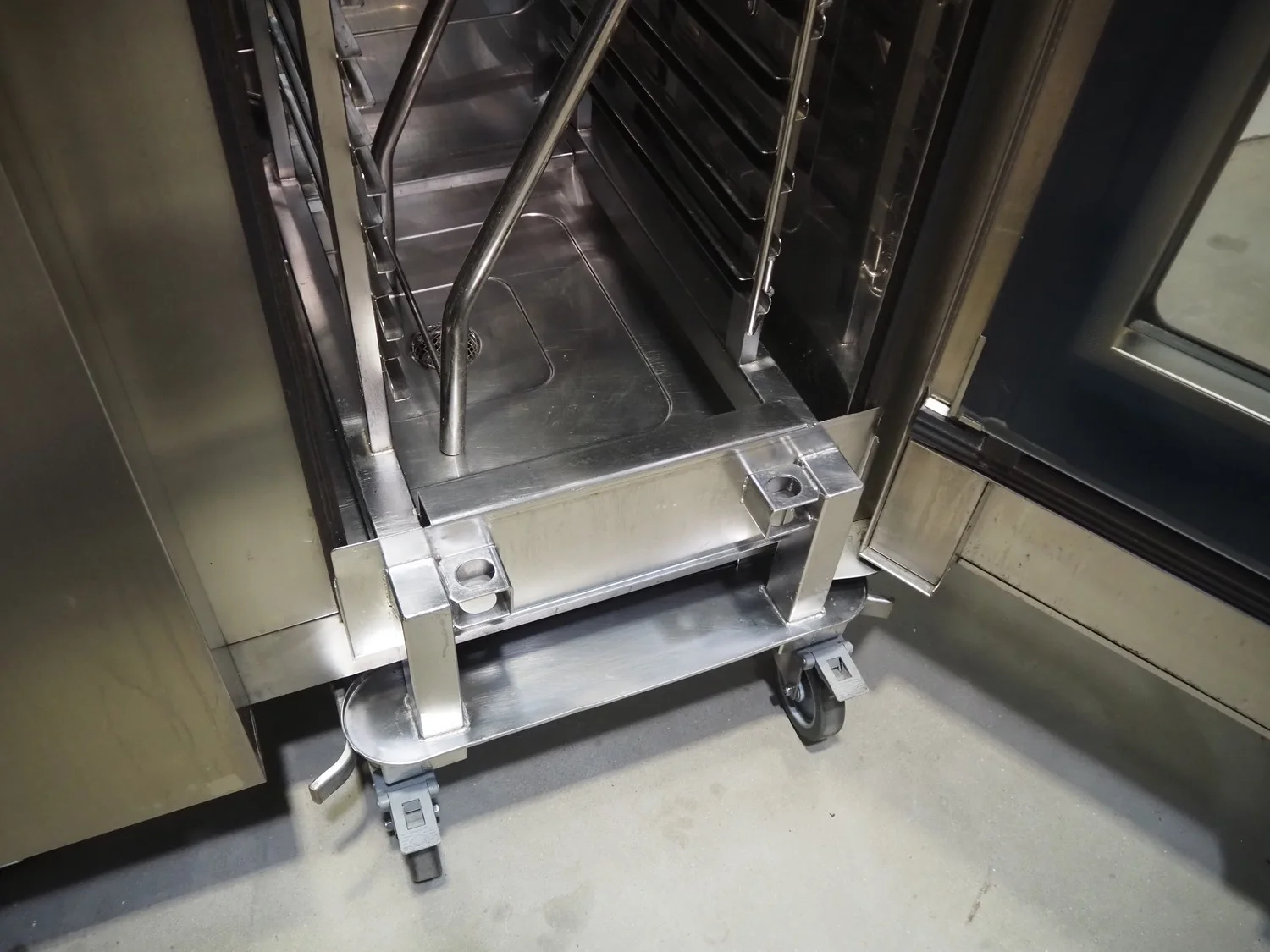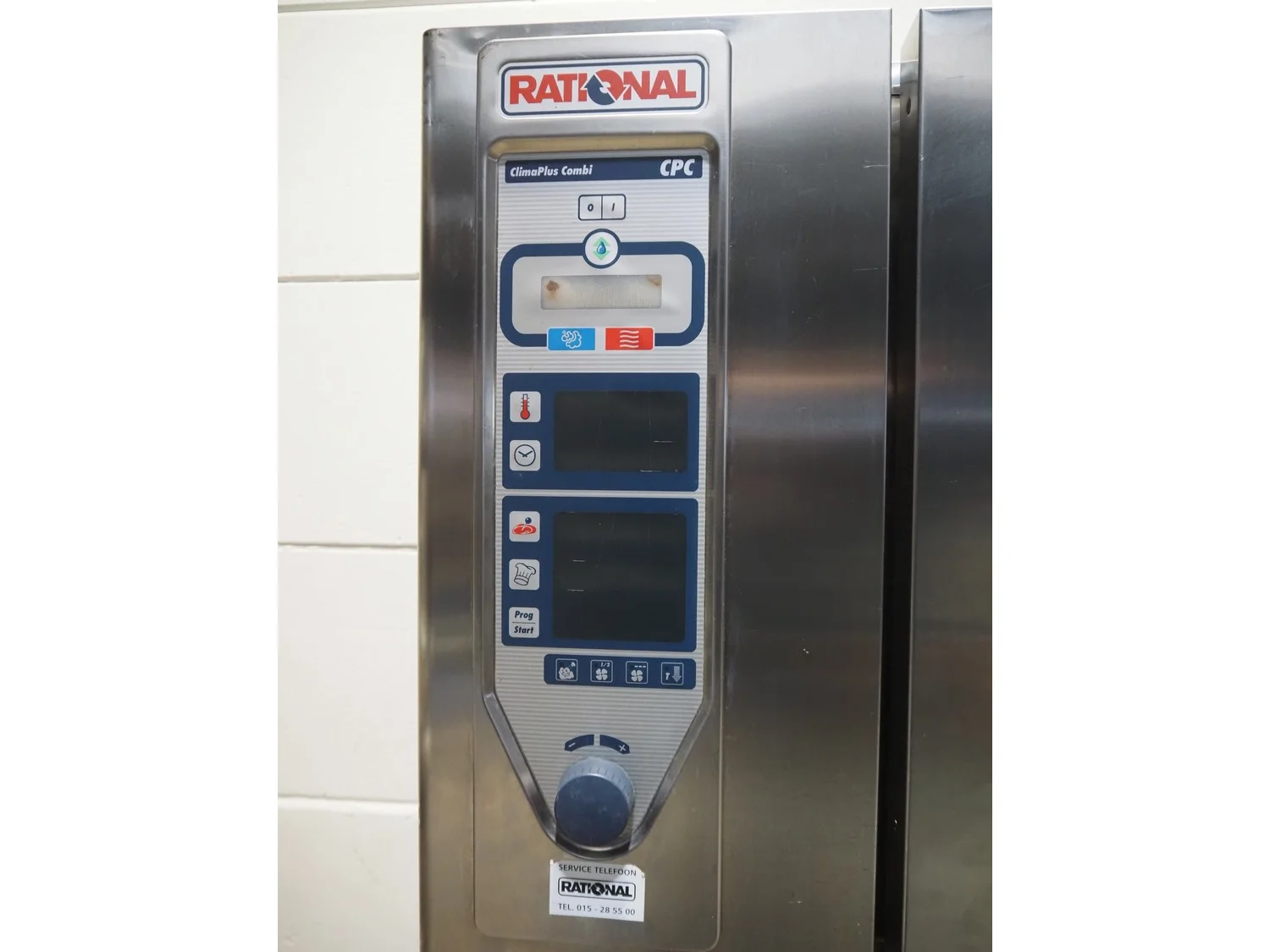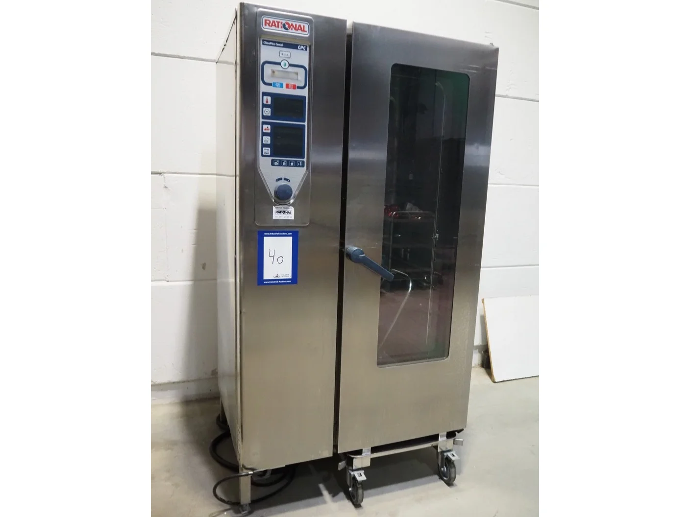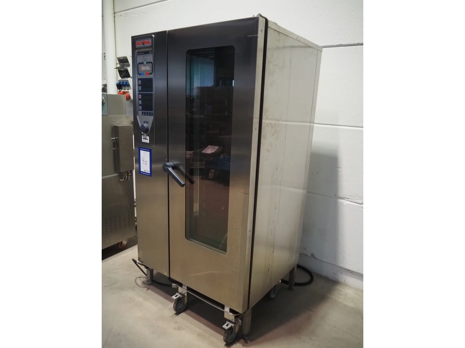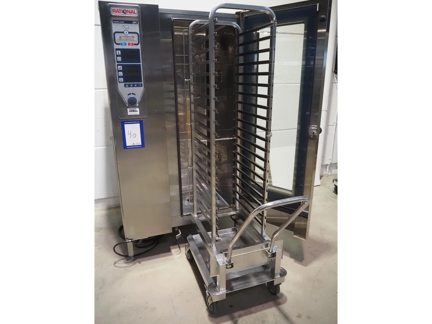 Rational combi steamer, type: CPC 201, serial number: E21CA98121854, 400 V, 3 Ph, 50 Hz, 38 kW, electric heated, with s/s trolley, 20 floors, dimensions each floor: 530 mm x 325 mm, total dimensions: 900 mm x 500 mm x 1800 mm.