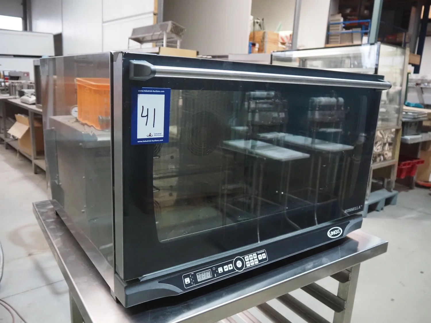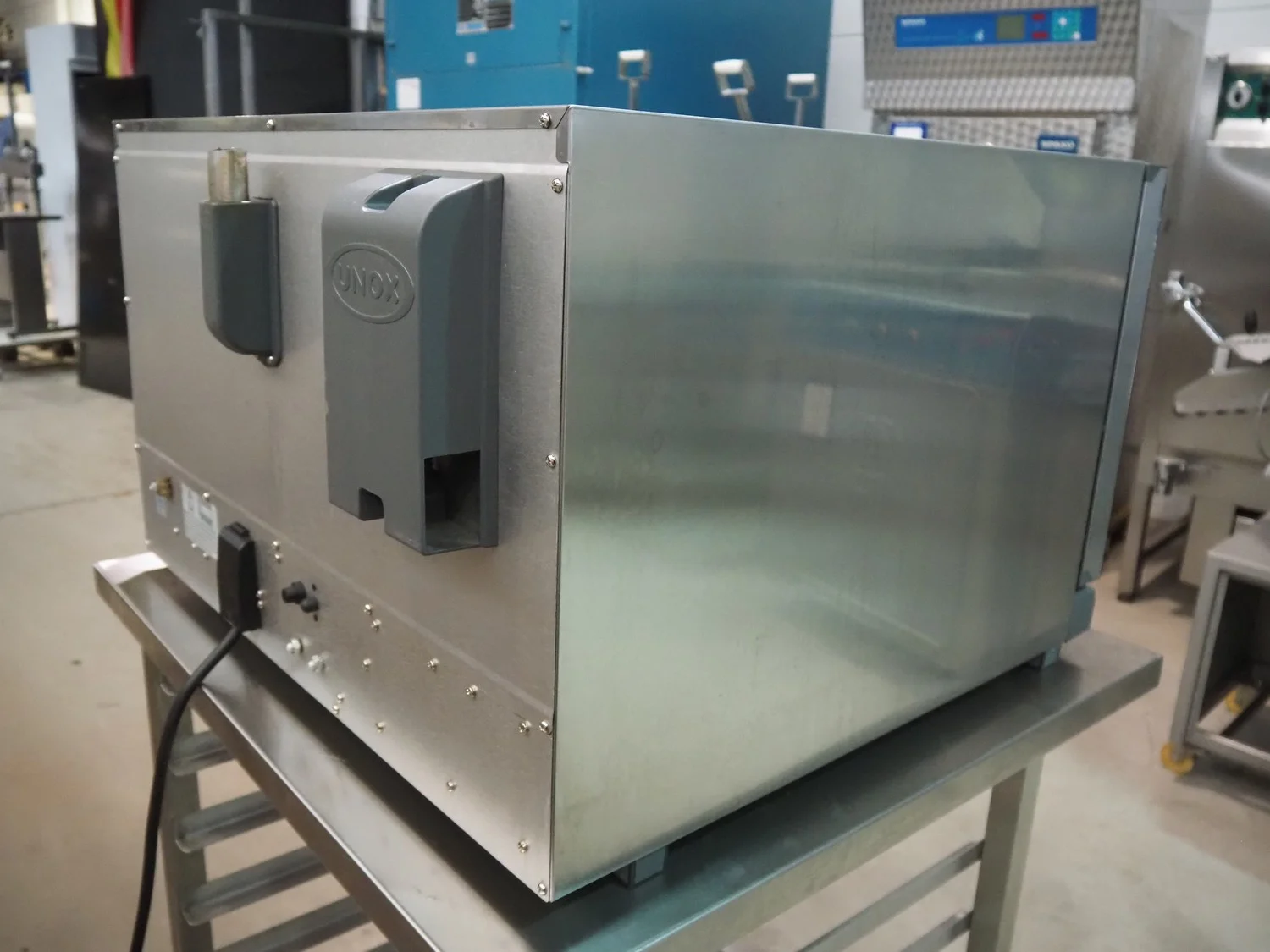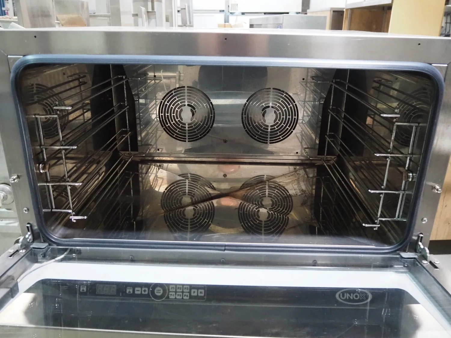 Unox hot air oven, model: XFT190, number: 2016B0017585, 220/240 V, 1/3 Ph, 50/60 Hz, weight: 61 kg, 4 floors, dimensions each floor: 605 mm x 370 mm, total dimensions: 830 mm x 800 mm x 510 mm.