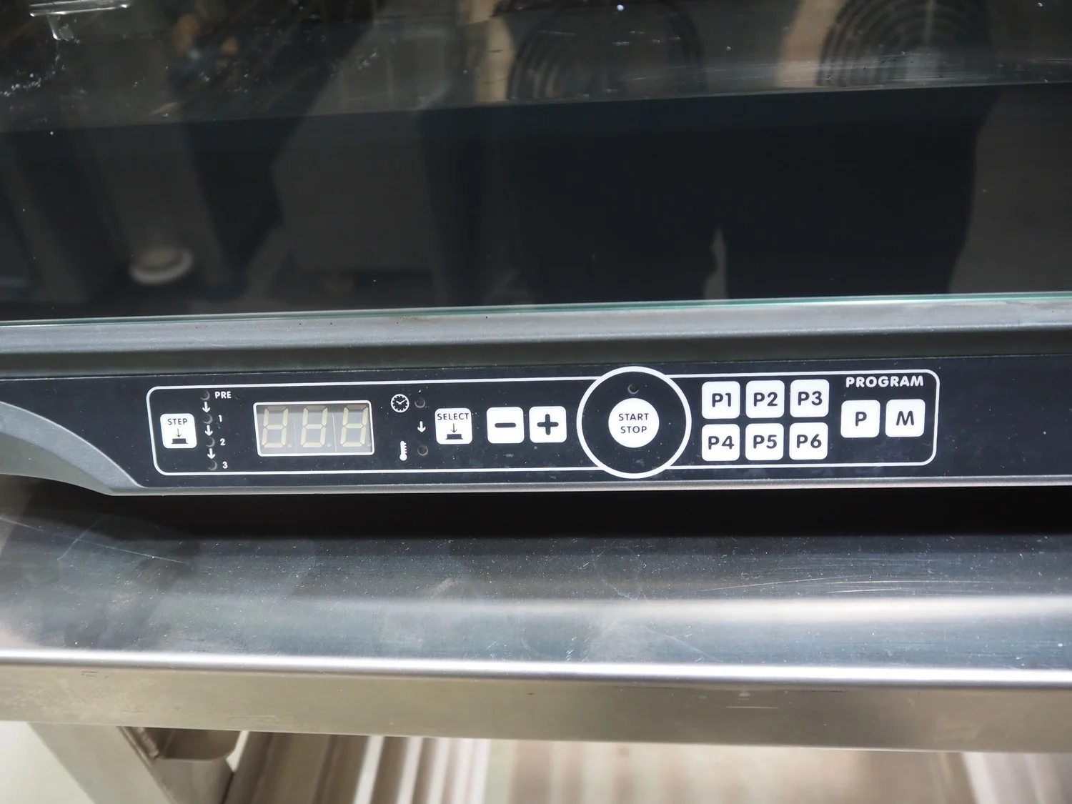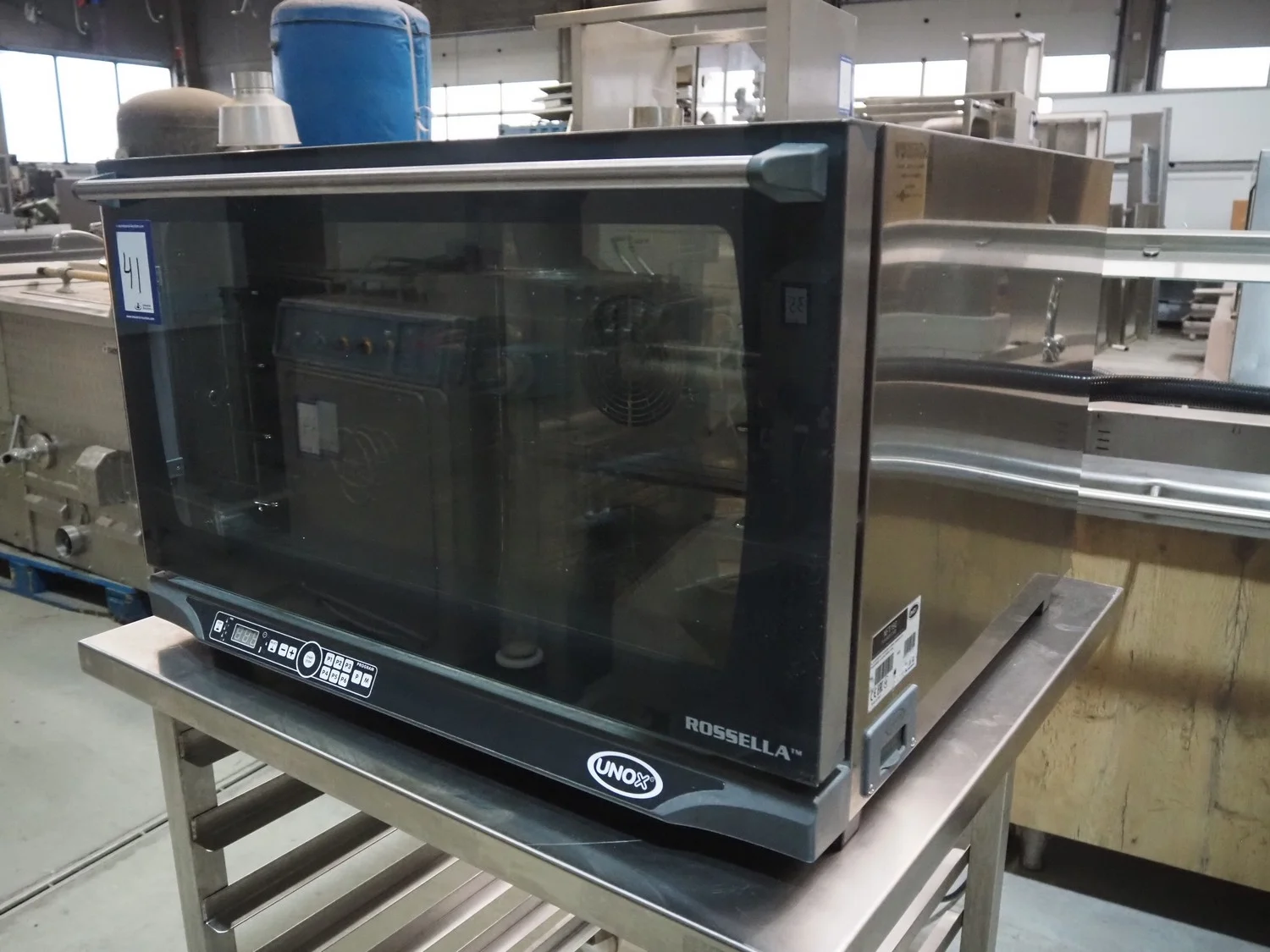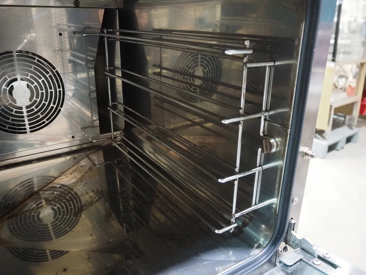 Unox hot air oven, model: XFT190, number: 2016B0017585, 220/240 V, 1/3 Ph, 50/60 Hz, weight: 61 kg, 4 floors, dimensions each floor: 605 mm x 370 mm, total dimensions: 830 mm x 800 mm x 510 mm.