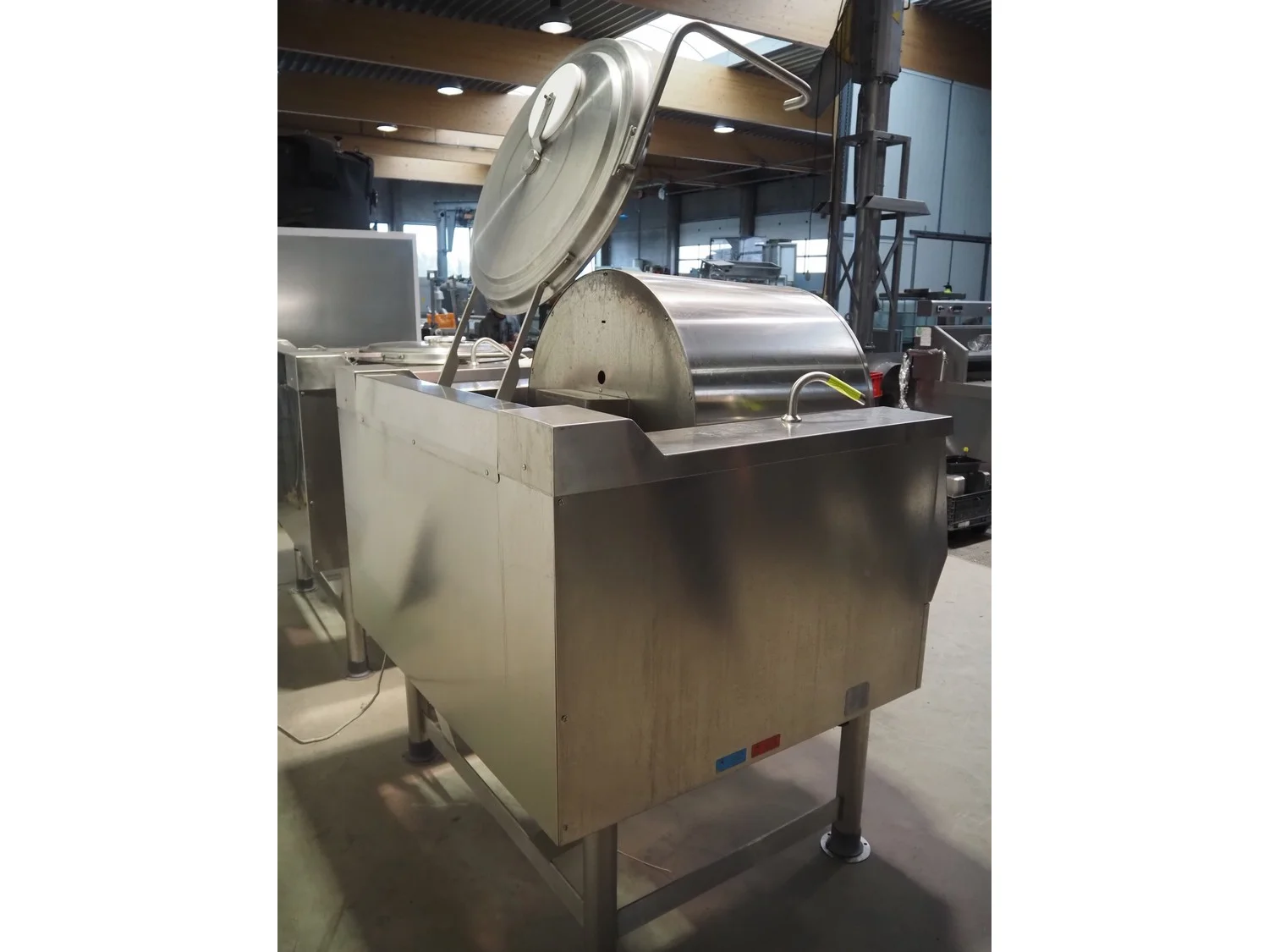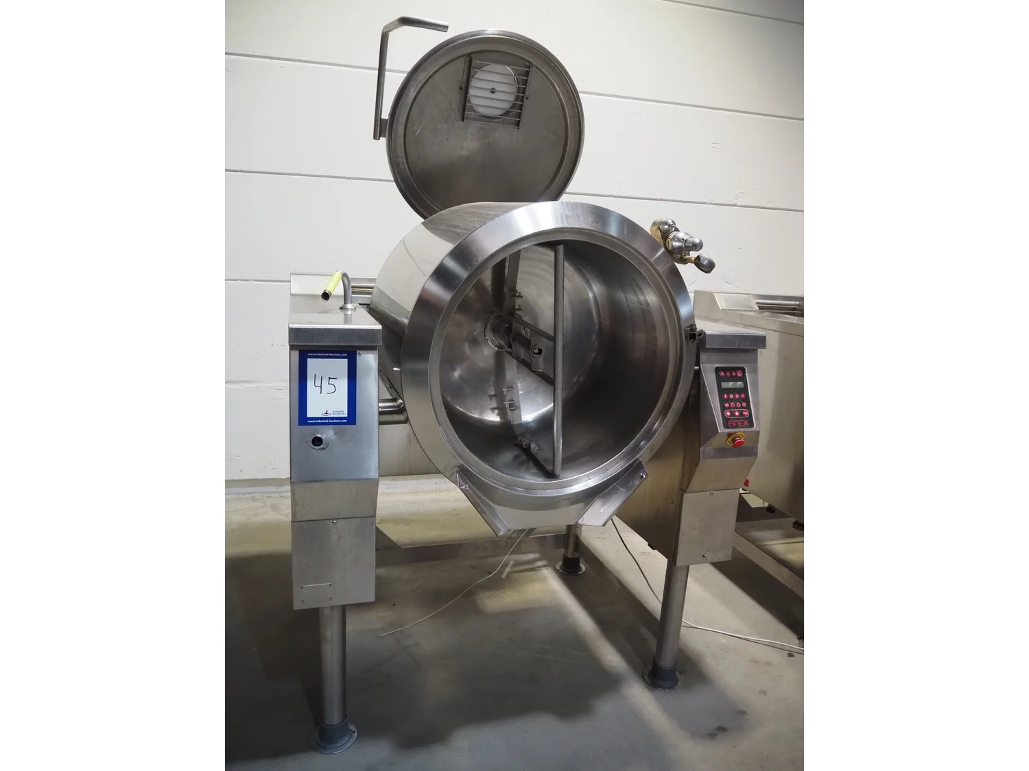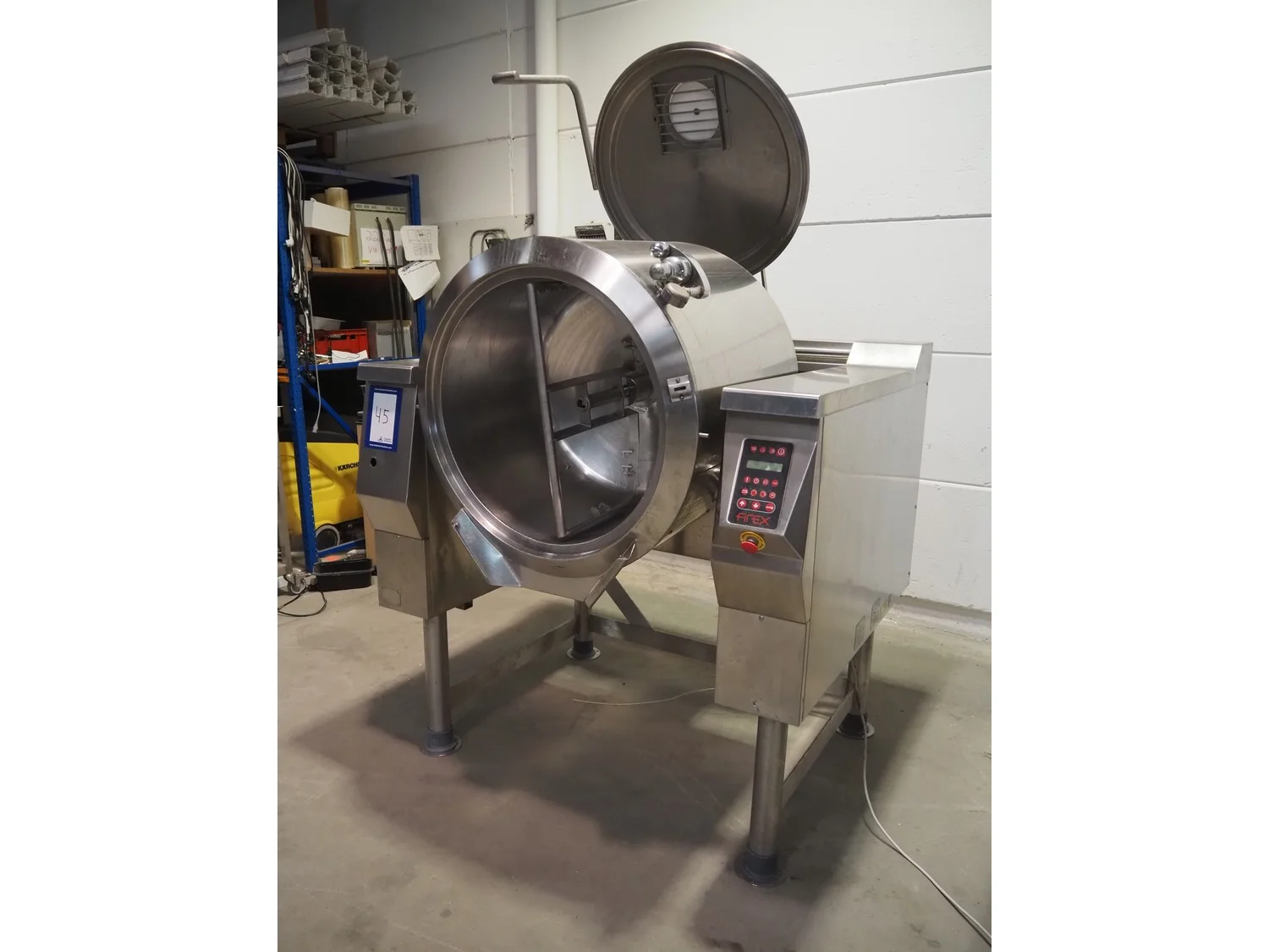 Firex tiltable braising pan with agitator and scrapers, model: PRIV180M, number: 21615 MH 29, year of construction: 2008, volume: 180 liter, total dimensions: 1450 mm x 1350 mm x 1285 mm.