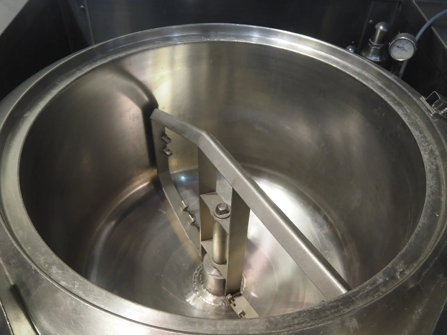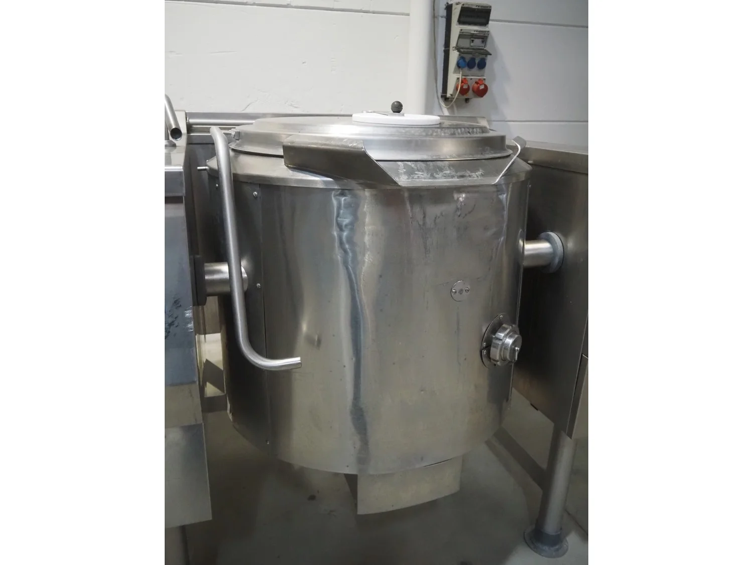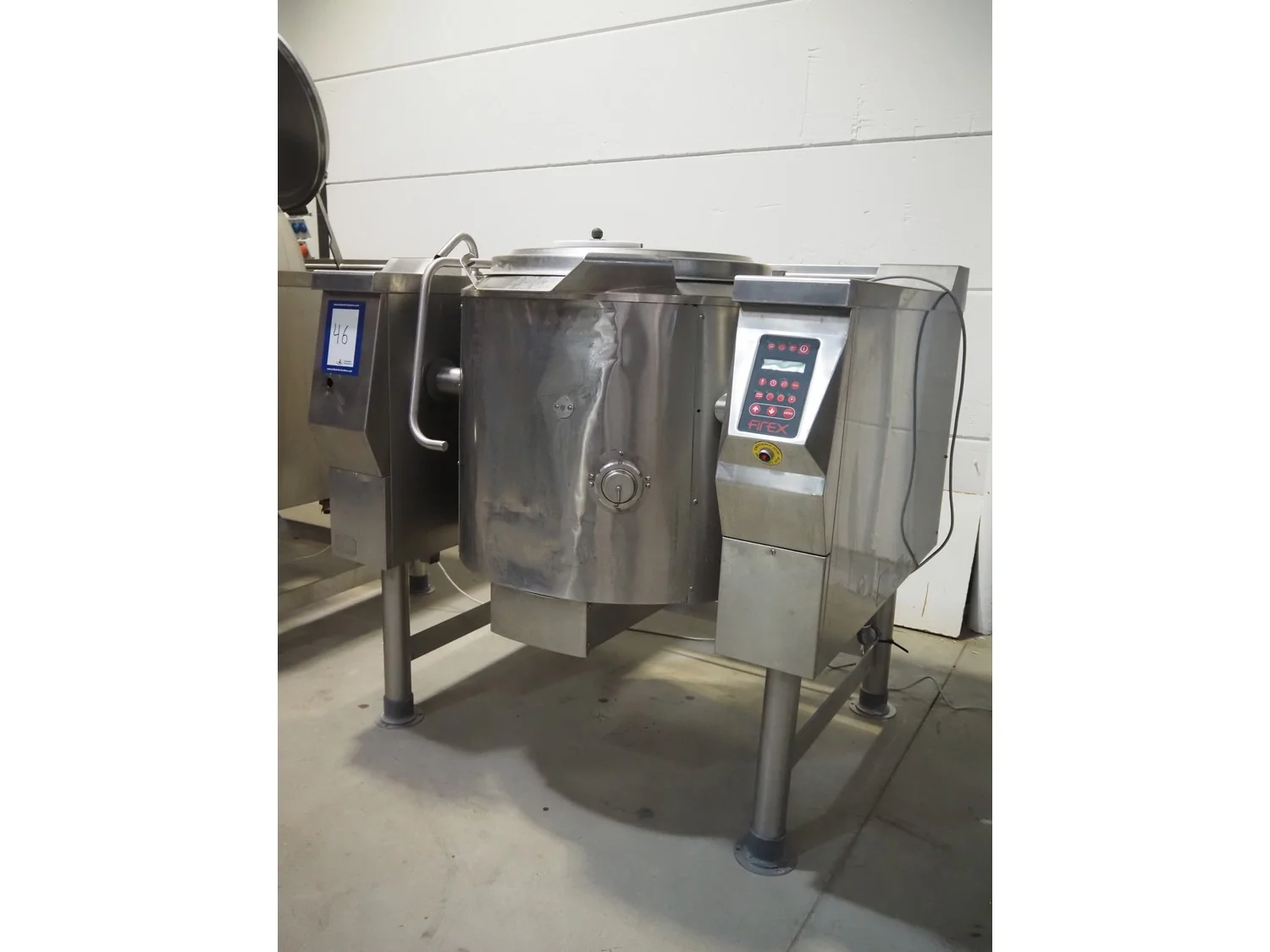 Firex tiltable braising pan with agitator and scrapers, model: PRIV180M, number: 30 LL 18735, year of construction: 2007, volume: 180 liter, total dimensions: 1450 mm x 1350 mm x 1285 mm.