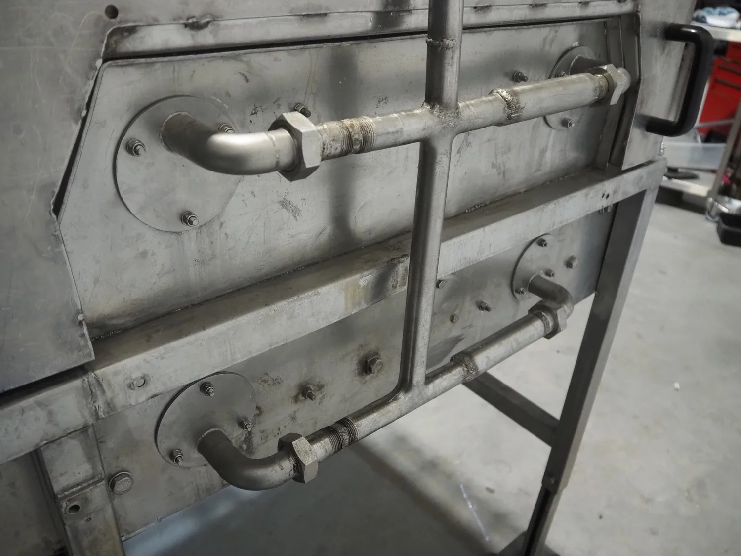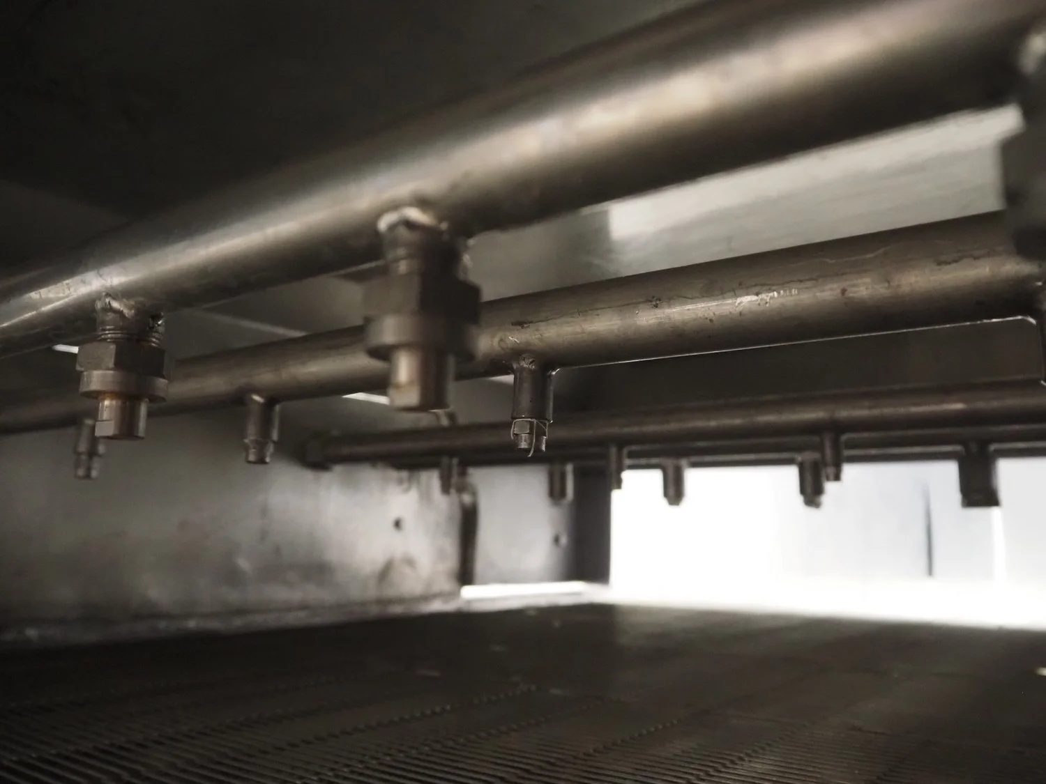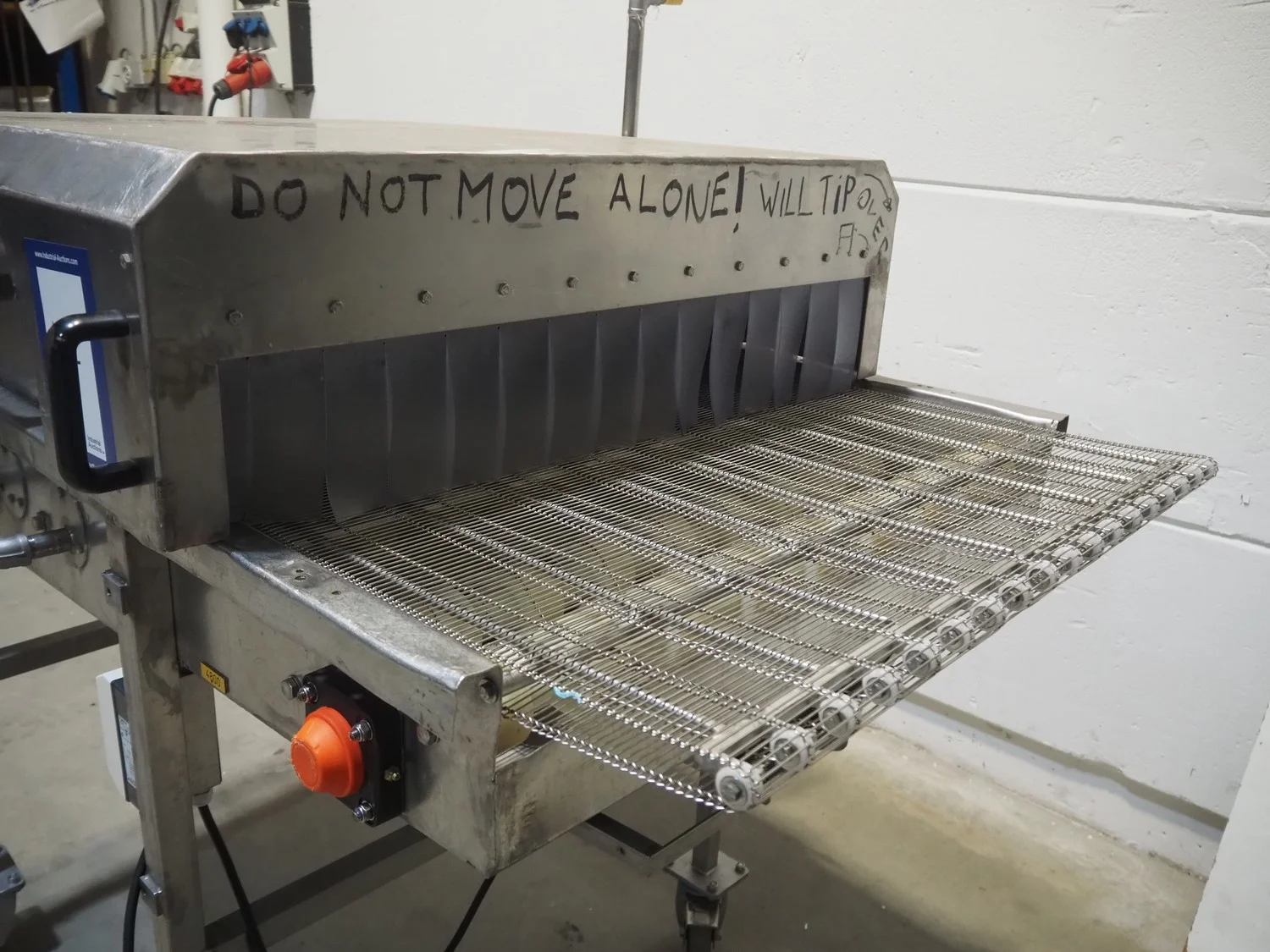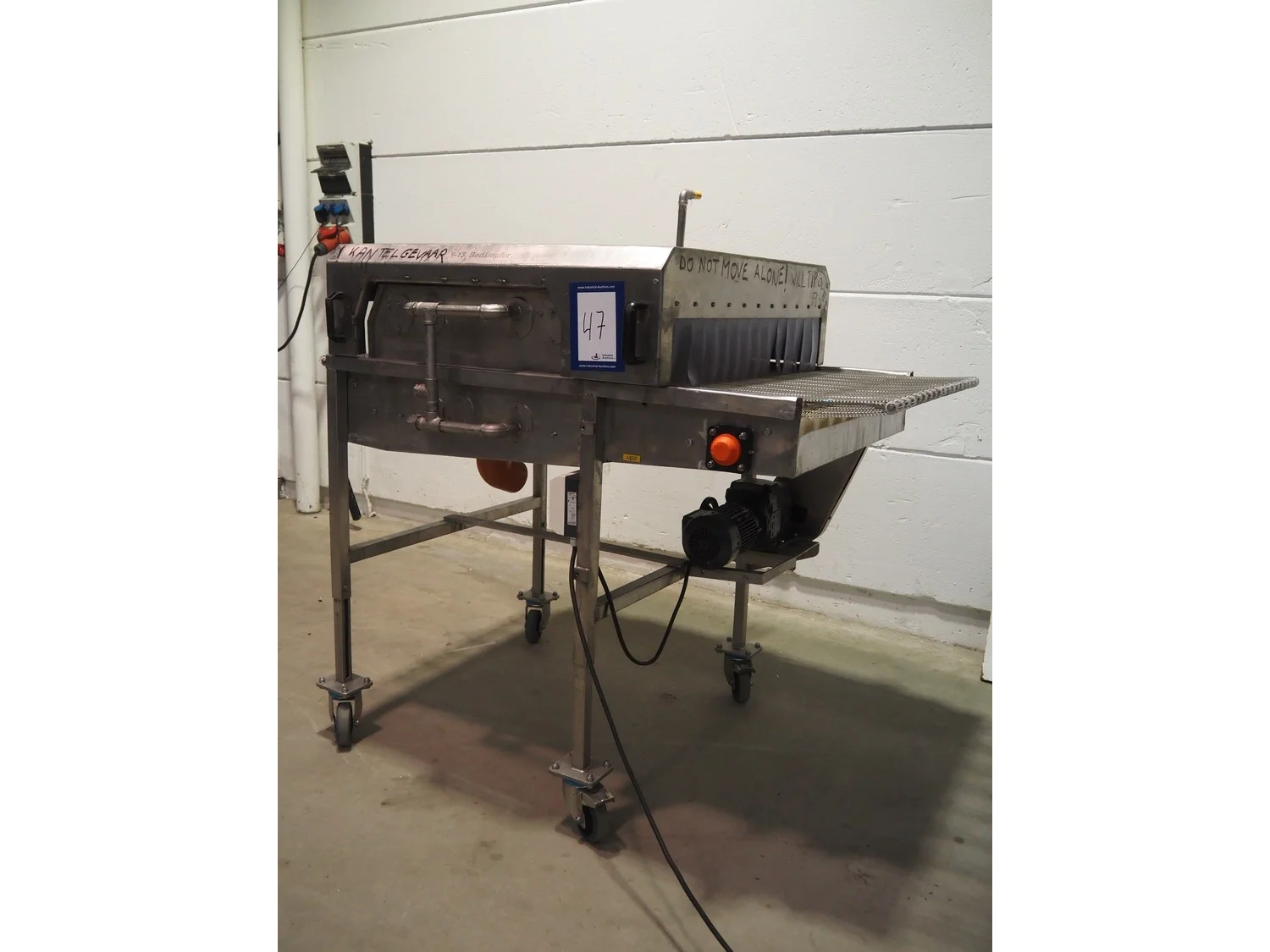 S/s mobile glazing machine, s/s mesh belt, belt width: 900 mm, clearance: 910 mm x 455 mm, total dimensions: 1700 mm x 1150 mm x 1650 mm.