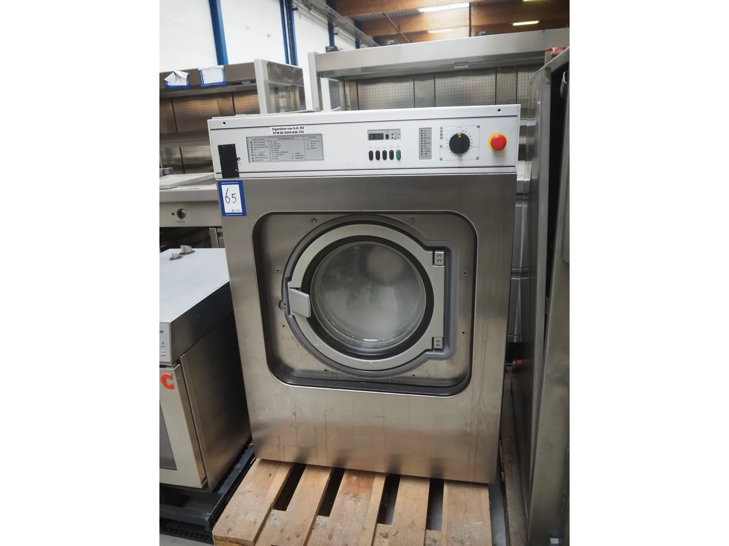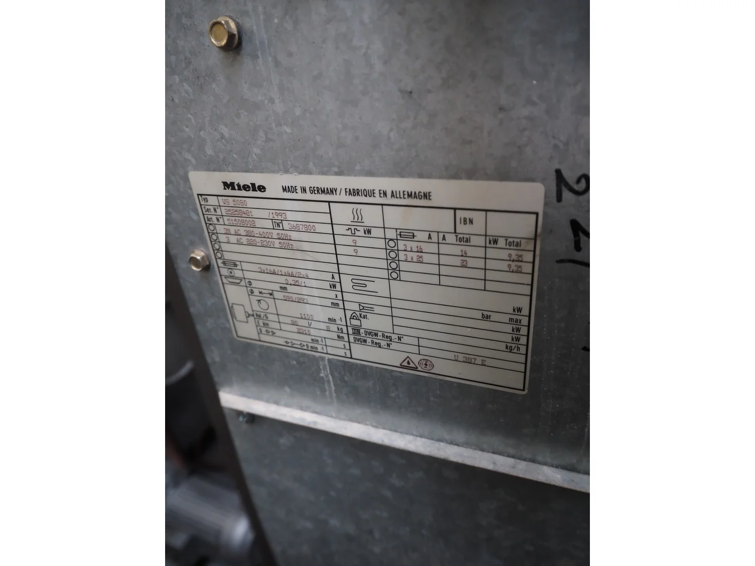 Miele washing machine, type: WS 5080, serial number: 25258481, year of construction: 1993, 220/400 V, 3 Ph, 50 Hz, 16/25 A, 9.35 kW, dimensions: 800 mm x 750 mm x 1150 mm.