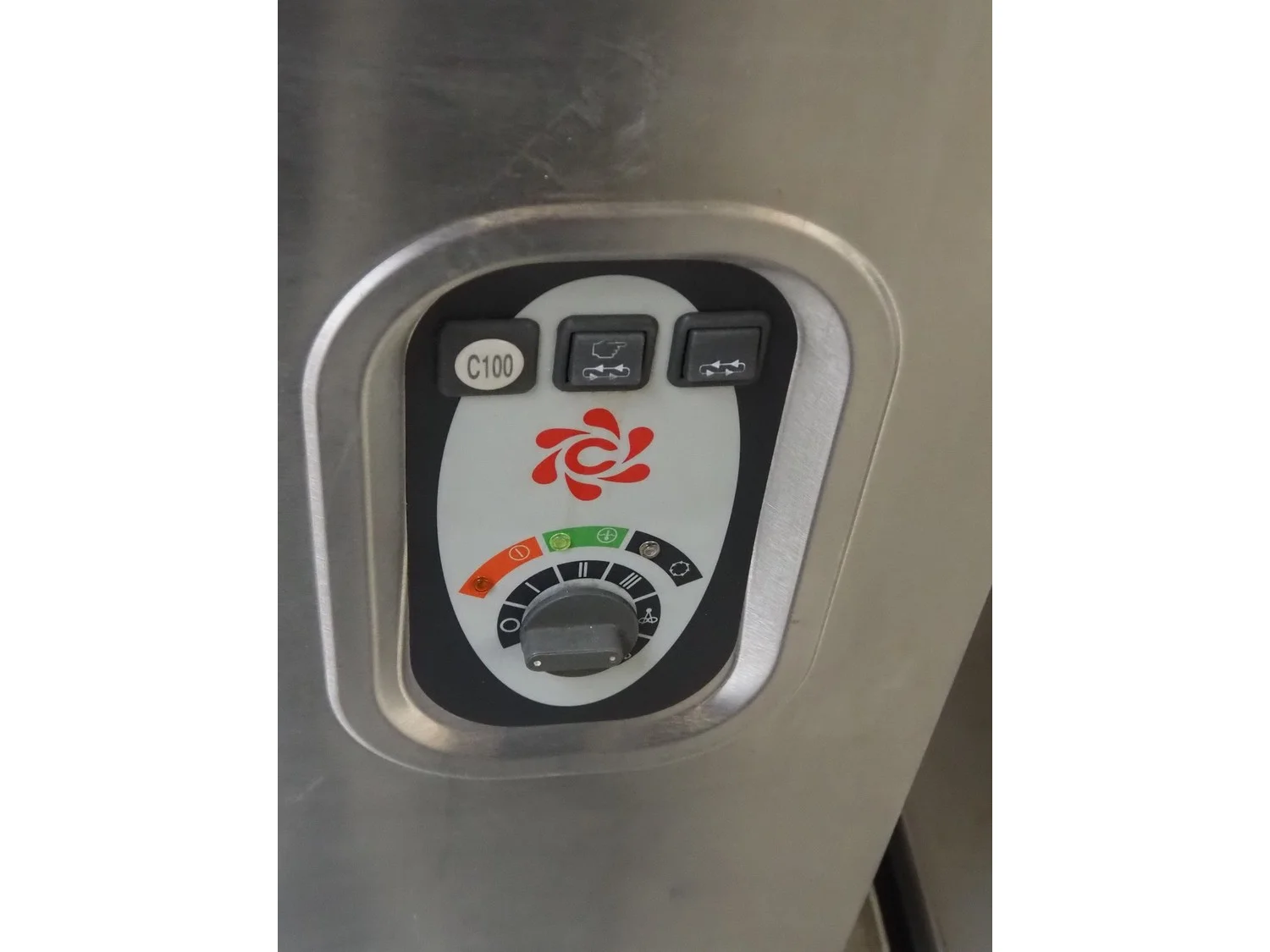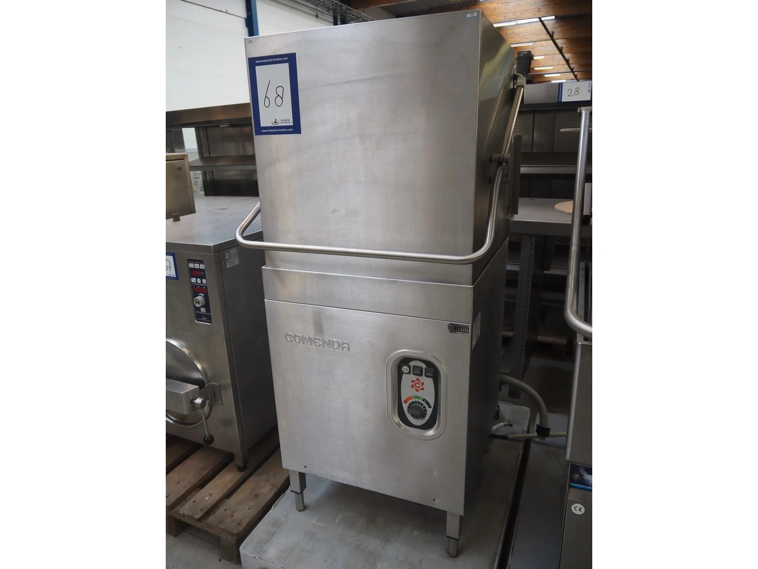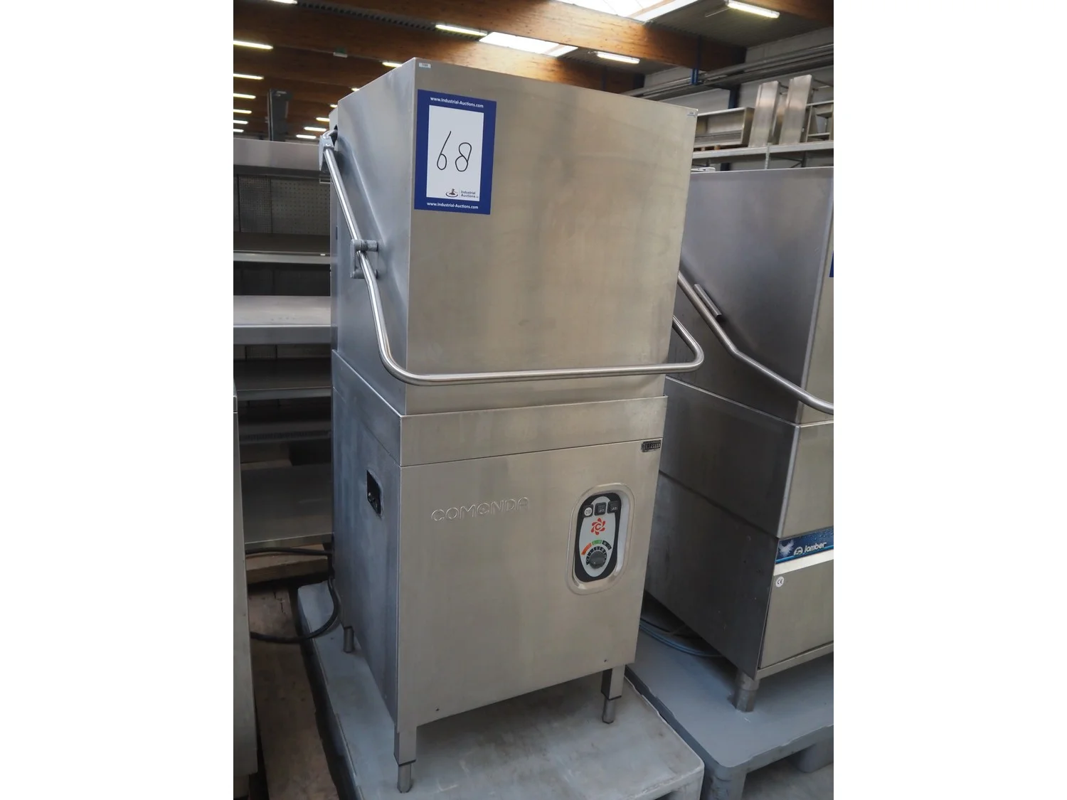 Comenda dishwasher, model: C100, number: DB013593/12/04, 380/400 V, 3 Ph, 50 Hz, 14 A, 8/9.1 kW, dimensions inside: 500 mm x 500 mm, total dimensions: 830 mm x 730 mm x 1530 mm.