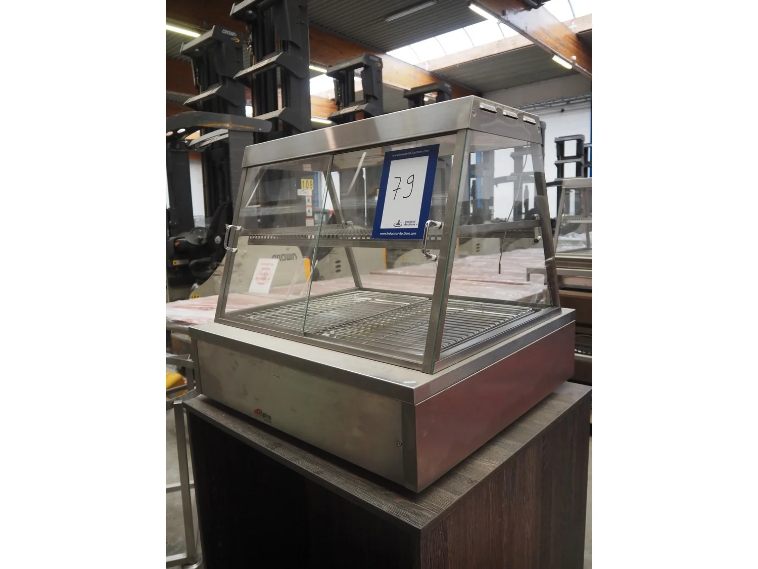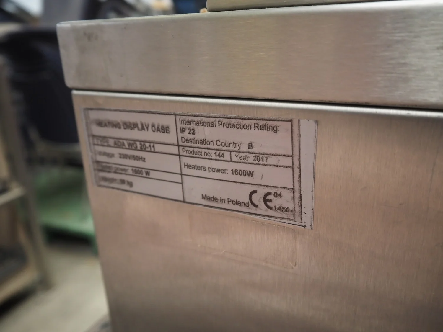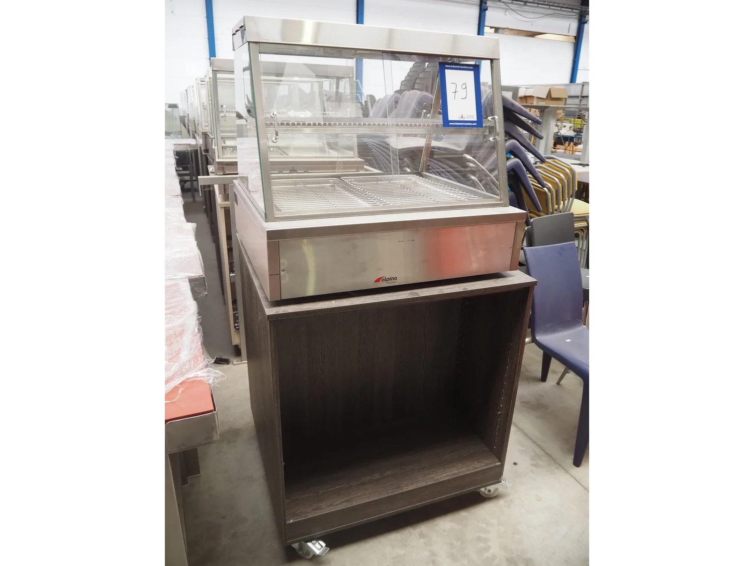 Alpina heated showcase, type: ADA WG 20-11, number: 144, year of construction: 2017, 230 V, 50 Hz, 1600 W, 50 kg, total dimensions: 800 mm x 750 mm x 1760 mm.