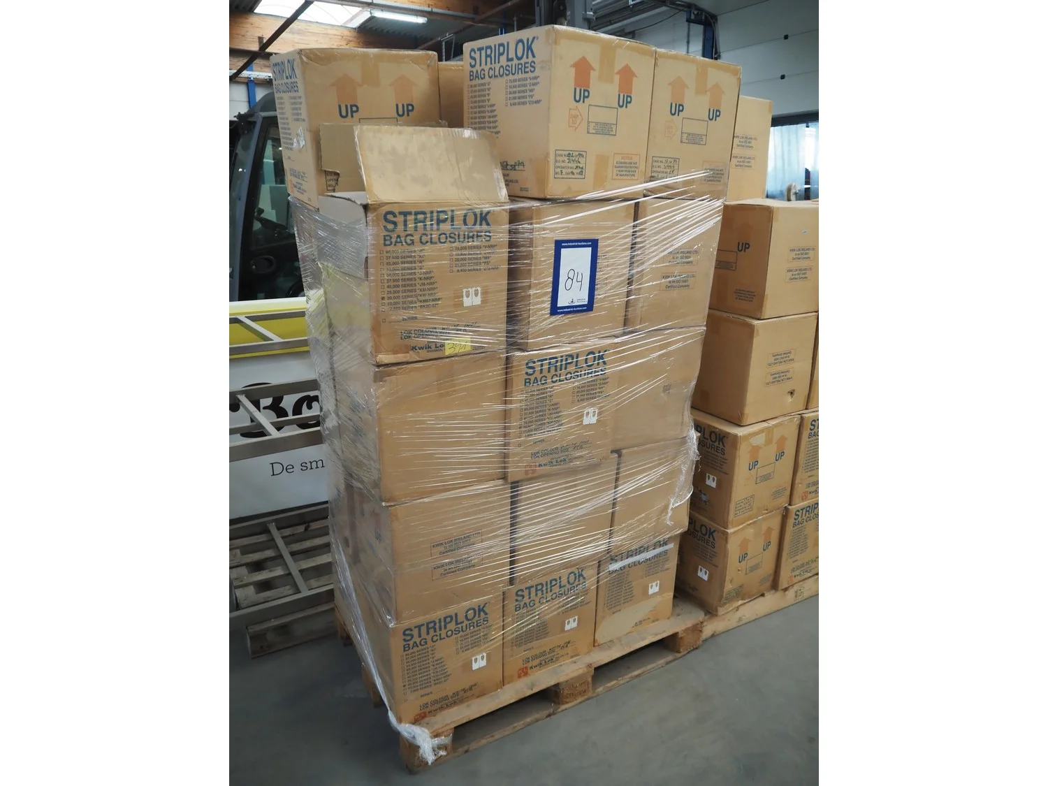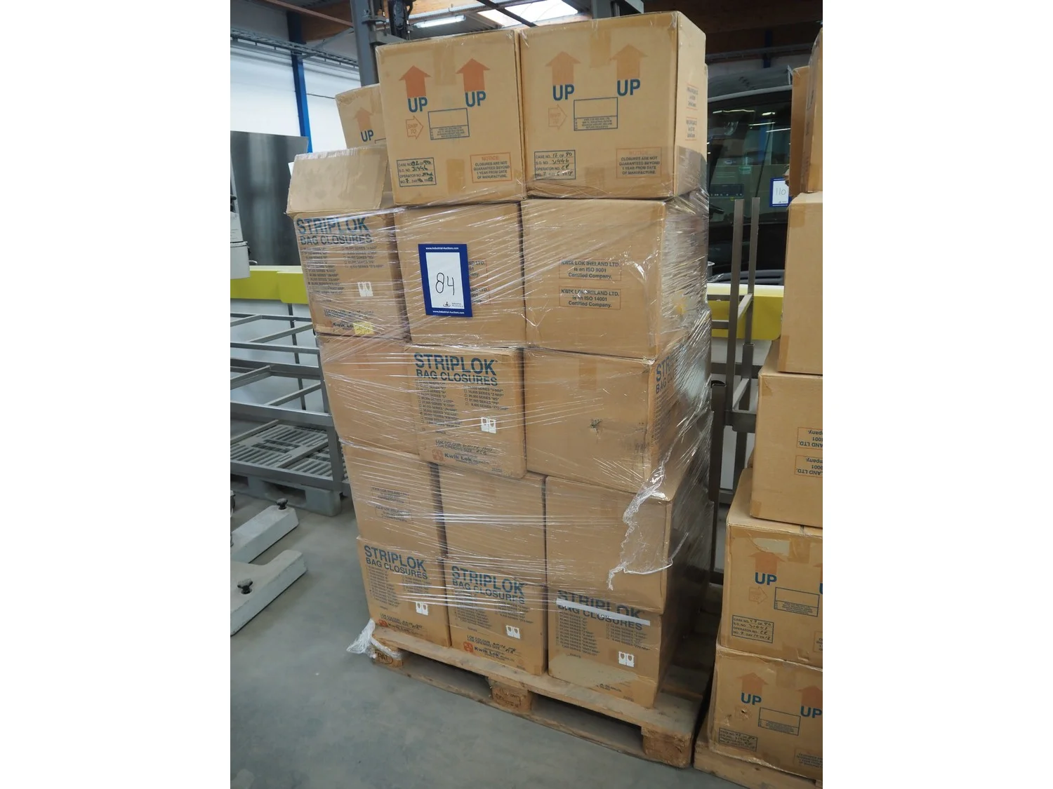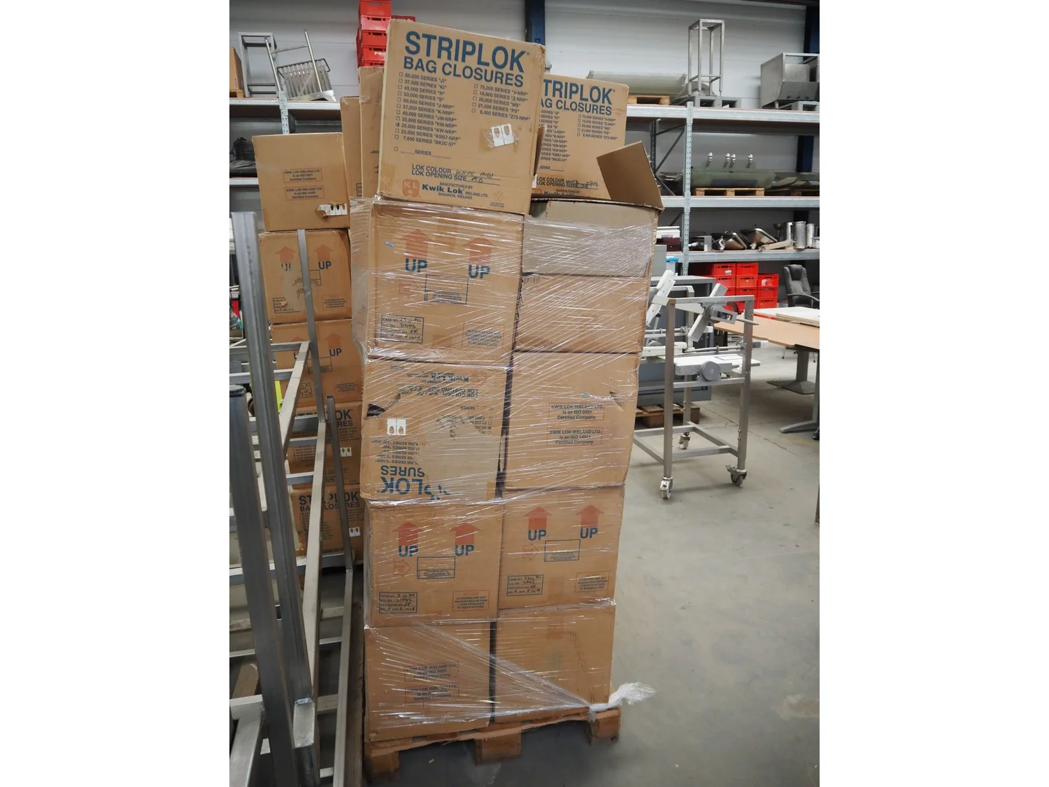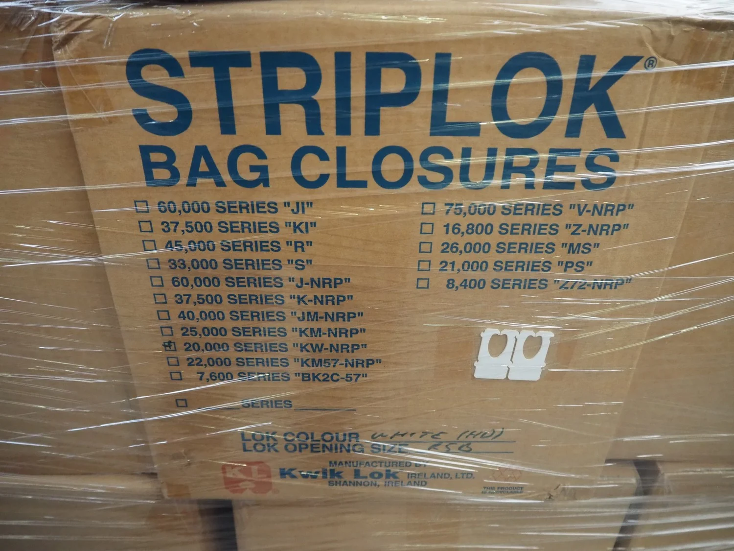 Pallet with approximately 28 boxes with large amount of Kwik Lok bag closures.
