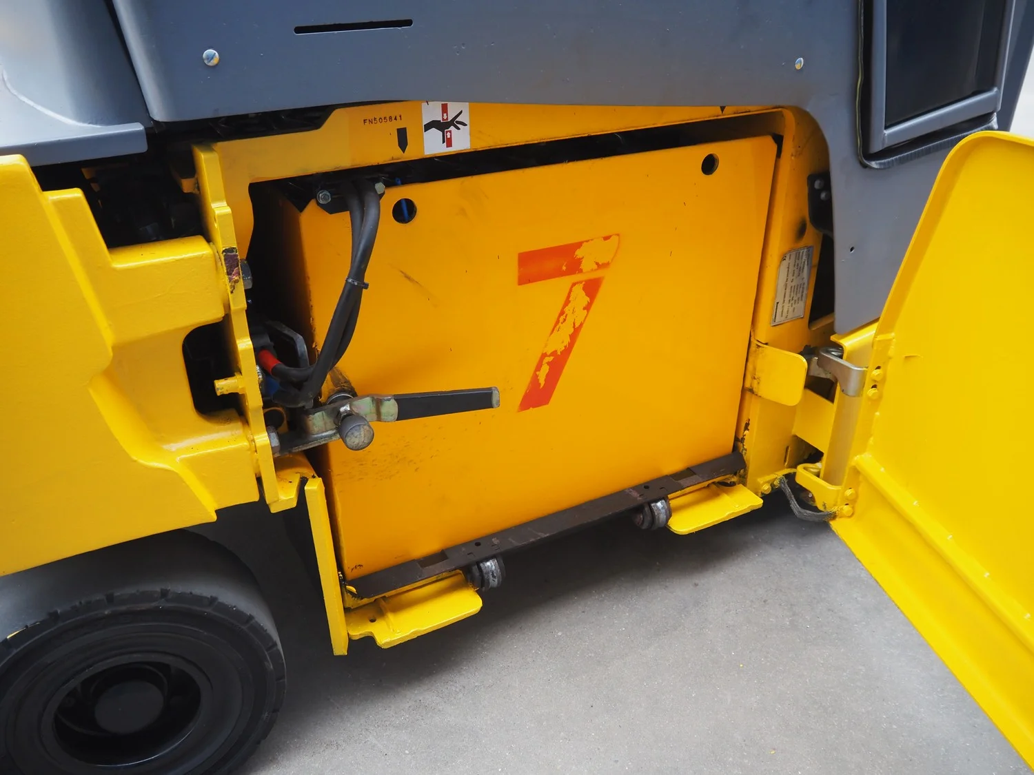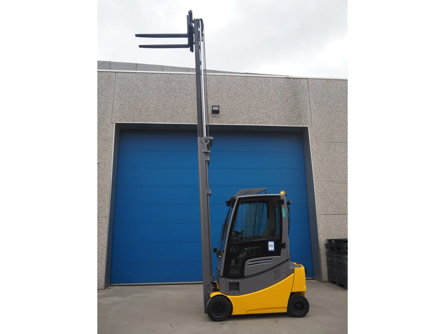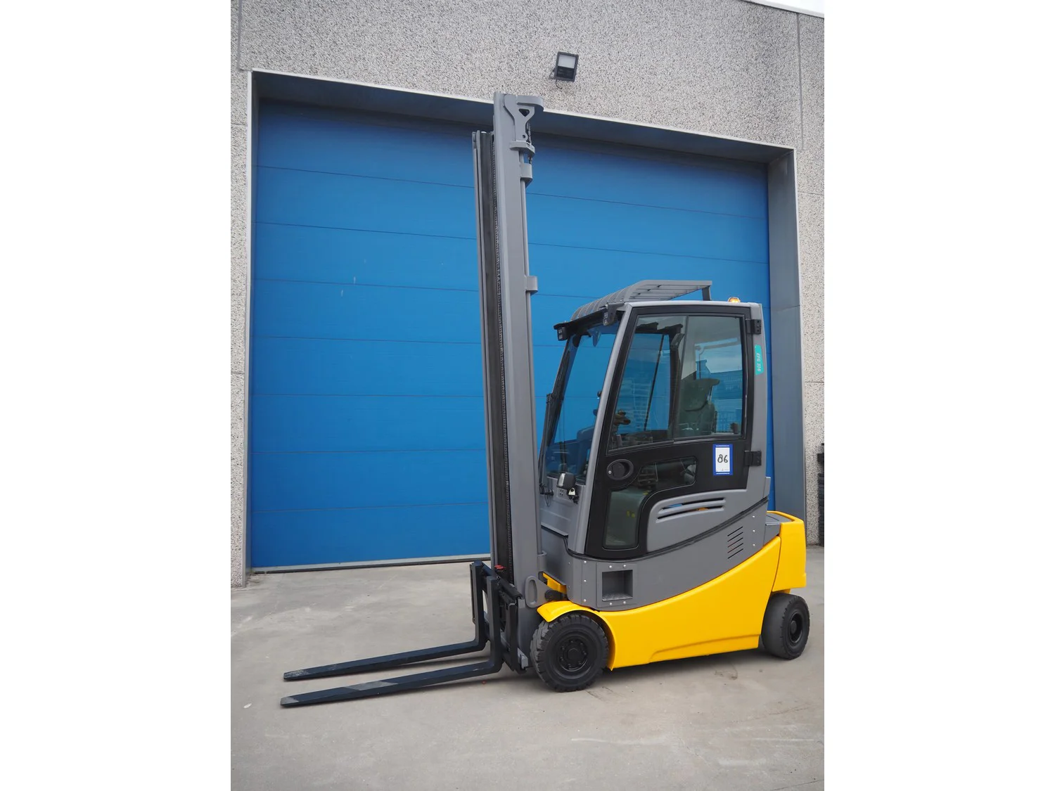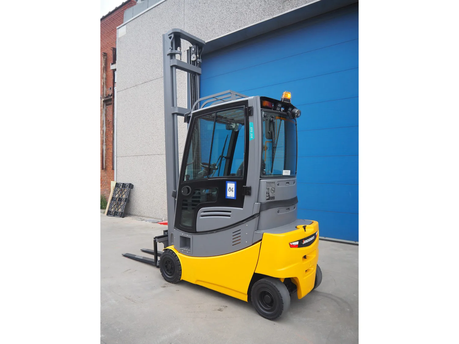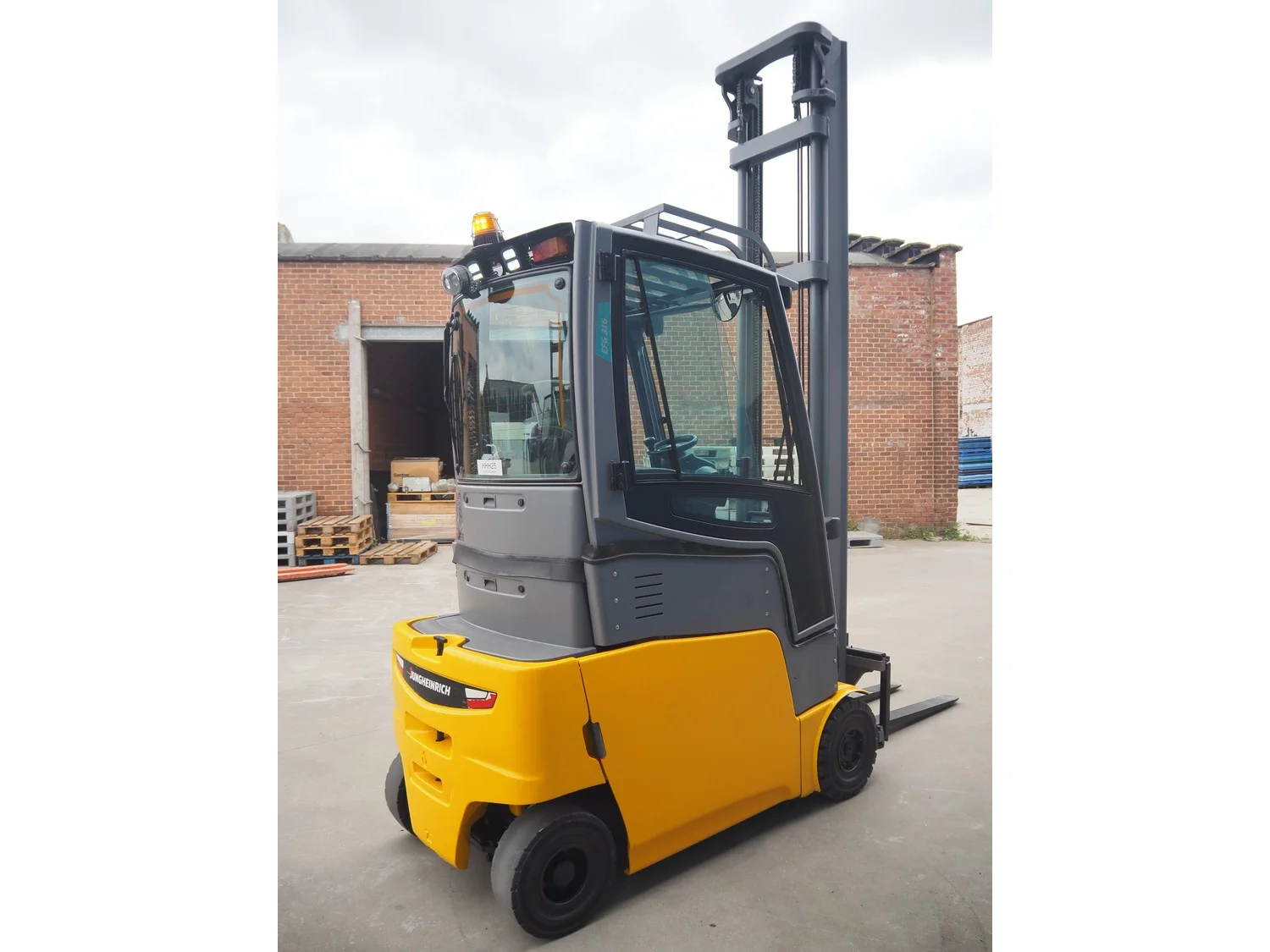 Jungheinrich electric forklift, model: EFG 316, serial number: FN505841, year of construction: 2016, rated capacity: 1600 kg, fork length: 1200 mm, total dimensions: 3400 mm x 1100 mm x 3550 mm. Including battery charger. Battery renewed in 2024.
