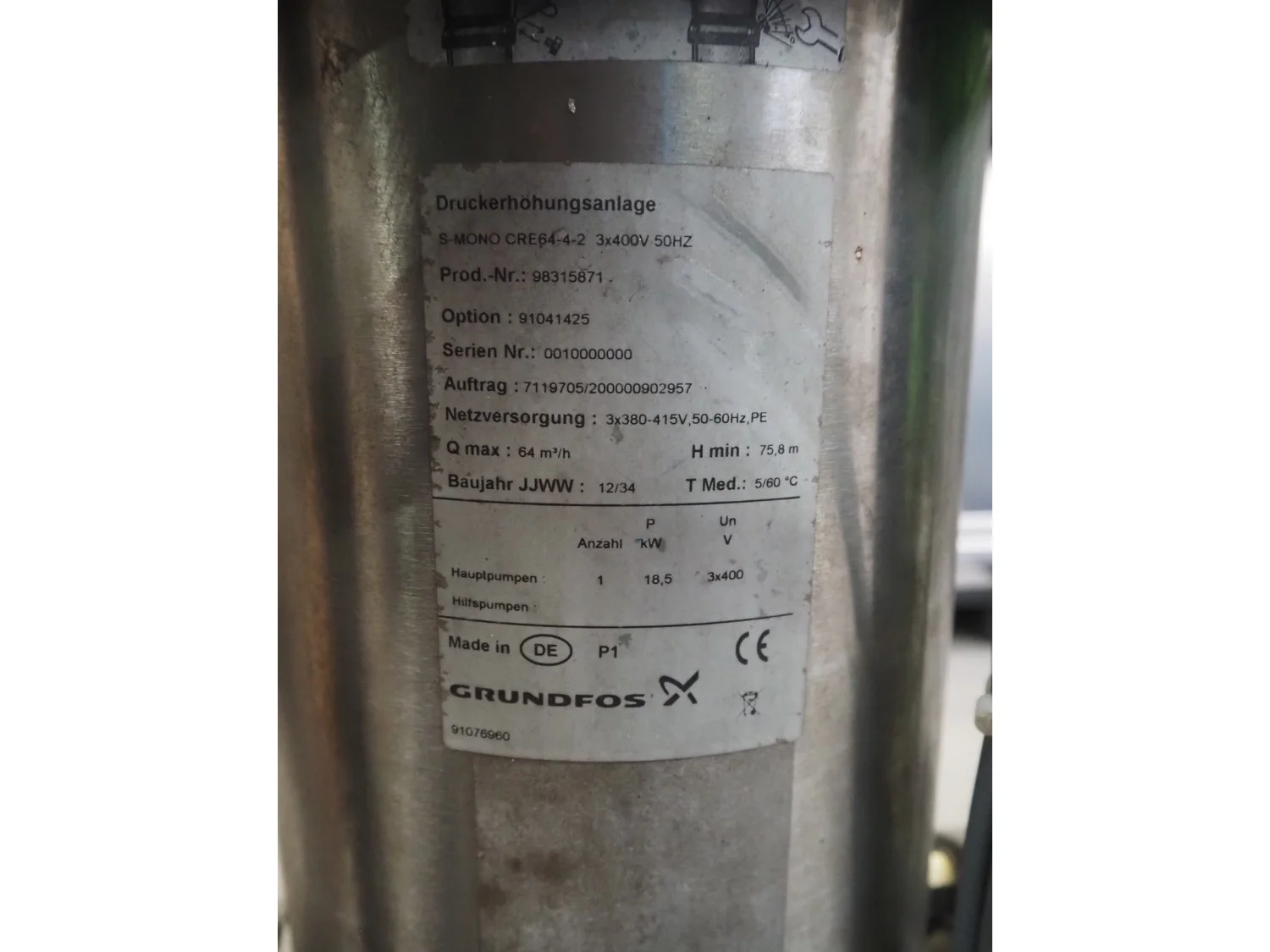 Grundfos pump, serial number: A96123983P11233, 50 Hz,18.5 kW, 64 m ³ per hour, with 2 Reflex pressure vessels, dimensions: 1600 mm x 500 mm x 1520 mm.
