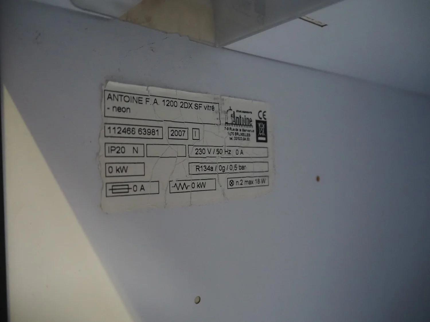 Antoine bottle cooler, model: 1200 2DX SF, number: 112468 638981, year of construction: 2007, 230 V, 50 Hz, refrigerant: R134a, (2x) 2 floors, dimensions each floor: 340 mm x 540 mm, total dimensions: 1200 mm x 580 mm x 830 mm.