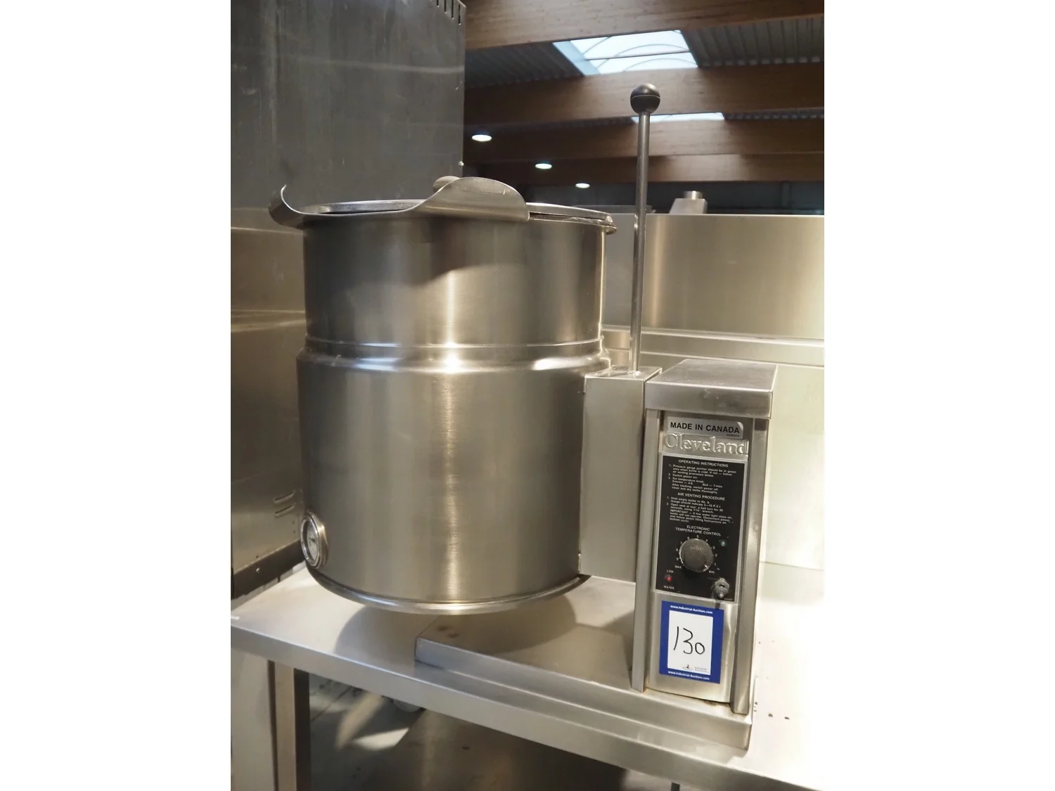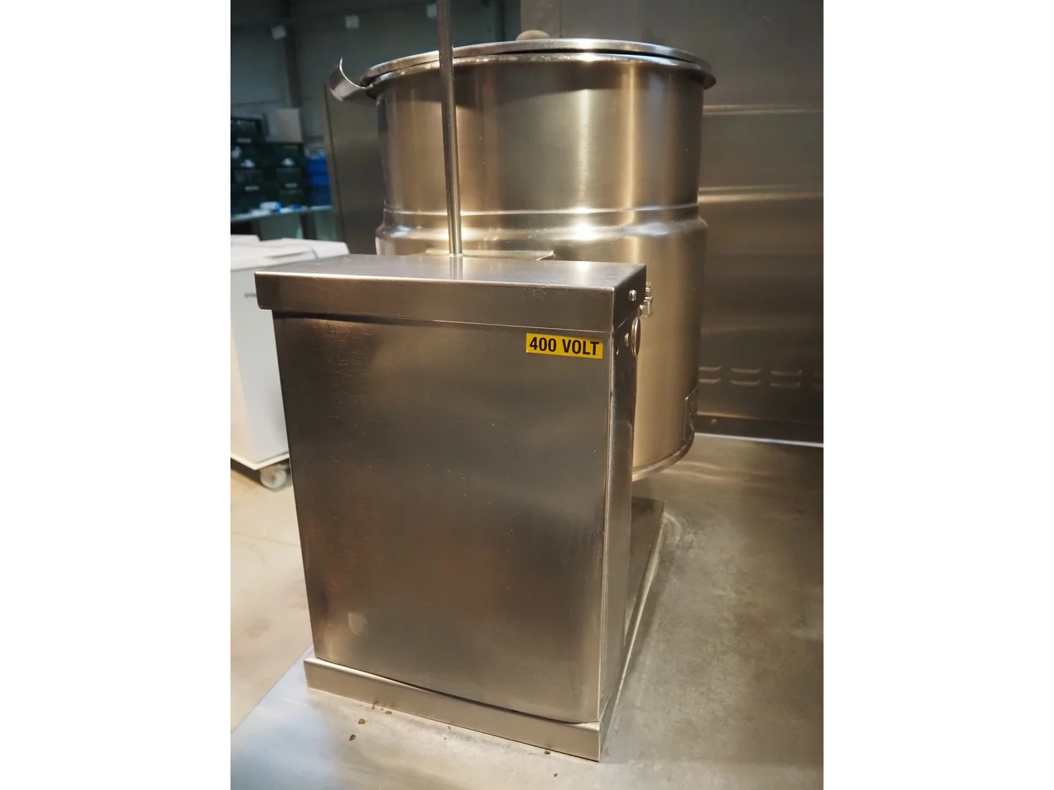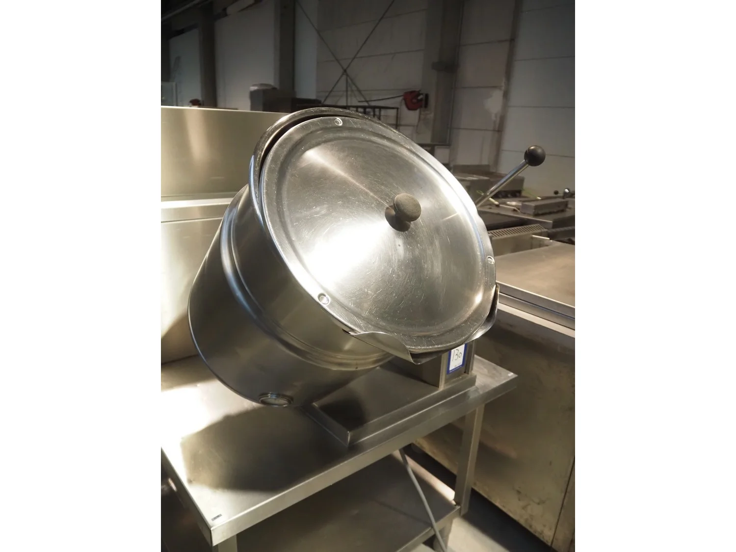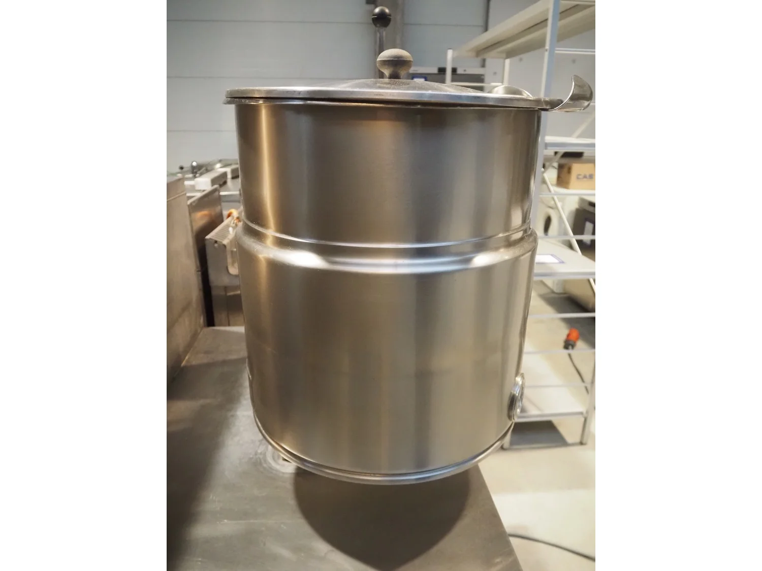 Cleveland tiltable cooking vessel on s/s table, model: KET-12T, serial number: WT8775-90D-10, year of construction: 1990, volume: 45 liter, dimensions: 1000 mm x 950 mm x 1550 mm.