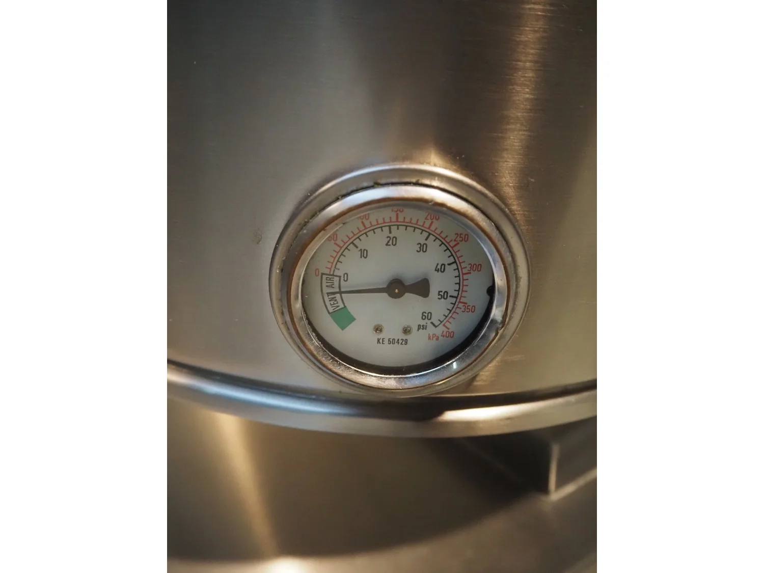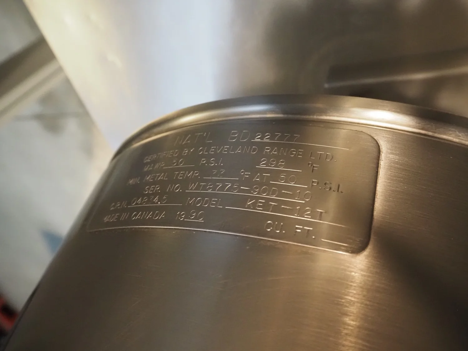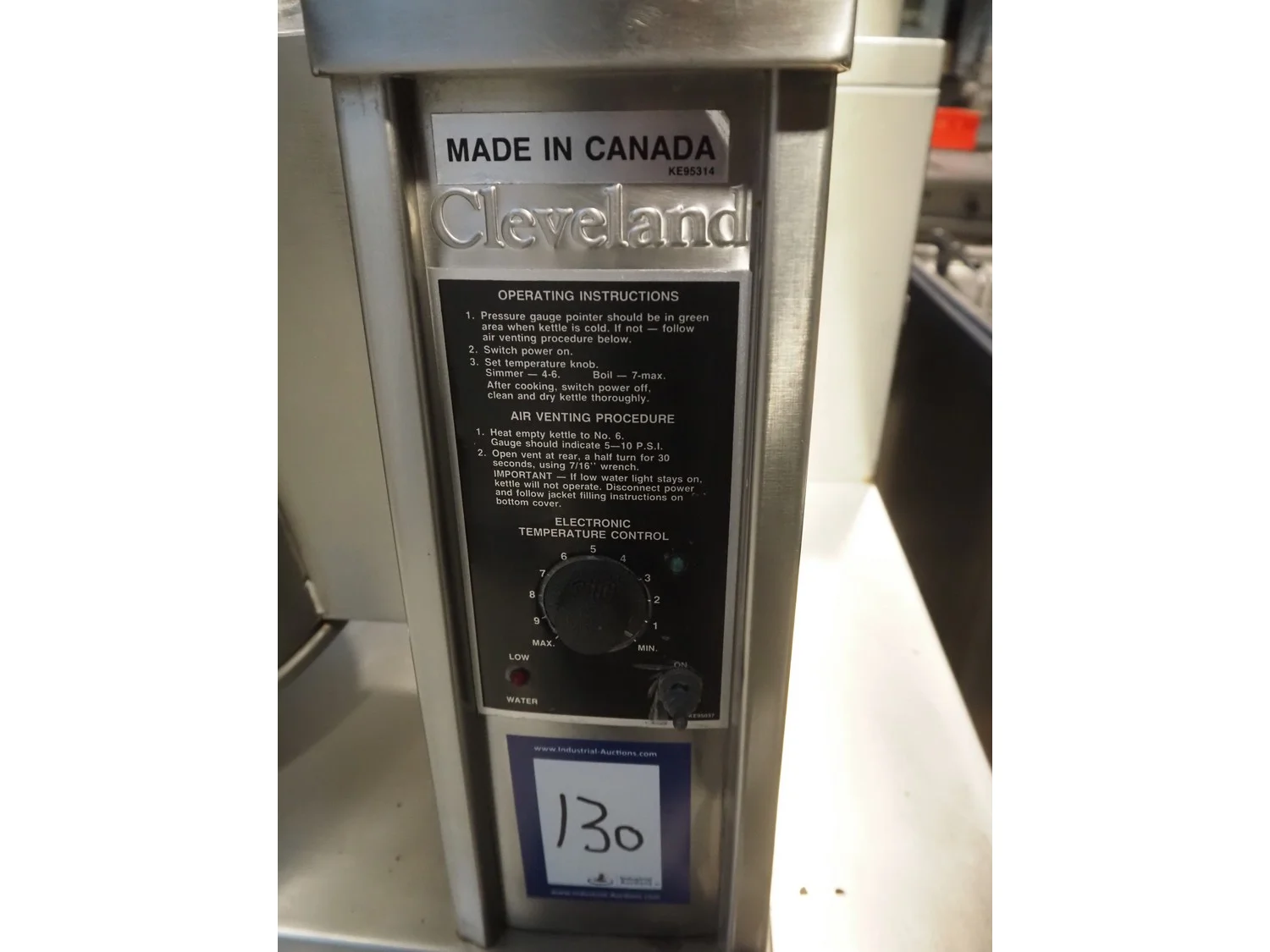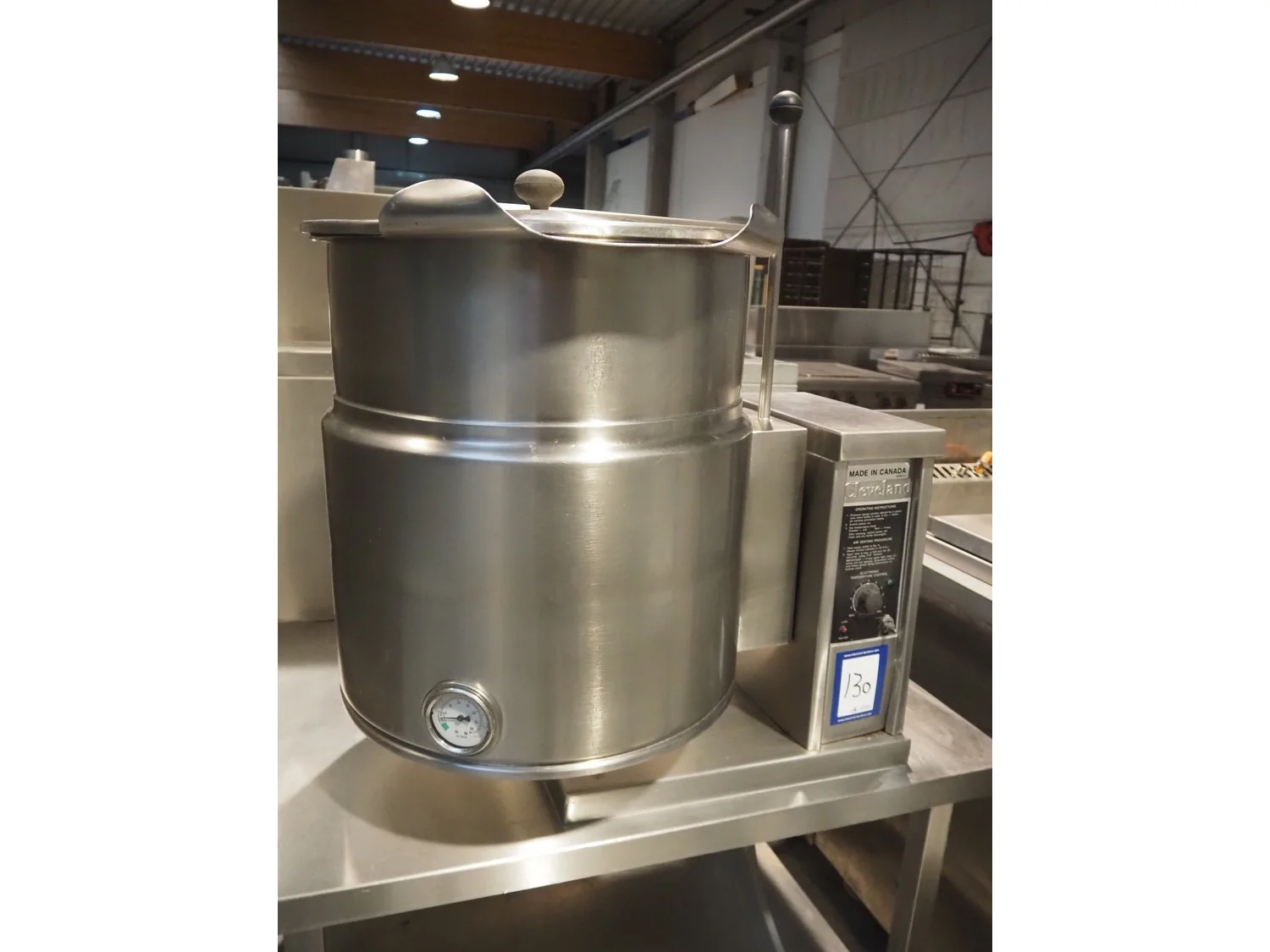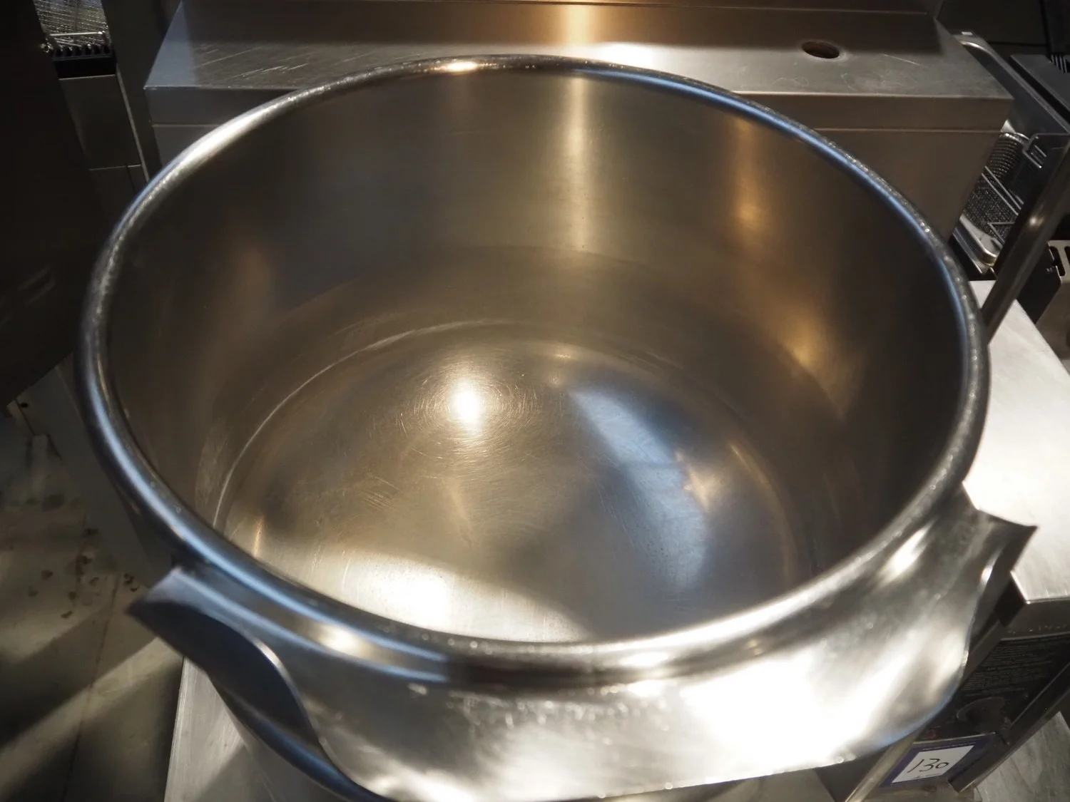 Cleveland tiltable cooking vessel on s/s table, model: KET-12T, serial number: WT8775-90D-10, year of construction: 1990, volume: 45 liter, dimensions: 1000 mm x 950 mm x 1550 mm.