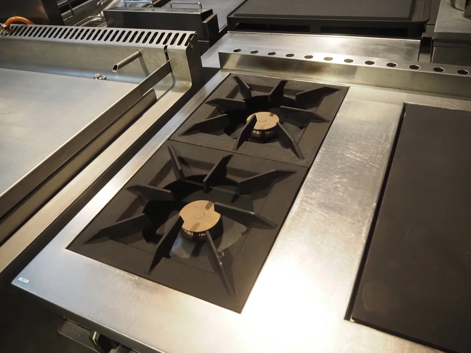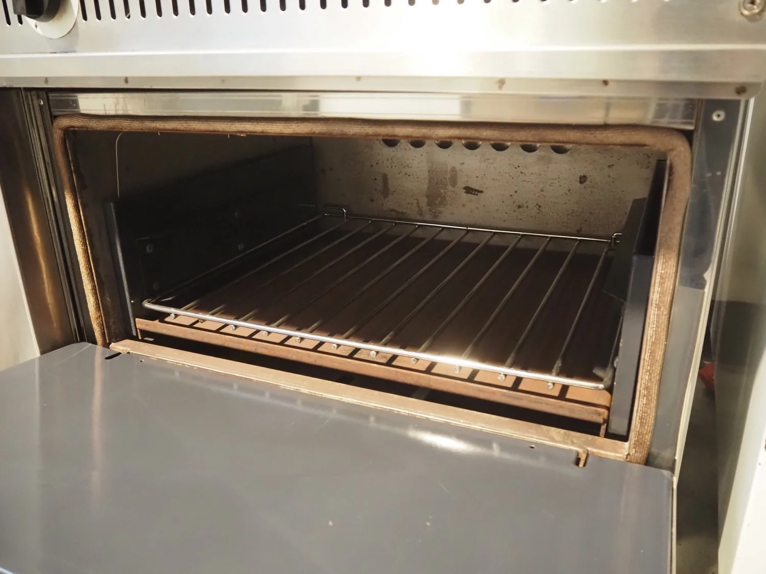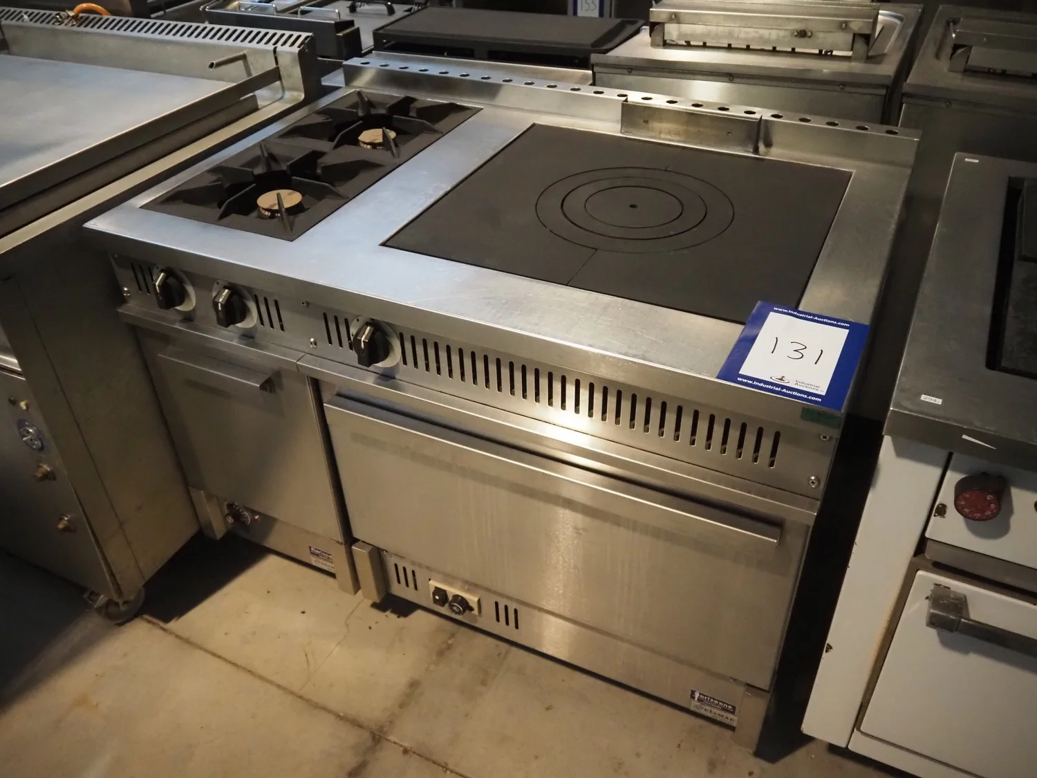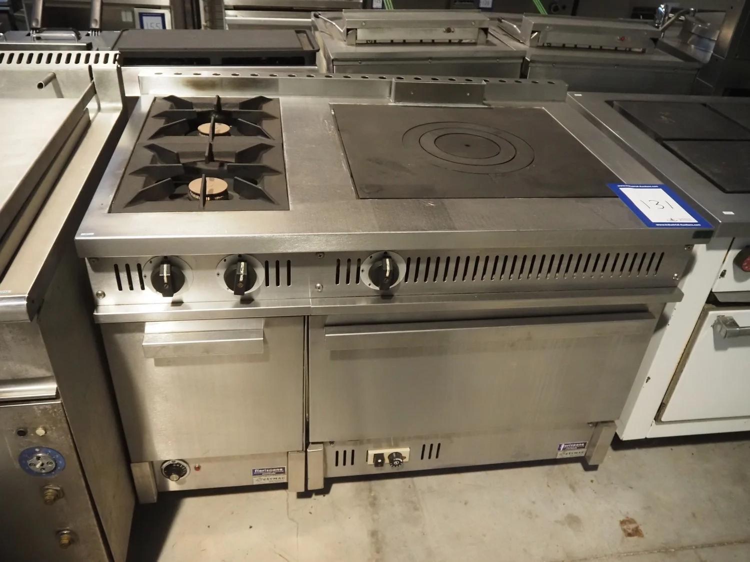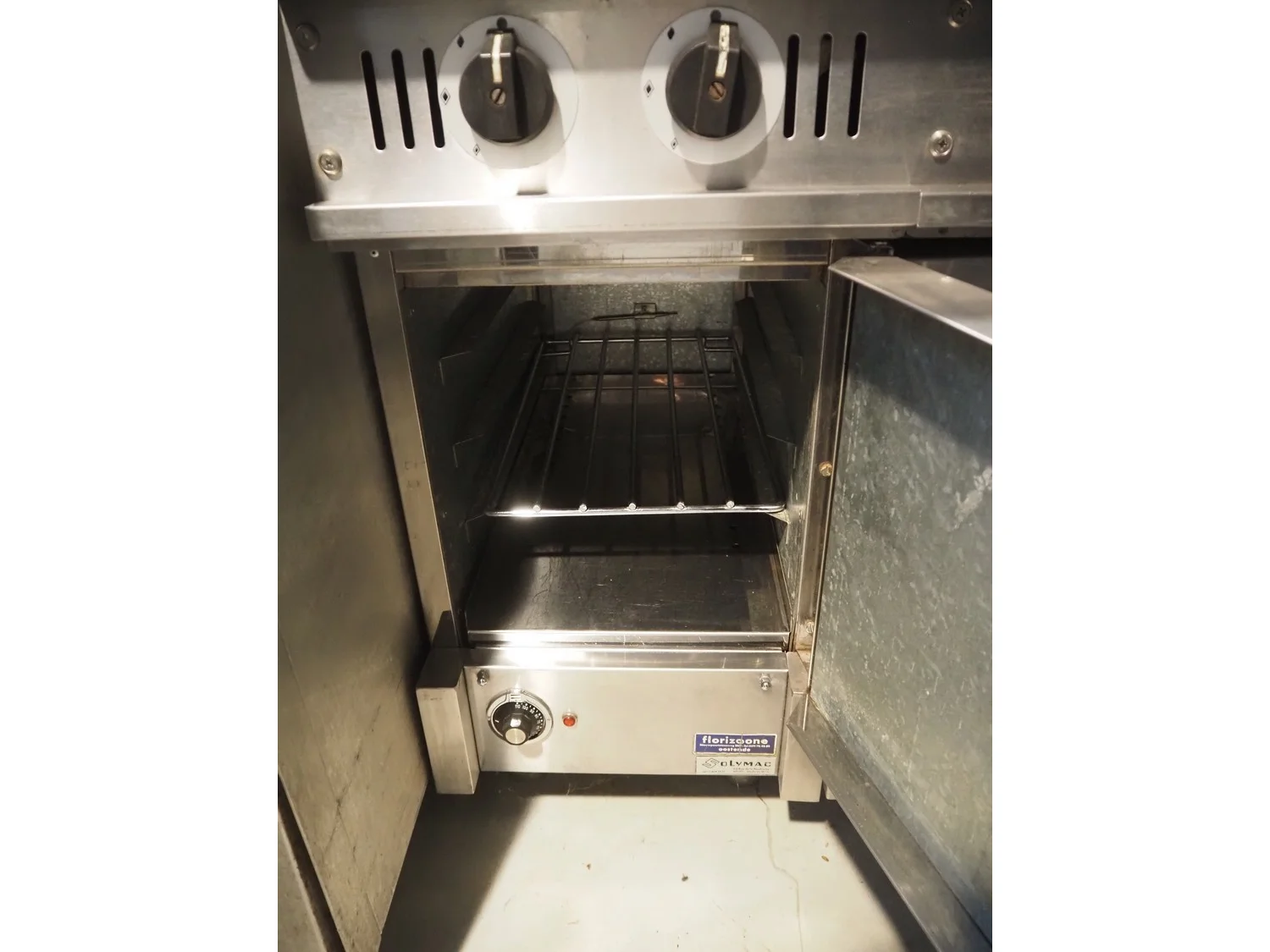 Solymac gas stove with 2 burners and 1 wok and oven, inside dimensions: 650 mm x 540 mm, total dimensions: 1200 mm x 800 mm x 910 mm.