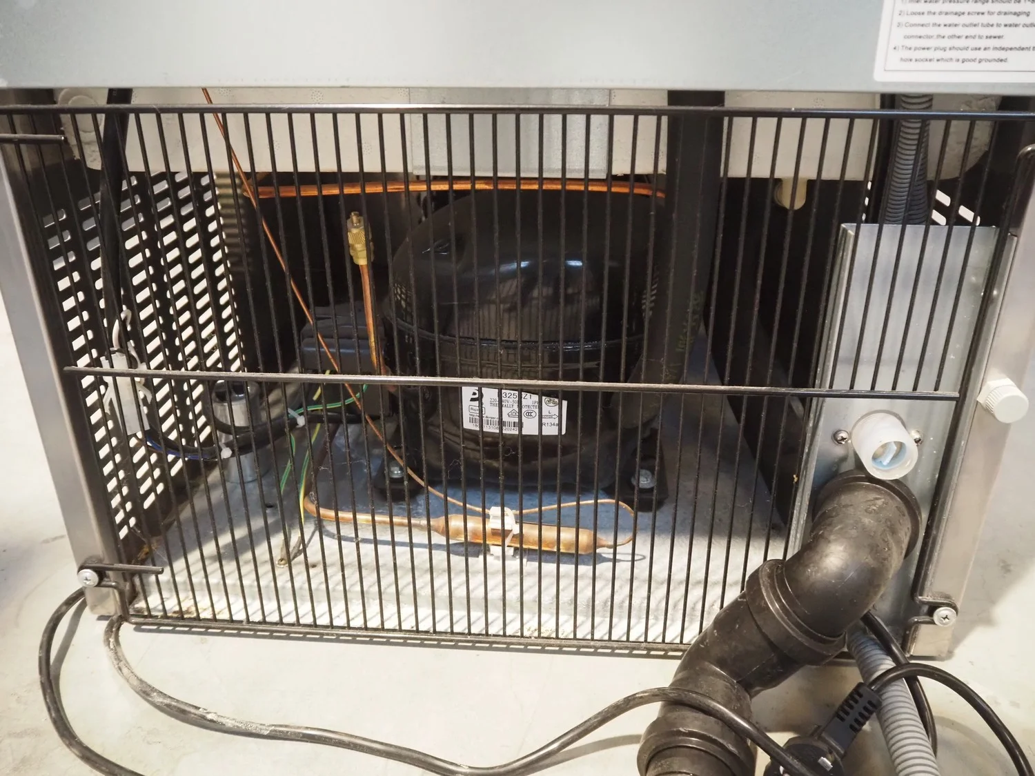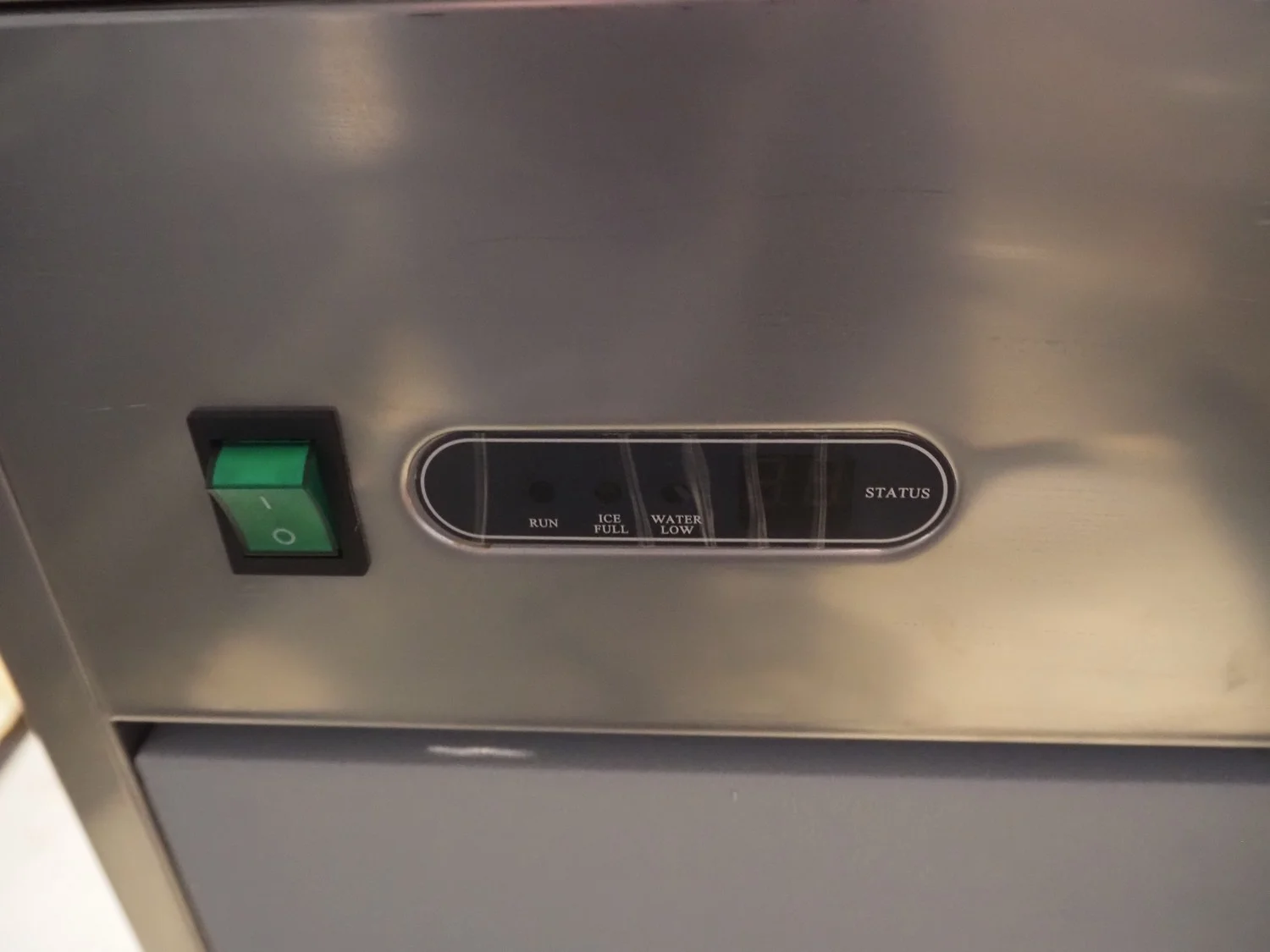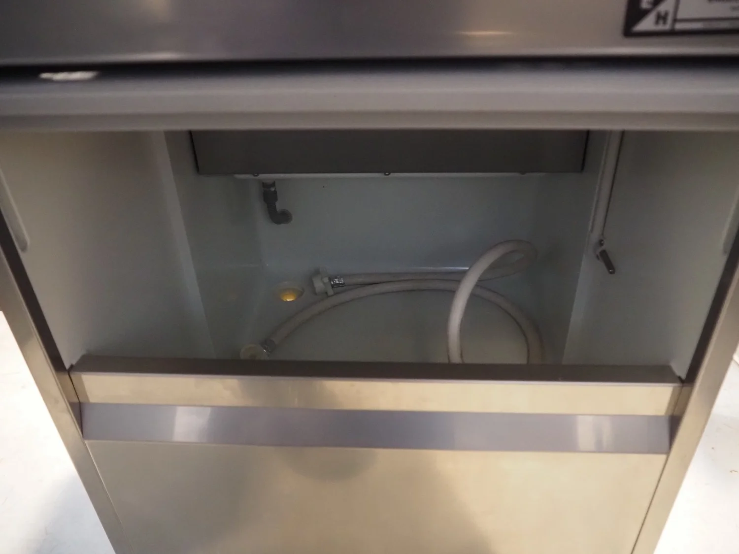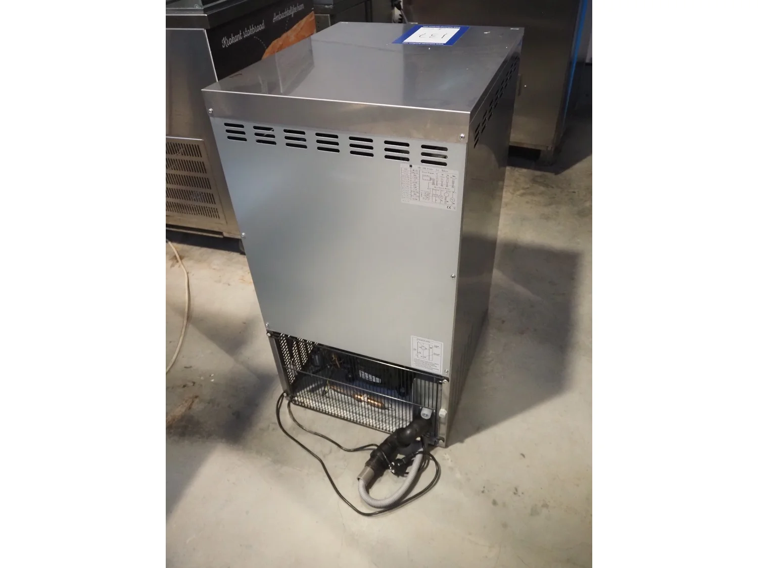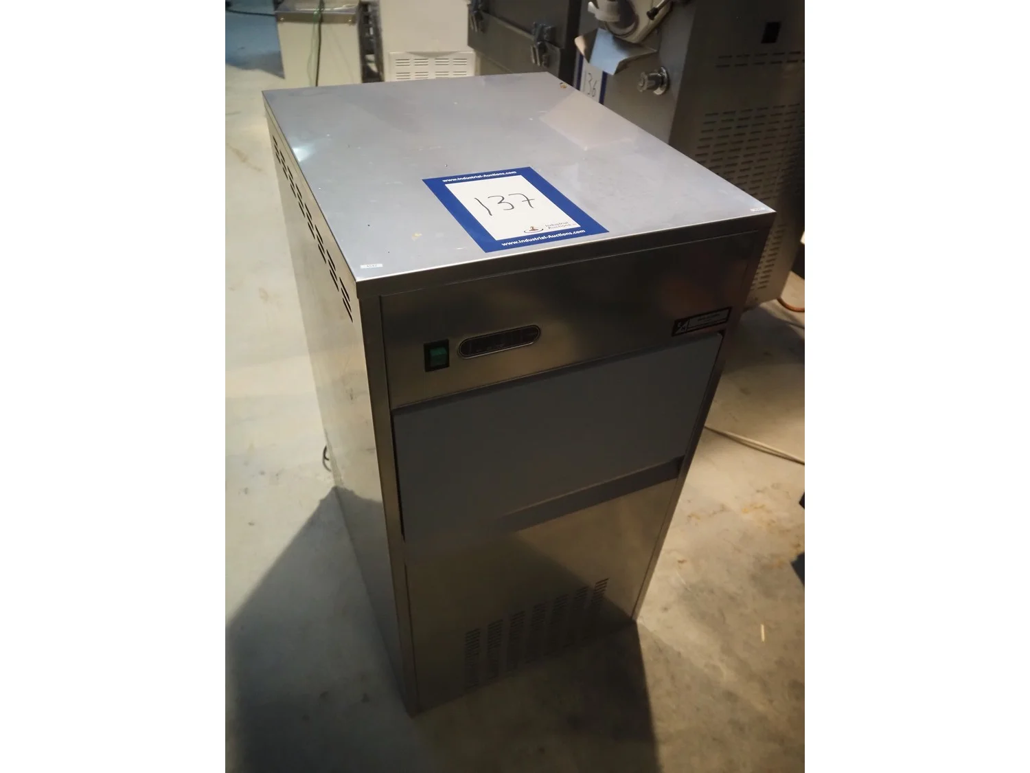 Ice machine, model: IMS-100, serial number: SHS100 1018028, 230 V, 50 Hz, 12.4 A, 520 W, netto weight: 58 kg, refrigerant: R134A, 130 g, capacity: 100 kg per hour, dimensions: 500 mm x 610 mm x 930 mm.