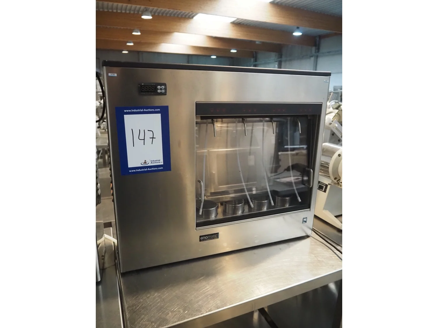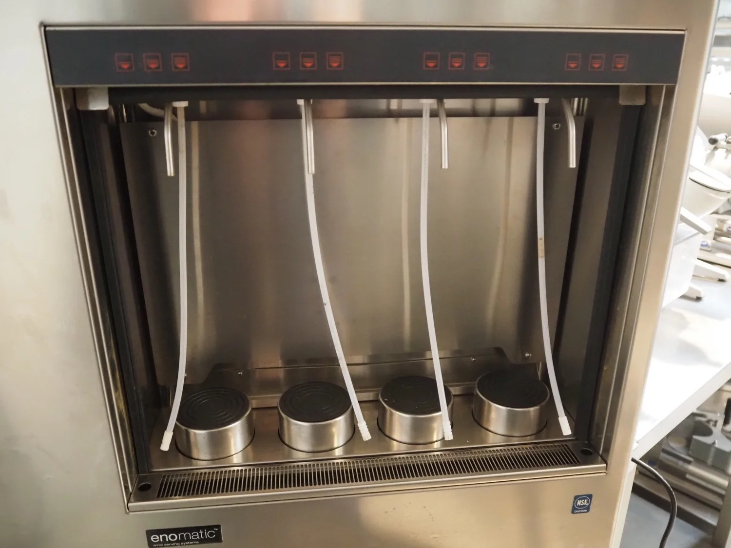 Enomatic 4‑bottle wine dispenser climate cabinet, serial number: 090008496, year of construction: 04/2009, 220 Vac, 50 Hz, 150 W, dimensions: 750 mm x 250 mm x 650 mm.