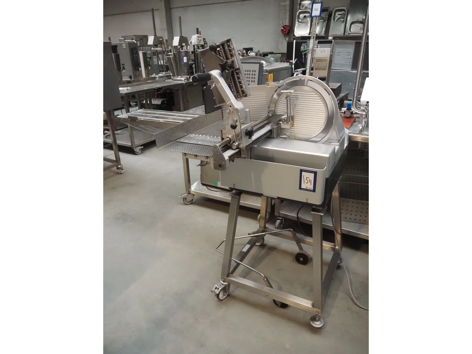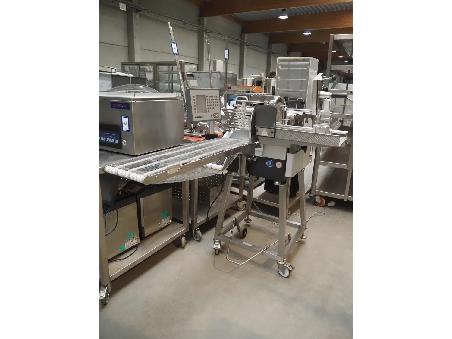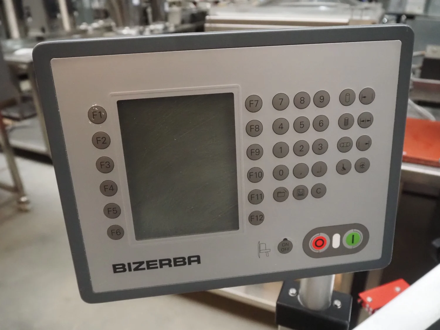 Bizerba mobile slicer, model: A 40X FB, number: 11058000, year of construction: 2014, 400 V, 3 Ph, 50 Hz, 4.8 A, s/s mesh belt, belt width: 250 mm, total dimensions: 1550 mm x 980 mm x 1480 mm.