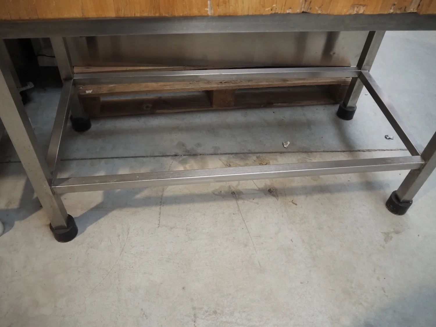 Wooden chop block, s/s frame, dimensions: 1200 mm x 600 mm x 880 mm.
