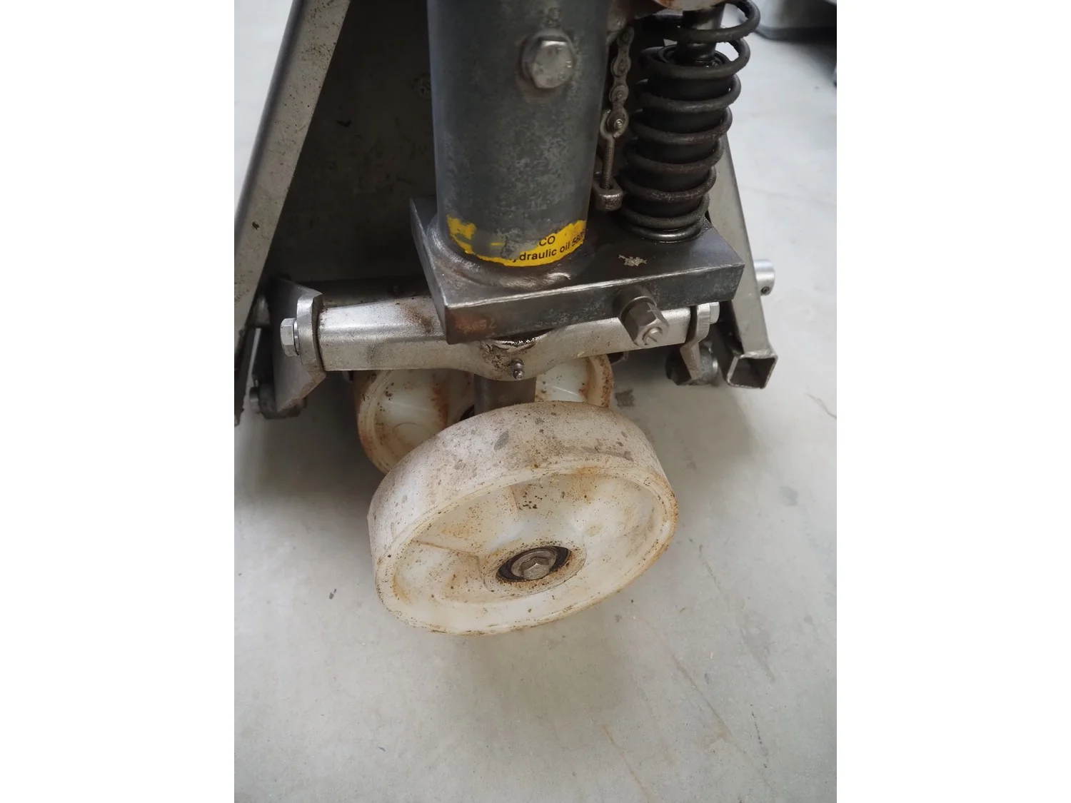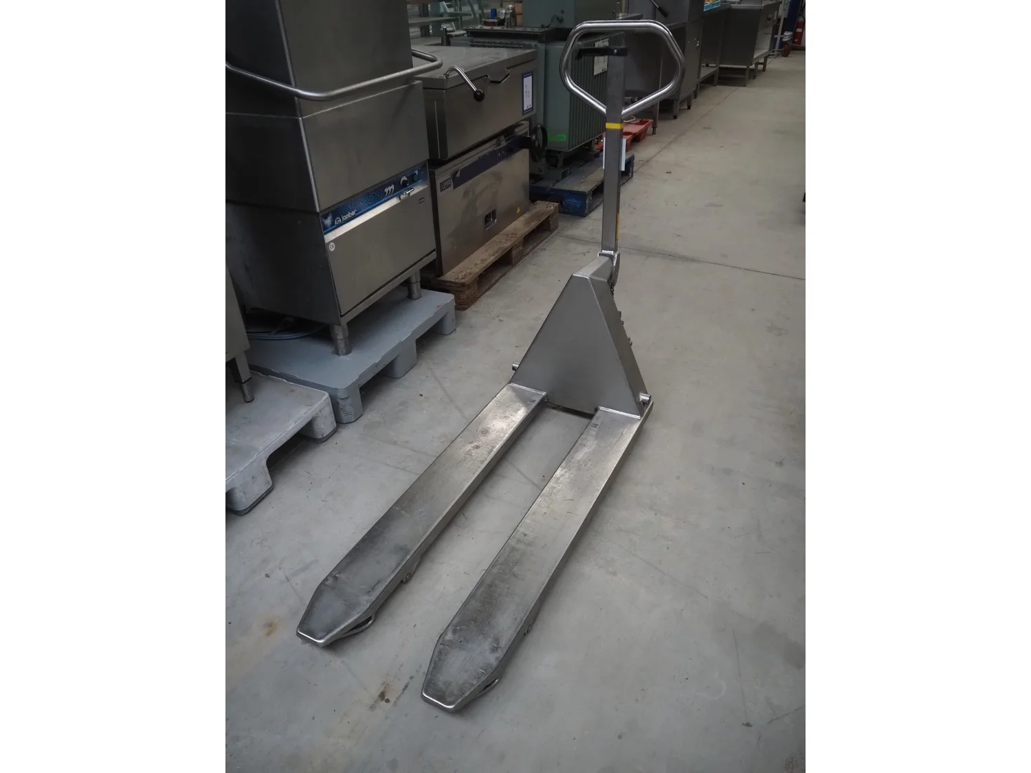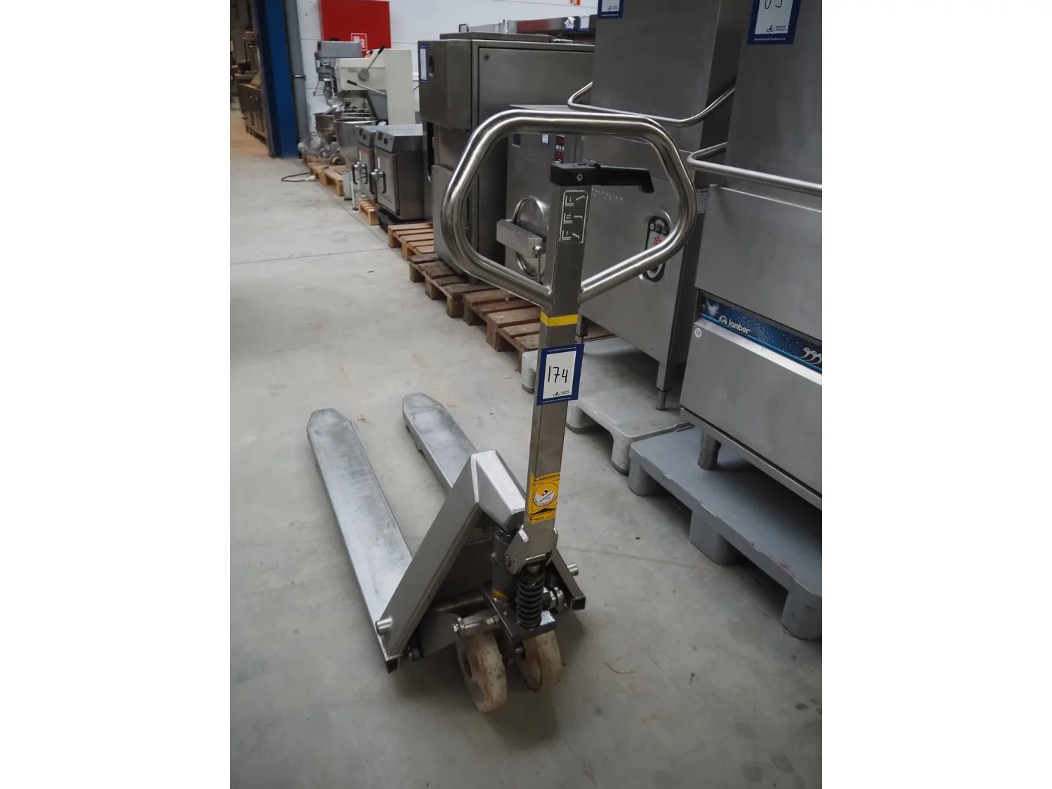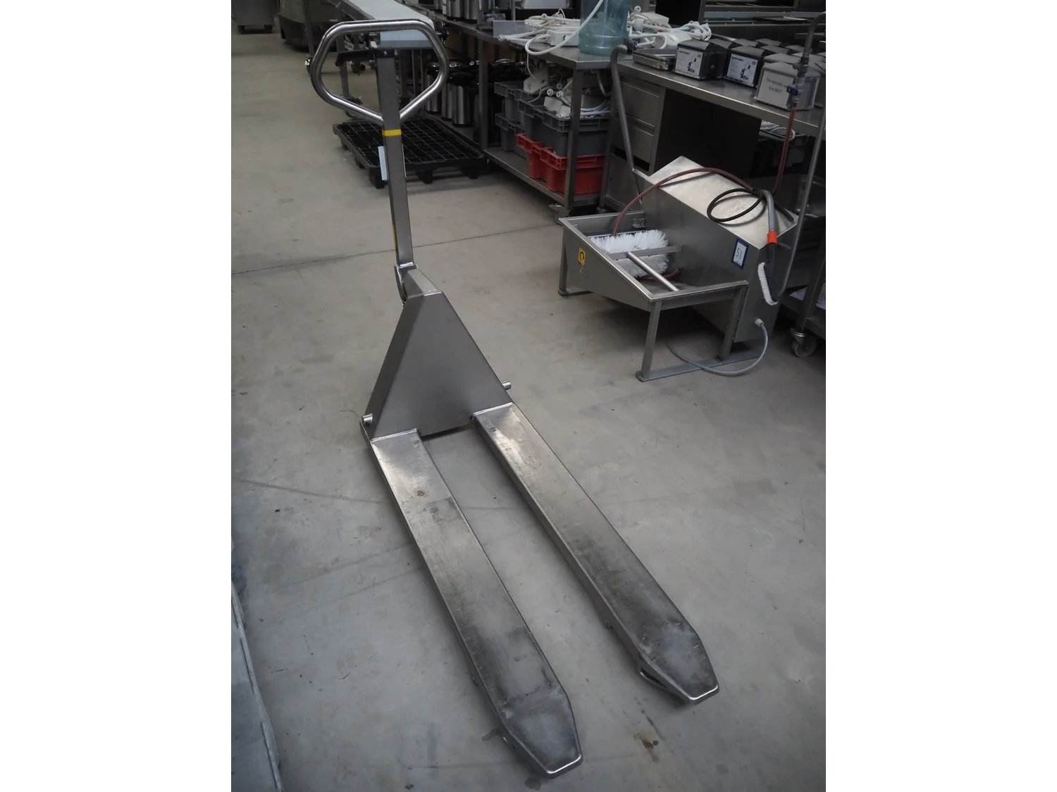Logitrans s/s pallet lifter, serial number: 083B04064236, year of construction: 2008, capacity: 2000 kg, fork length: 1140 mm, total dimensions: 1600 mm x 520 mm x 1220 mm.