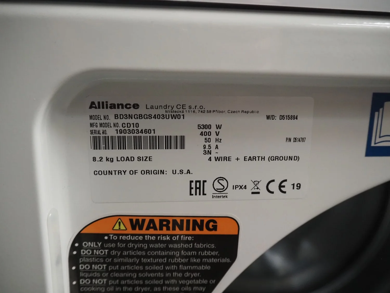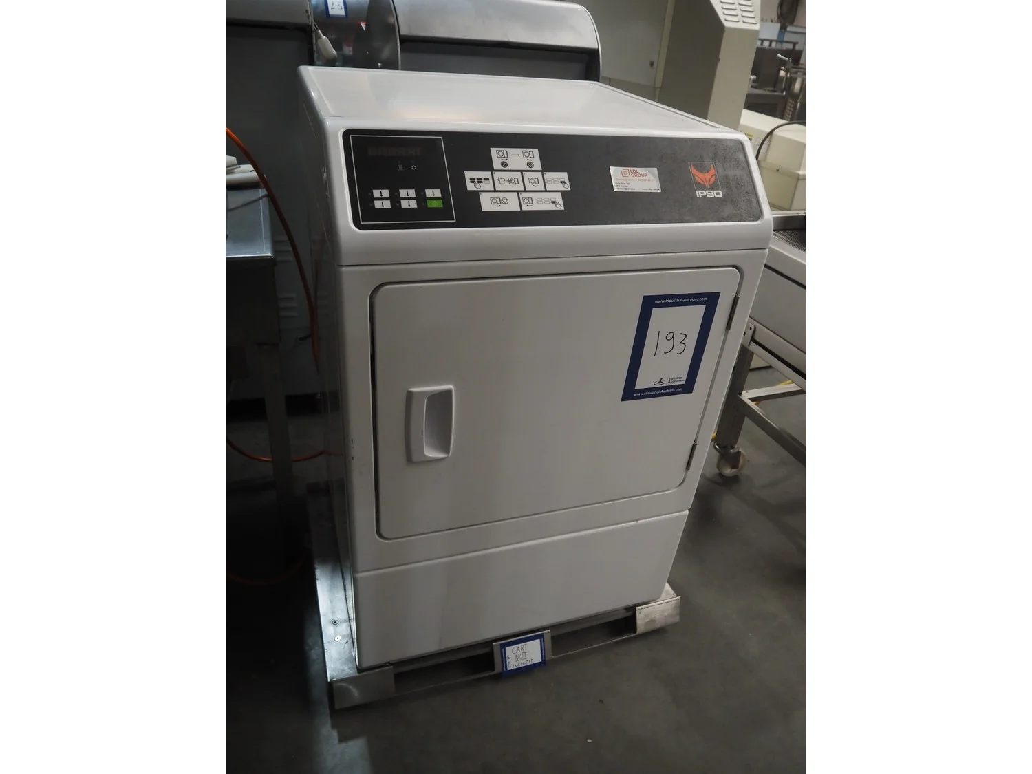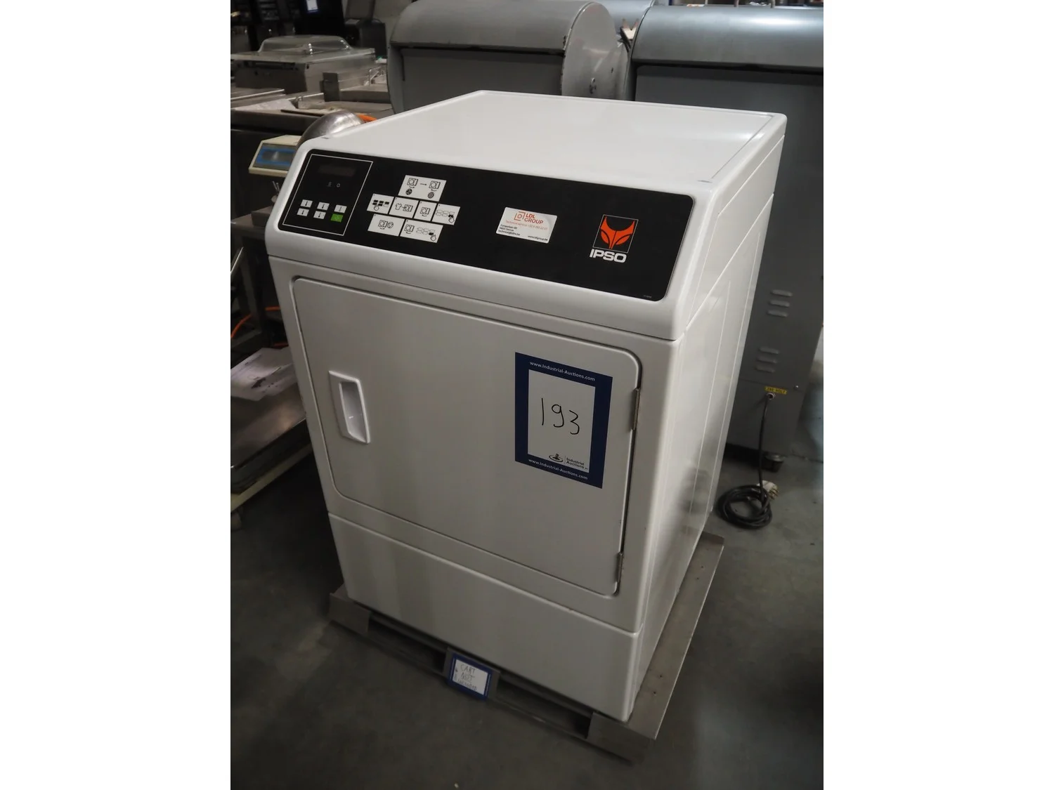IPSO dryer, model: CD10, serial number: 1903034601, 400 V, 3 Ph, 50 Hz, 9.5 A, 5300 W, maximum capacity: 8.2 kg, dimensions: 700 mm x 700 mm x 1050 mm.