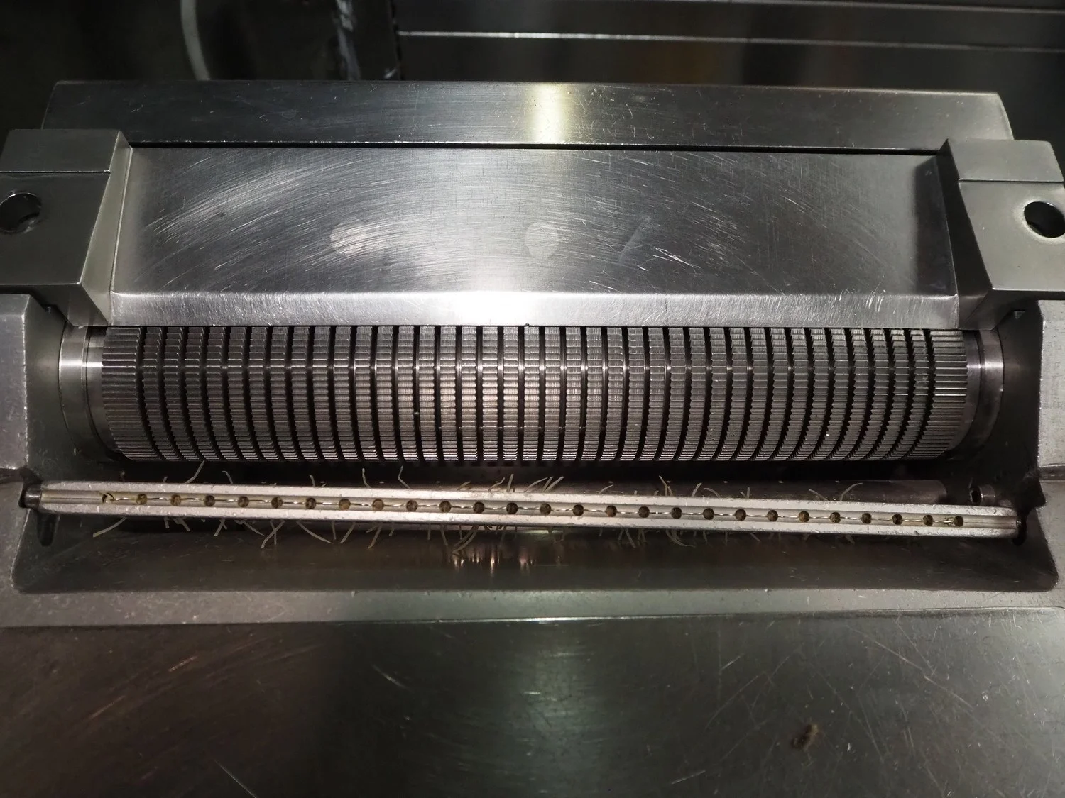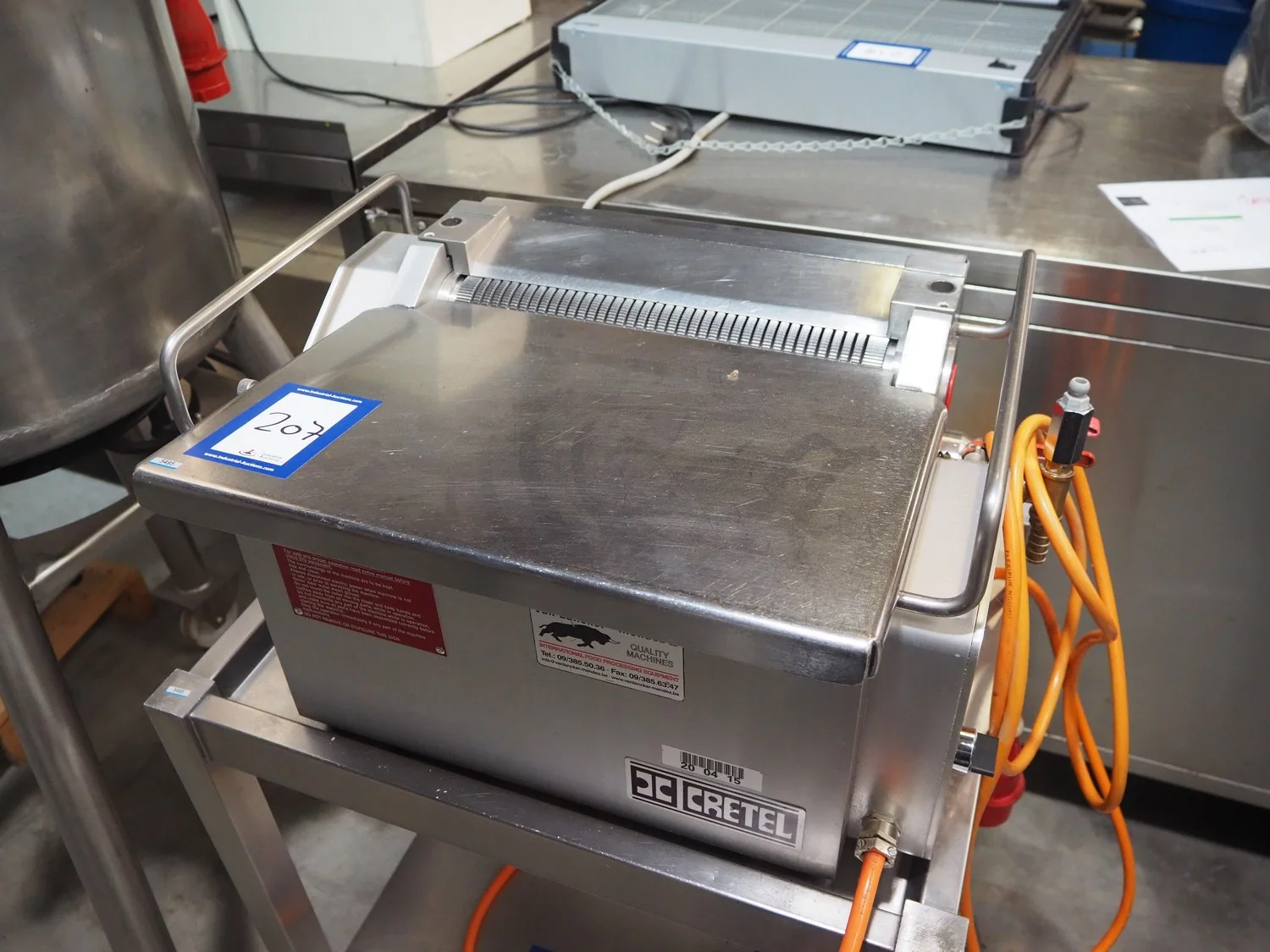 Cretel skinning machine, type: 360F, number: A894.90.03, year of construction: 1990, 220/380 V, 50 Hz, 2.46/1.42 A, 0.55 kW, working width: 325 mm, total dimensions: 550 mm x 450 mm x 350 mm. Without table.