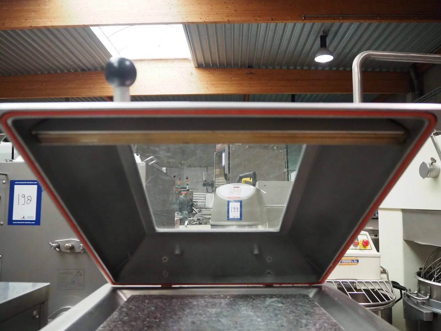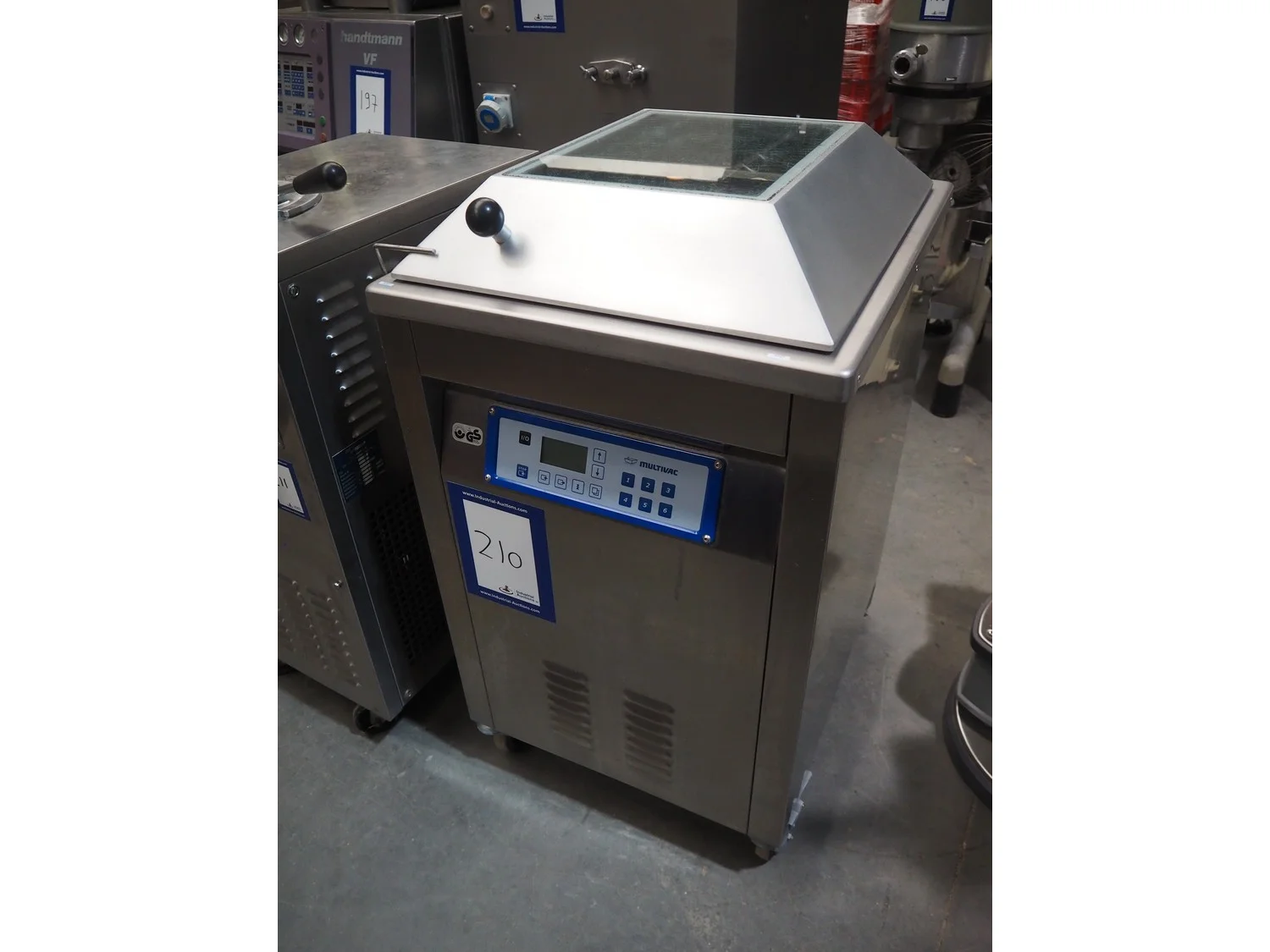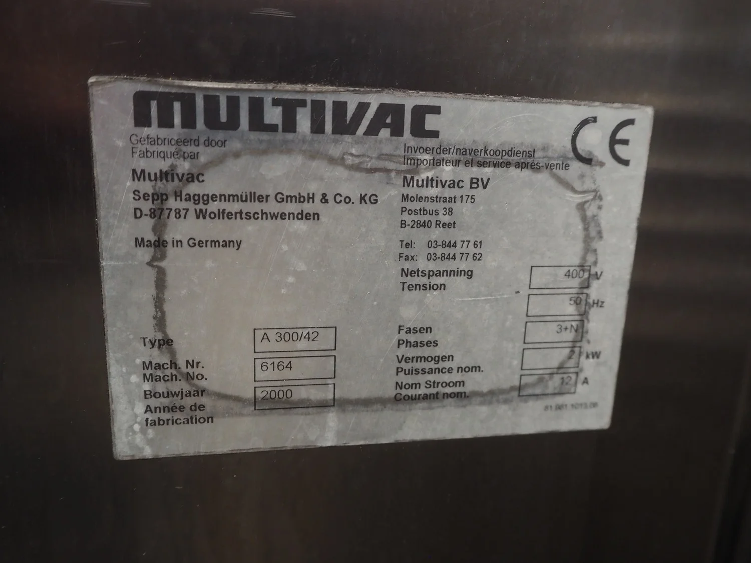 Multivac mobile vacuum machine, type: A 300/42, number: 6164, year of construction: 2000, 400 V, 3 Ph, 50 Hz, 12 A, 2 kW, seal length: 450 mm, dimensions chamber: 500 mm x 450 mm, total dimensions: 650 mm x 550 mm x 1000 mm.