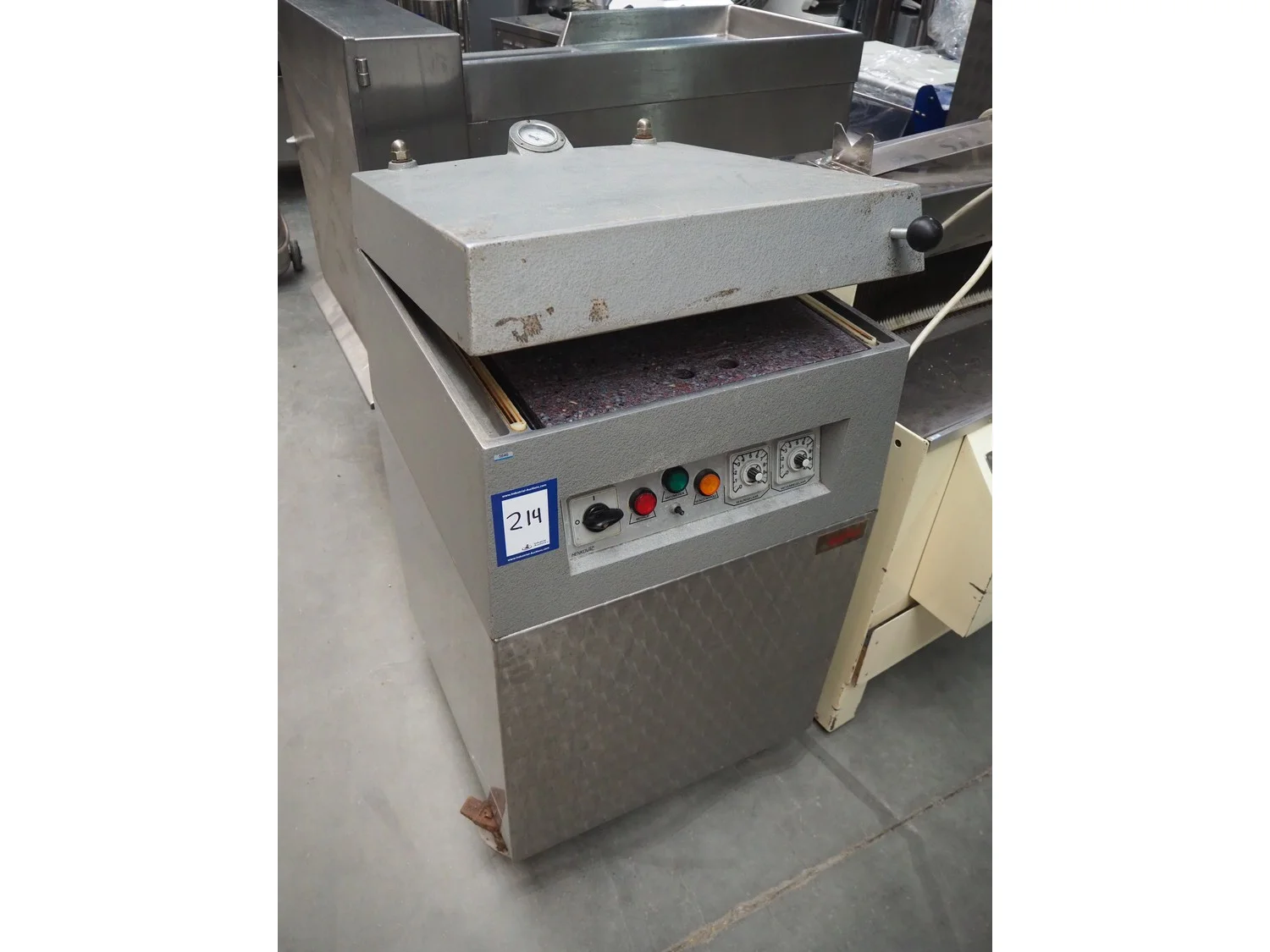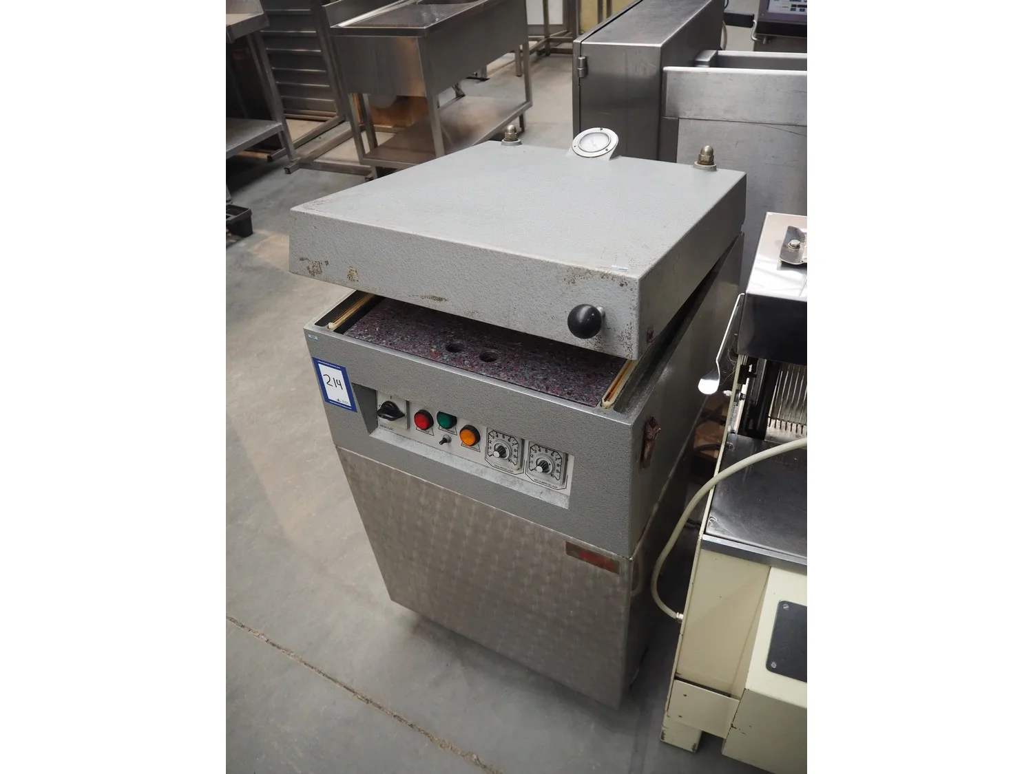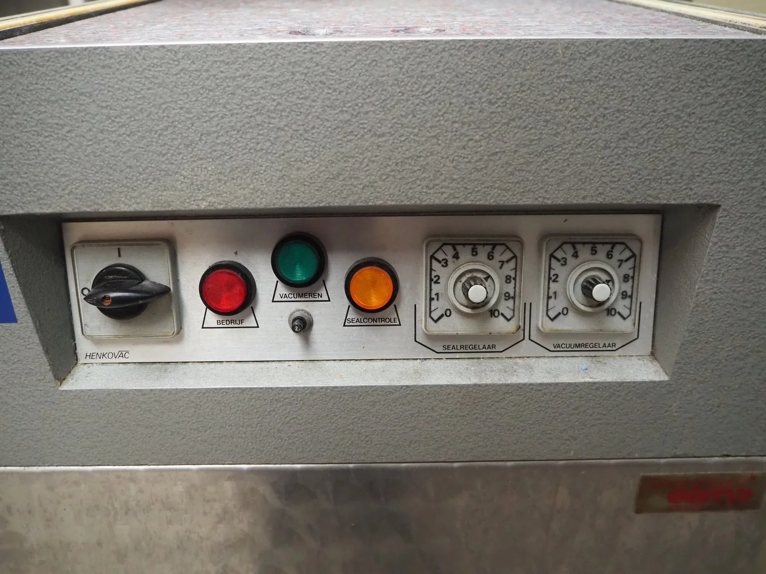 Henkovac mobile vacuum machine, type: VA-2, machine number: 28036271, 220/380 V, 3 Ph, 50 Hz, 2.5 kW, 8.9 A, seal length: (2x) 500 mm, dimensions chamber: 450 mm x 500 mm x 60 mm, with Busch vacuum pump, type: 063-122, capacity: 63 m3/h, total dimensions: 600 mm x 650 mm x 1120 mm.