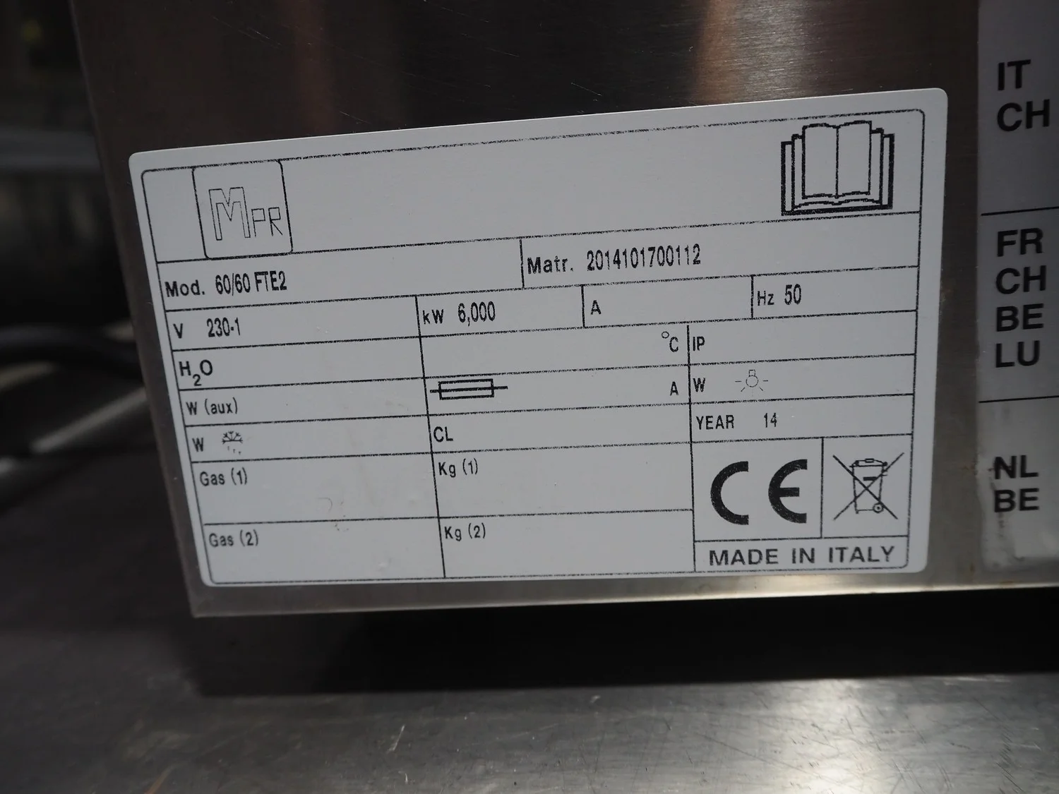 Diamond/MPR grill, model: 60/60 FTE2, number: 2014101700112, year of construction: 2014, 230 V, 1 Ph, 50 Hz, 6 kW, grill dimensions: 595 mm x 470 mm, total dimensions: 630 mm x 600 mm x 420 mm.