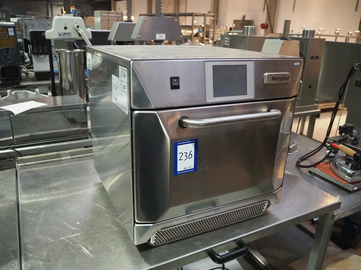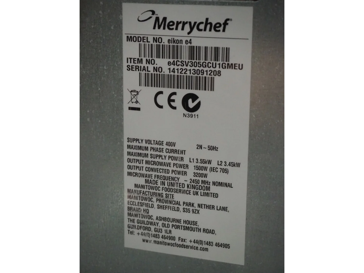Merychef turbo oven, type: eikon e4, serial number: 1412213091208, 400 V, 3 Ph, 50 Hz, inside dimensions: 370 mm x 310 mm x 190 mm, total dimensions: 770 mm x 585 mm x 590 mm.