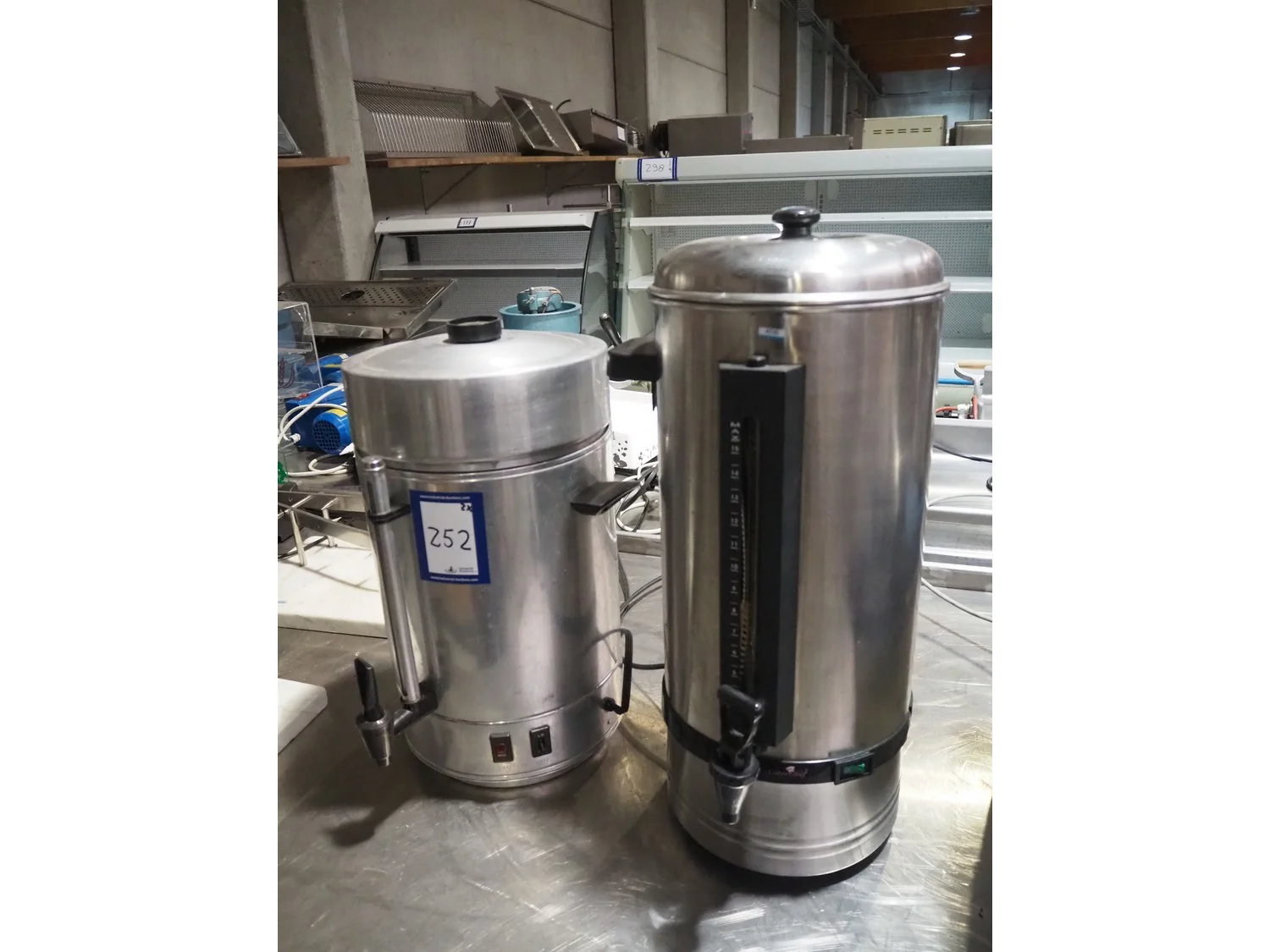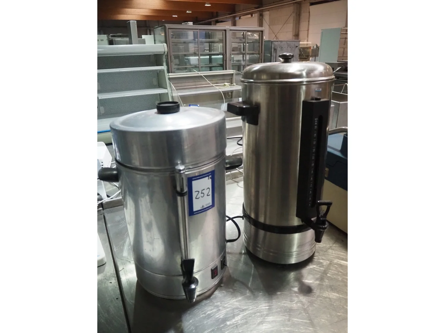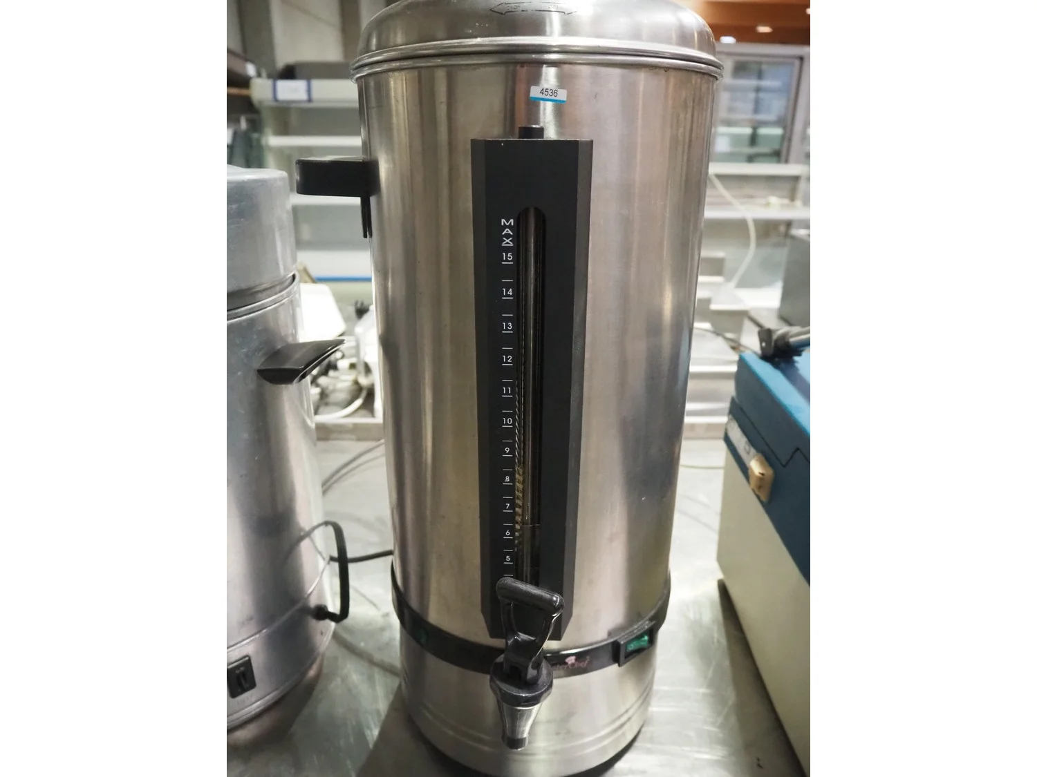 Karma Global Ltd. Coffee percolator and filter, model: 688092, serial number: C030015, year of construction: 2007, 230 V, 1 Ph, 50 Hz, 1620 W, volume: 15 liter, dimensions: 350 mm x 280 mm x 650 mm and 320 mm x 330 mm x 530 mm.