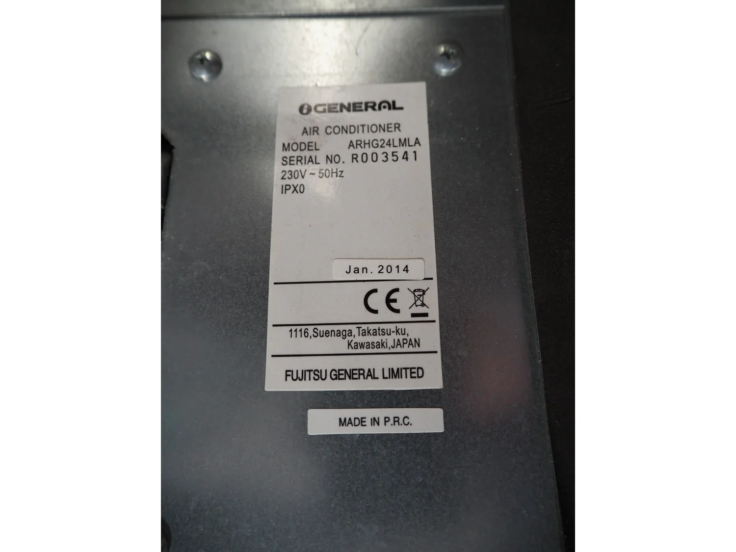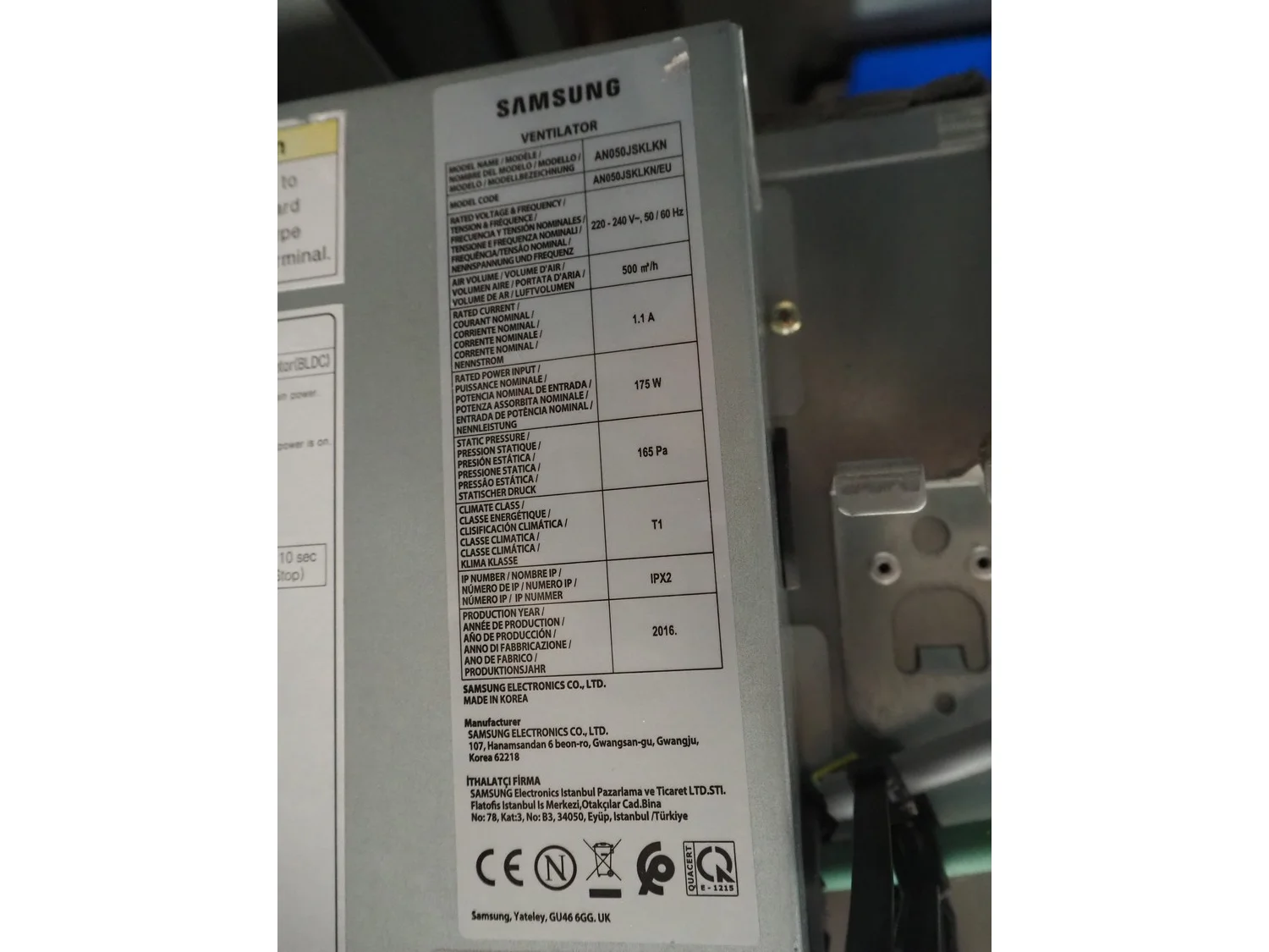 Fujitsu General air conditioner, model: ARHG24LMLA, serial number: R003541, 230 V, 50 Hz, dimensions: 1310 mm x 830 mm x 280 mm and Samsung ventilator, model: AN050JSKKLKN/EU, year of construction: 2016, 220-240 V, 50/60 Hz, 1.1 A, 175 W, dimensions: 1220 mm x 1080 mm x 280 mm.