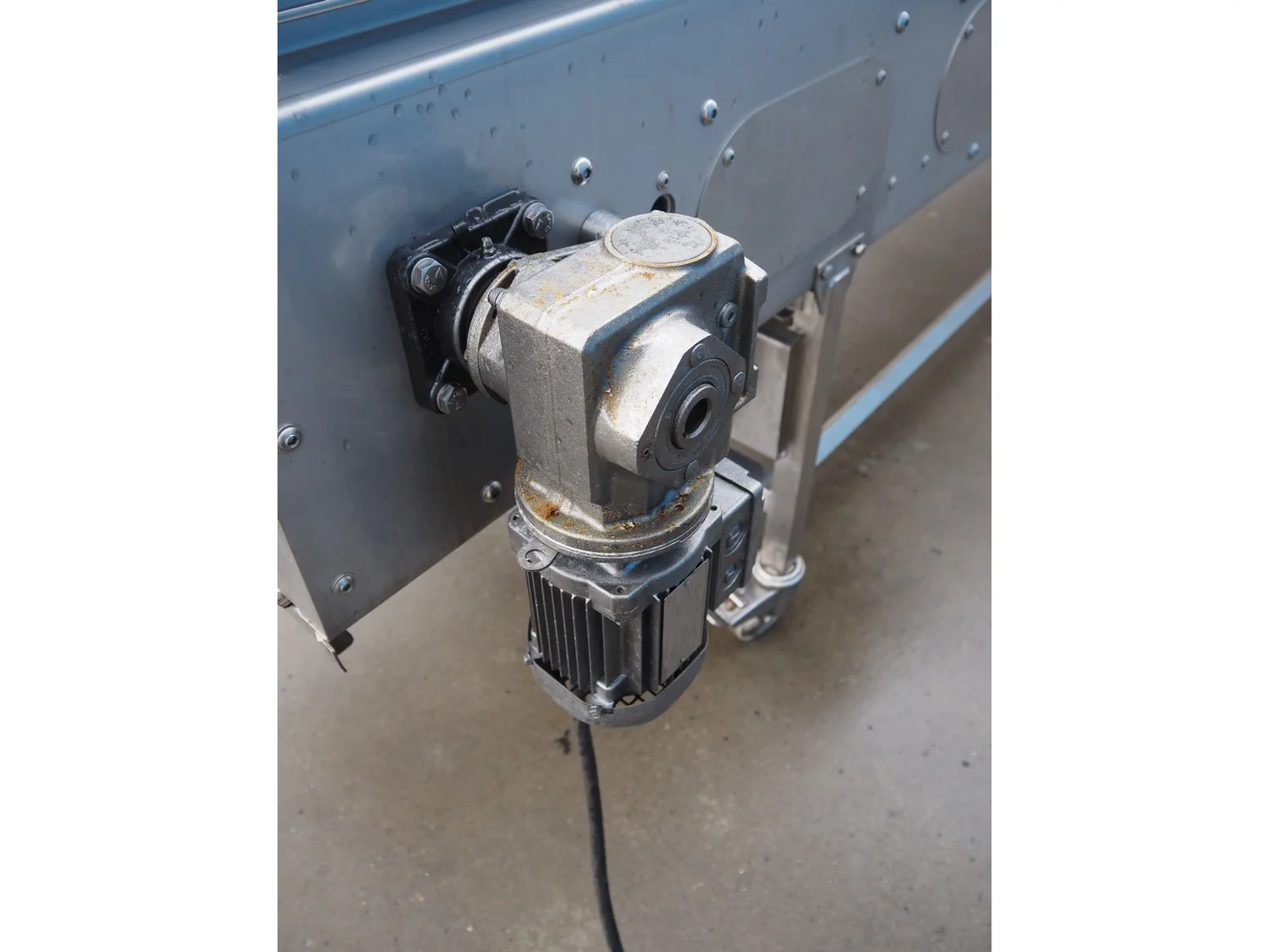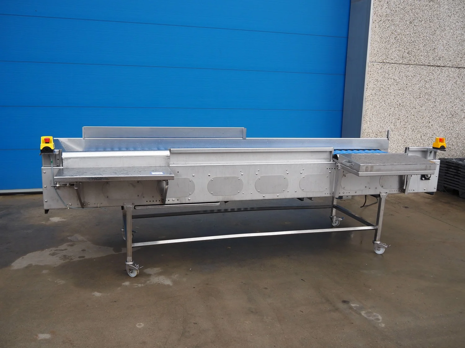 Mobile roller conveyor, s/s frame, plastic rollers, roller width: 755 mm, total dimensions: 3625 mm x 1450 mm x 1180 mm.
