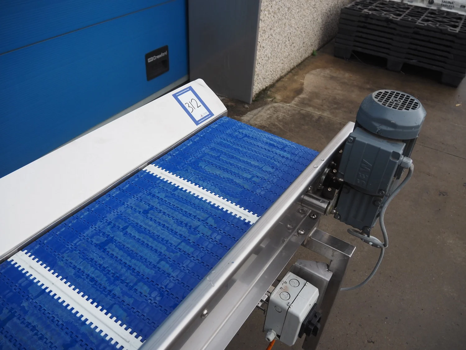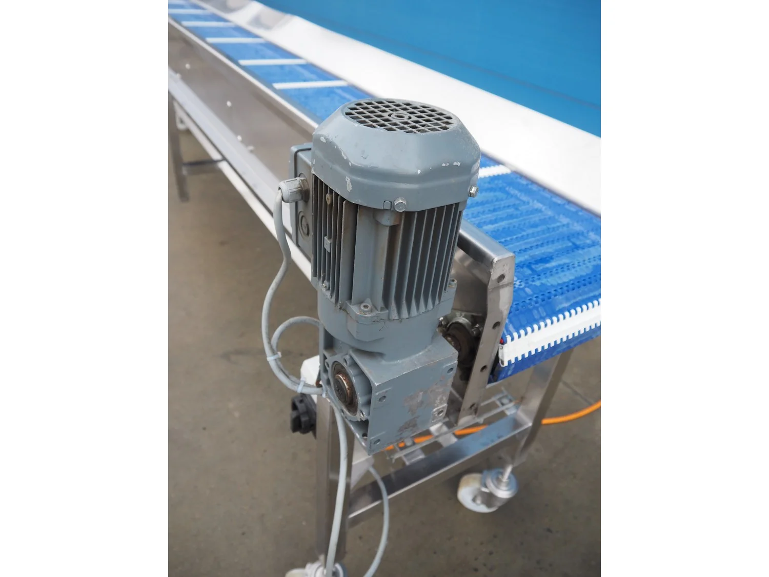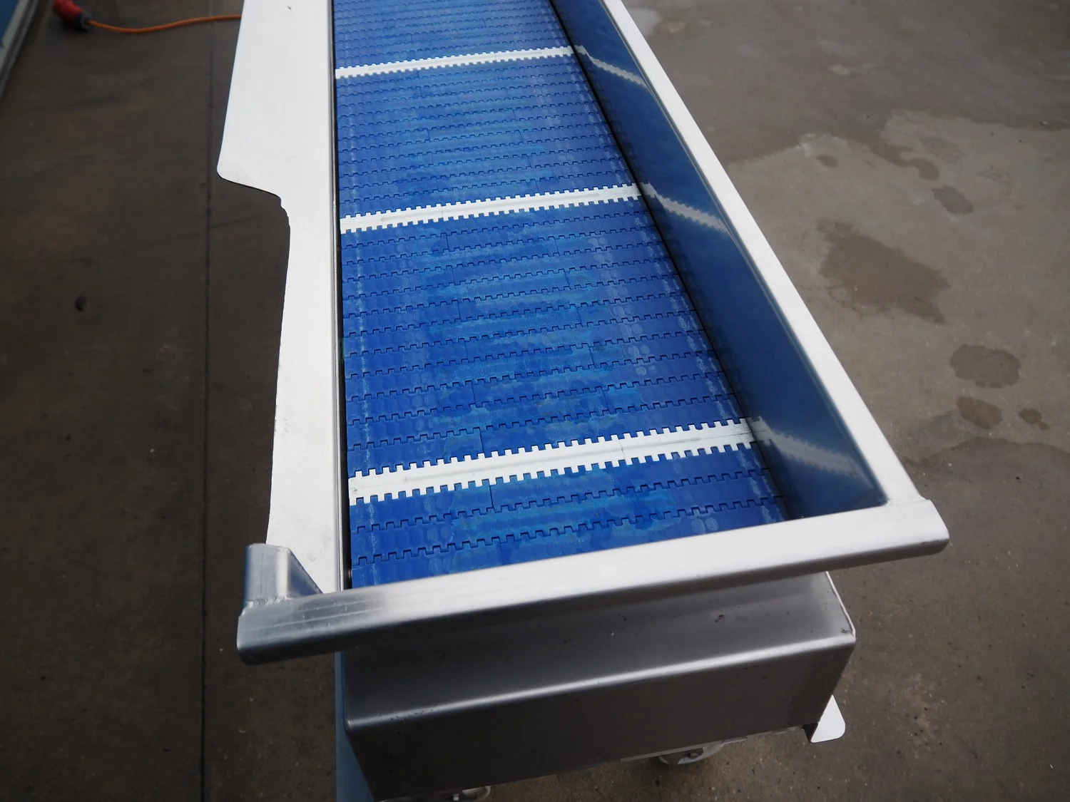 Mobile transport belt, s/s frame, plastic belt, belt width: 300 mm, total dimensions: 3380 mm x 600 mm x 1000 mm.