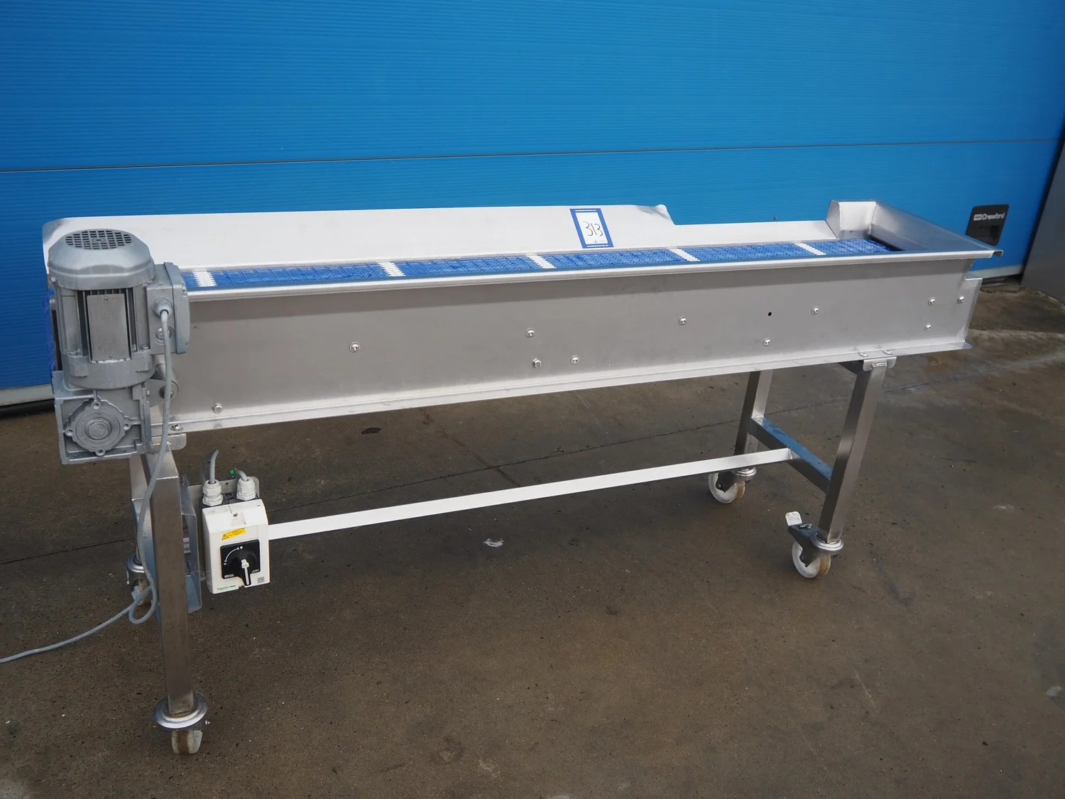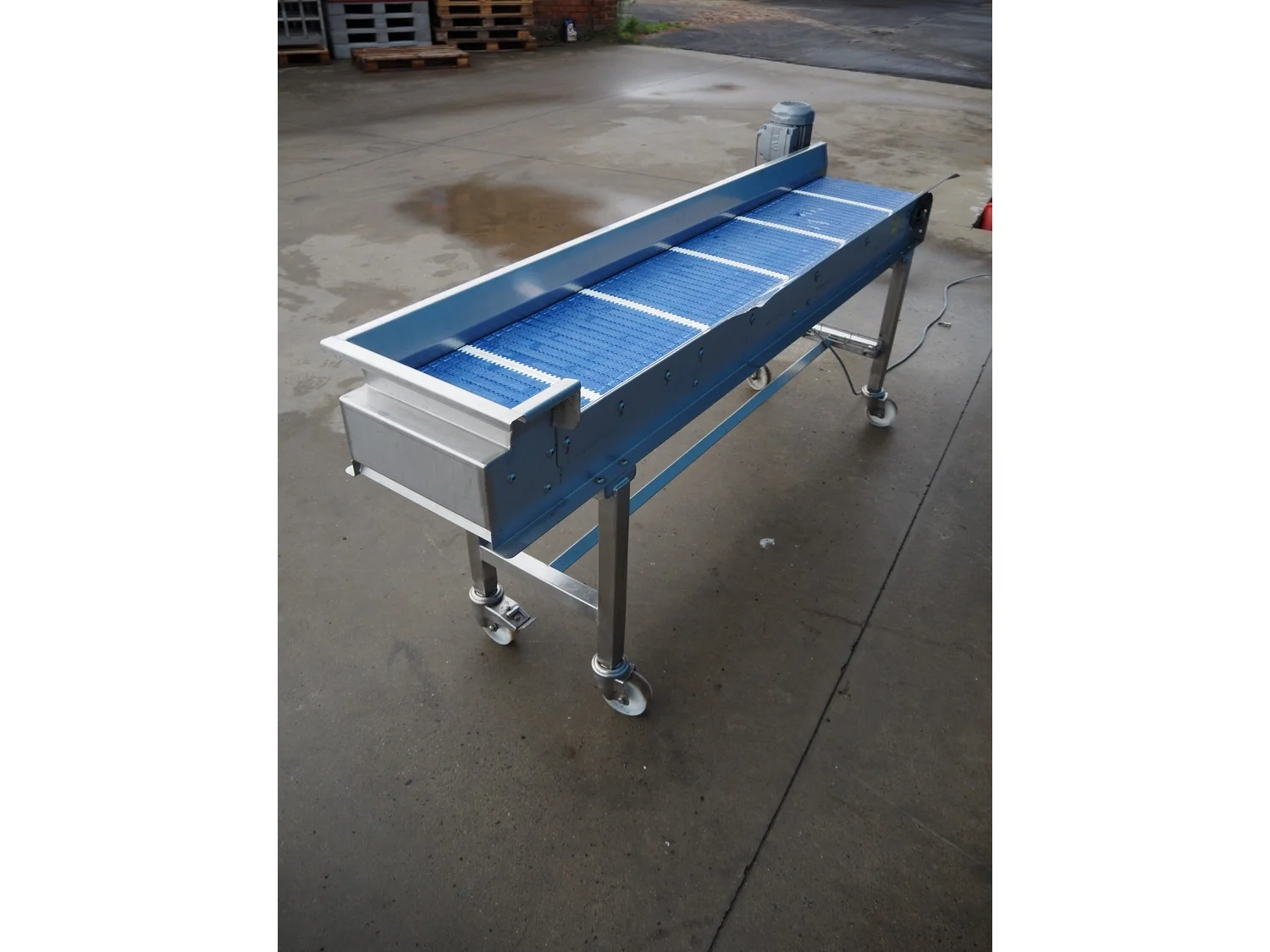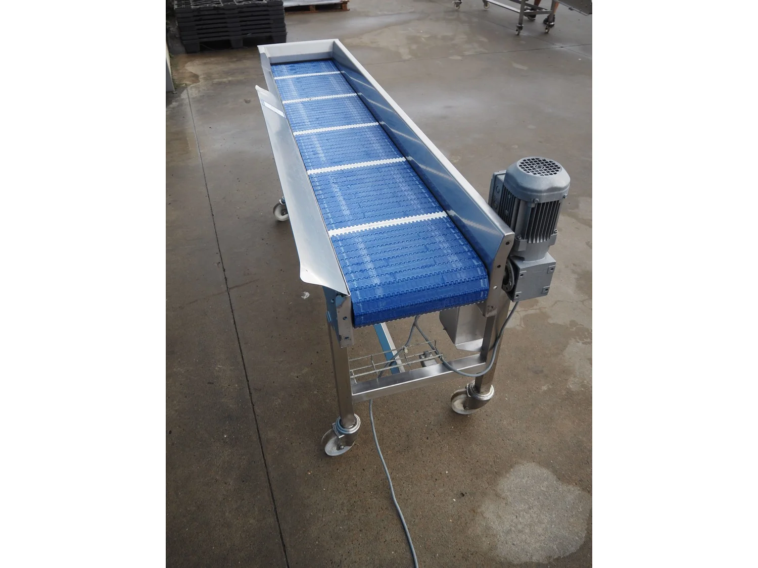 Mobile transport belt, s/s frame, plastic belt, belt width: 300 mm, total dimensions: 1800 mm x 590 mm x 950 mm.