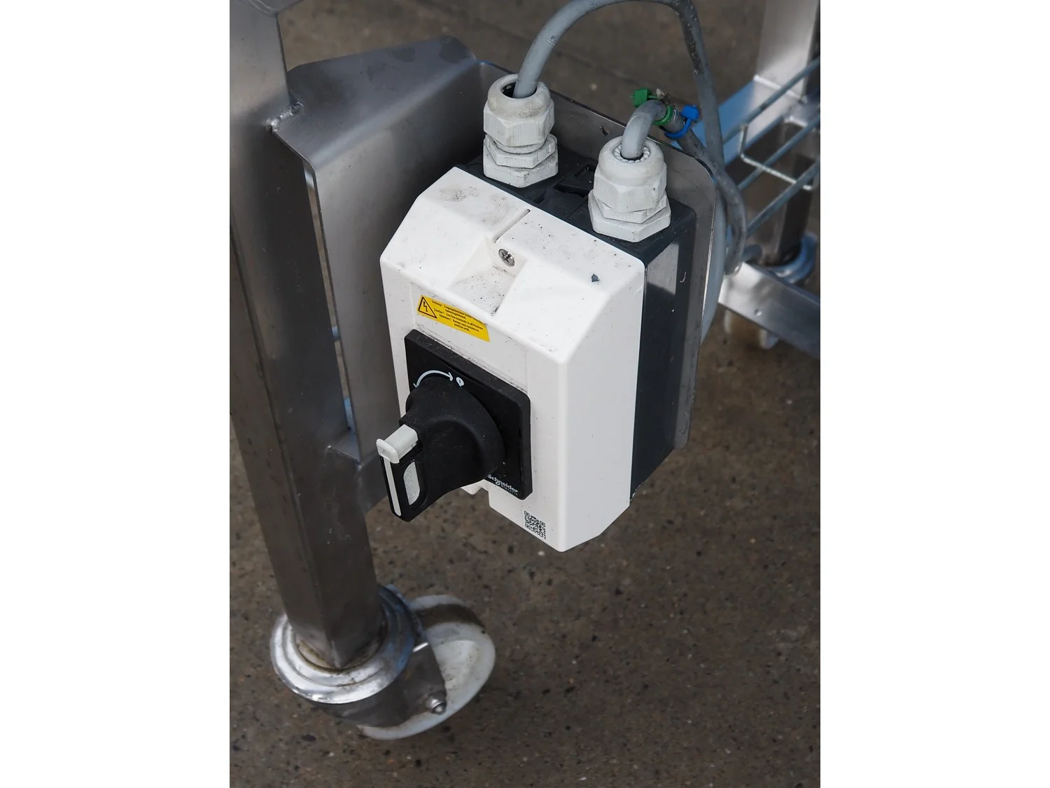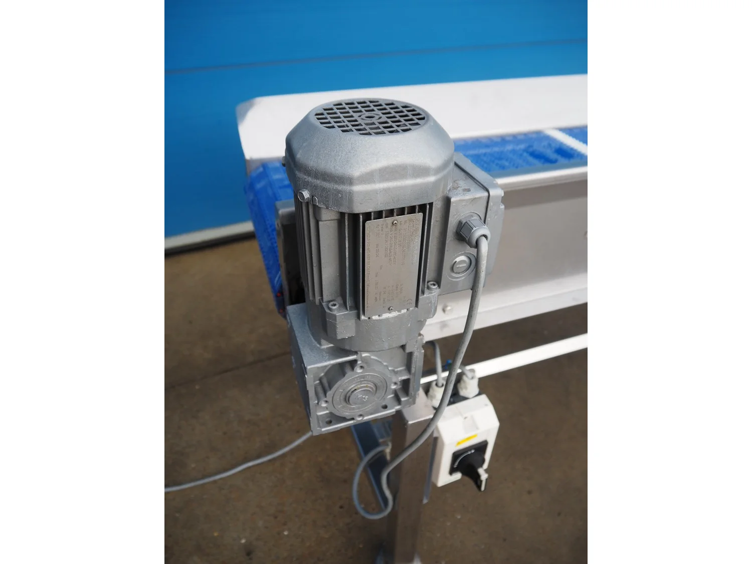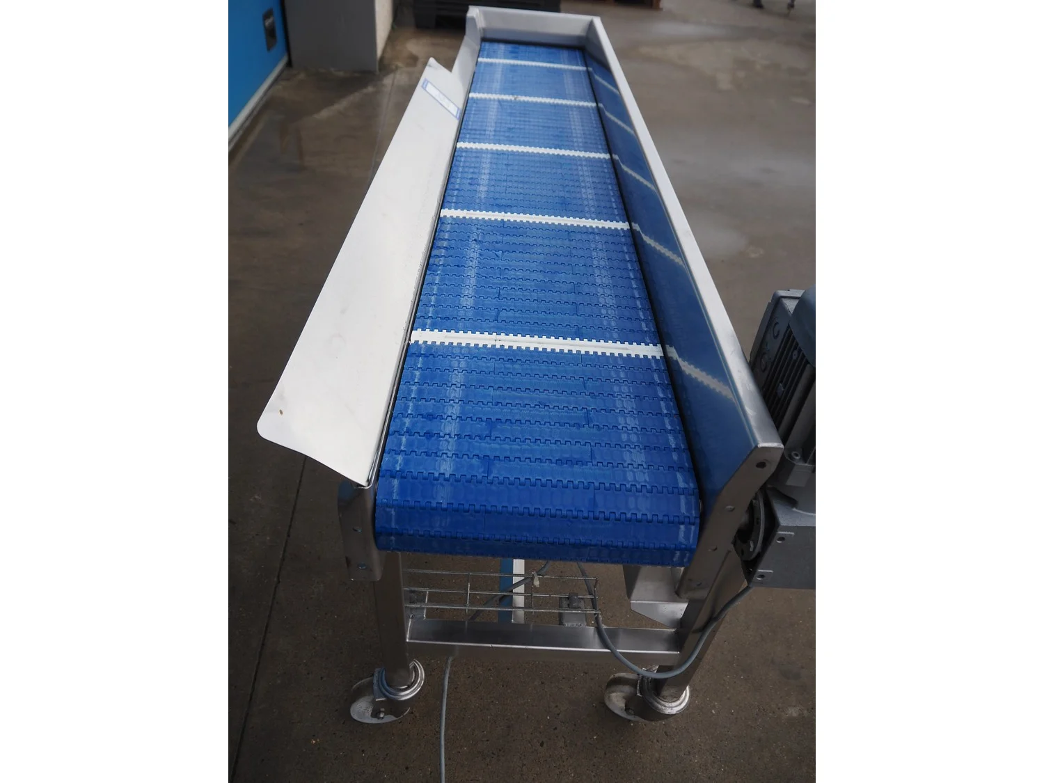 Mobile transport belt, s/s frame, plastic belt, belt width: 300 mm, total dimensions: 1800 mm x 590 mm x 950 mm.