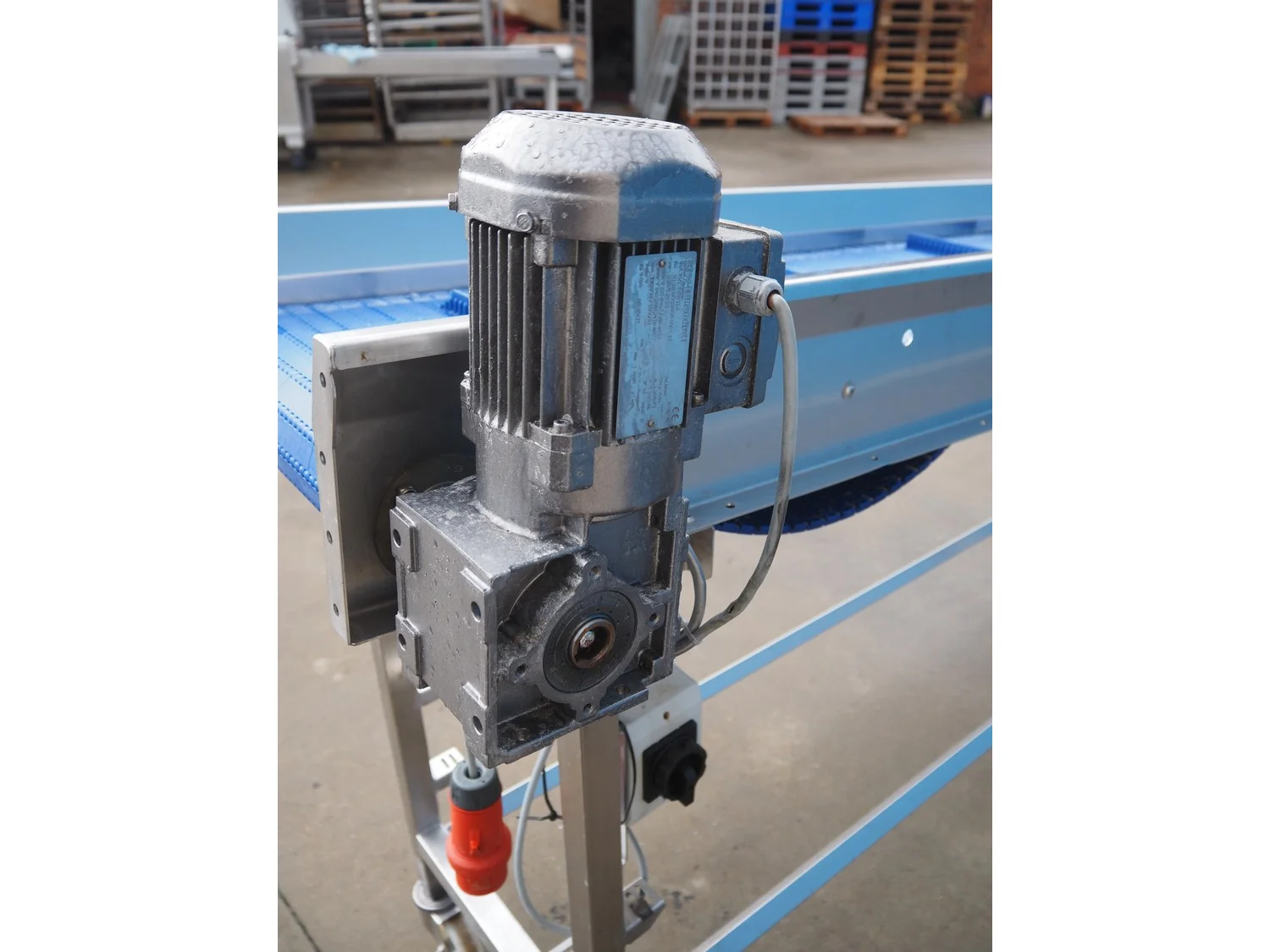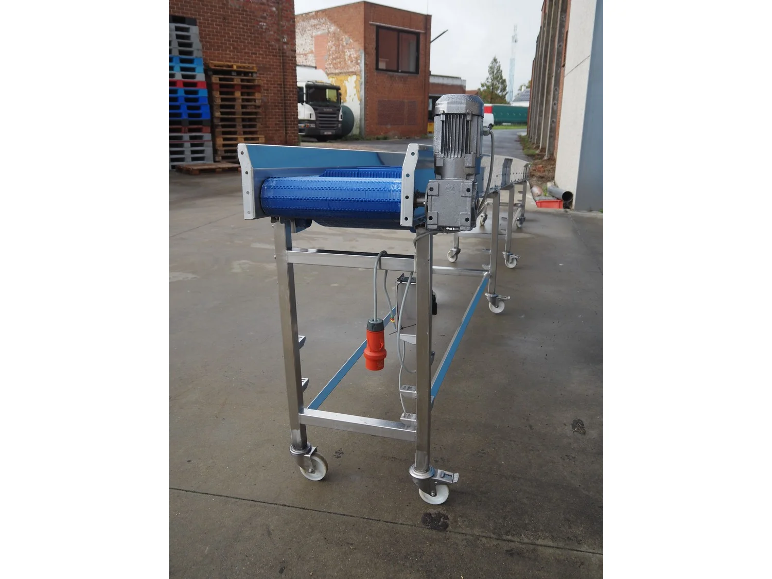 Mobile elevating belt with dividers, s/s frame, plastic belt, belt width: 400 mm, divider width: 320 mm, distance between dividers: 410 mm, divider height: 23 mm, elevating height: 1050 mm, total dimensions: 6550 mm x 630 mm x 1280 mm.