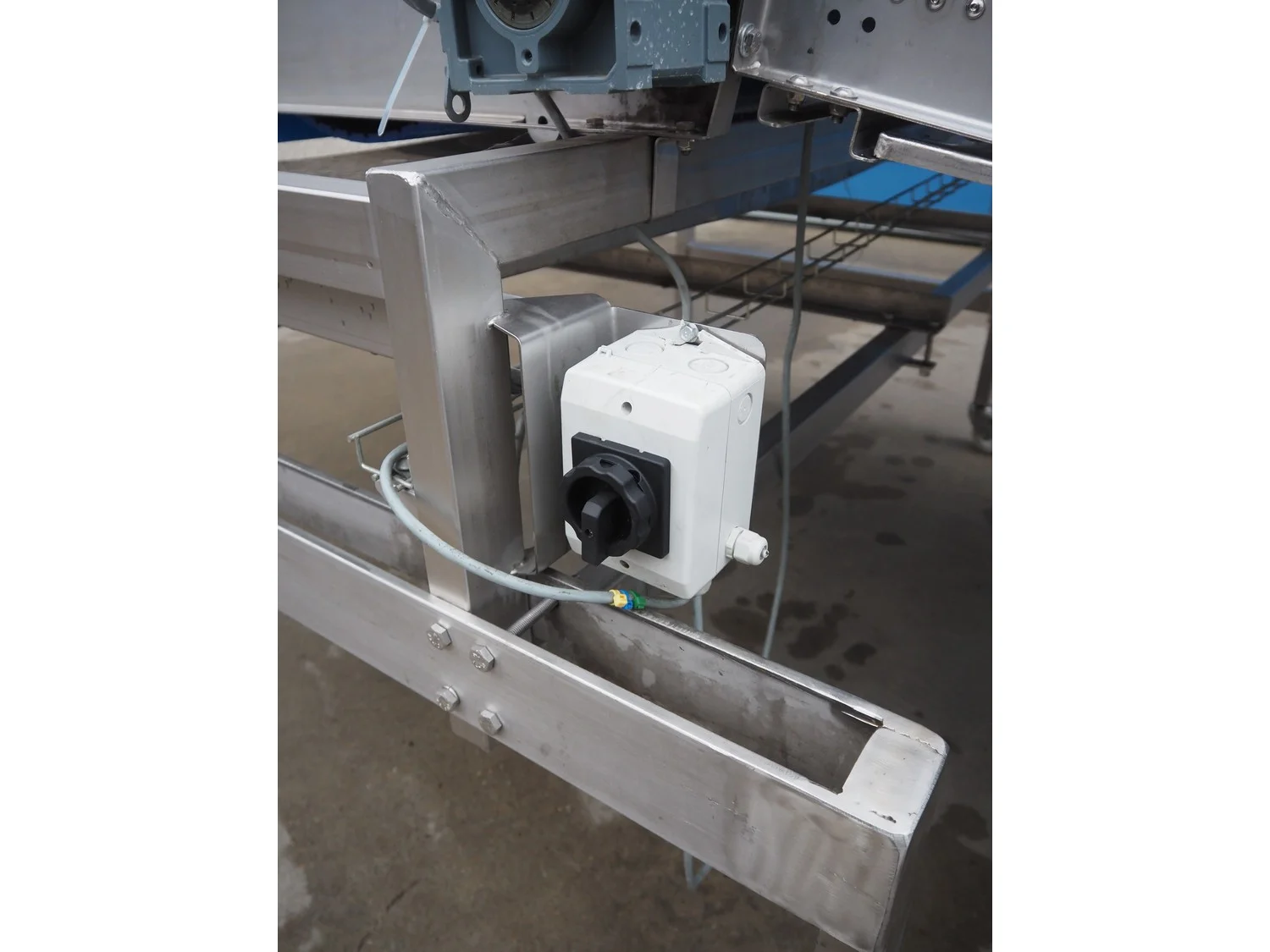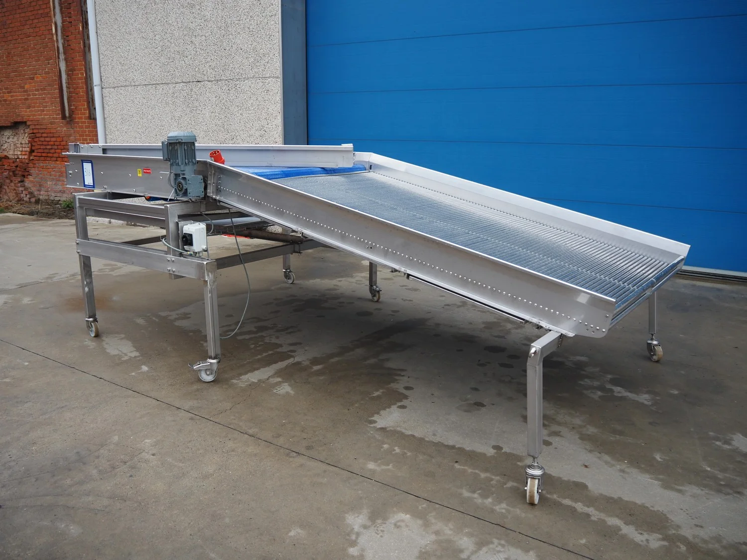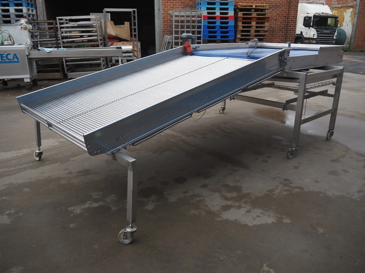 Mobile dividing belt, s/s frame, plastic belt, belt width: 1460 mm, s/s rollers, roller width: (2x) 720 mm, total dimensions: 3900 mm x 2000 mm x 1350 mm.