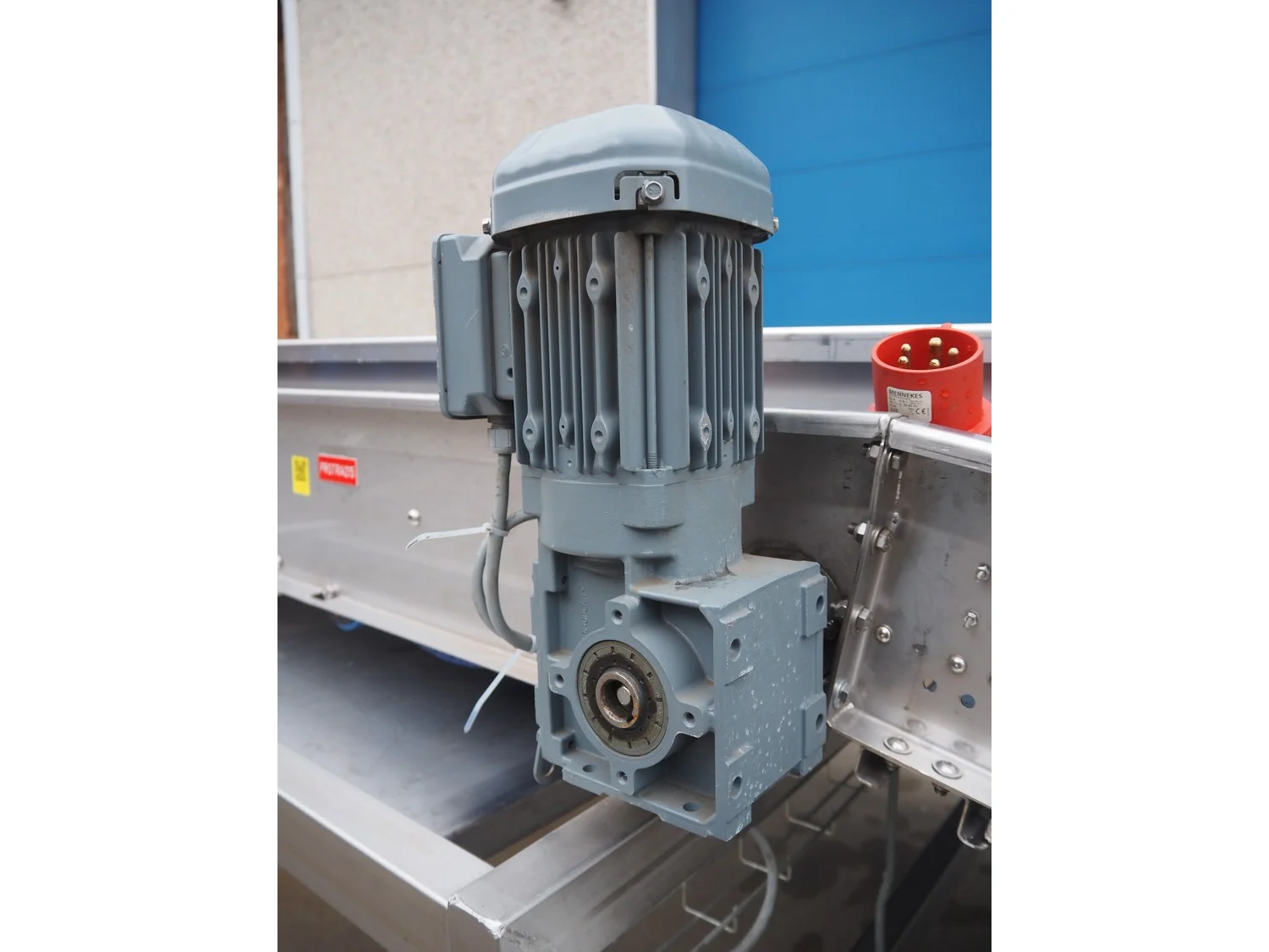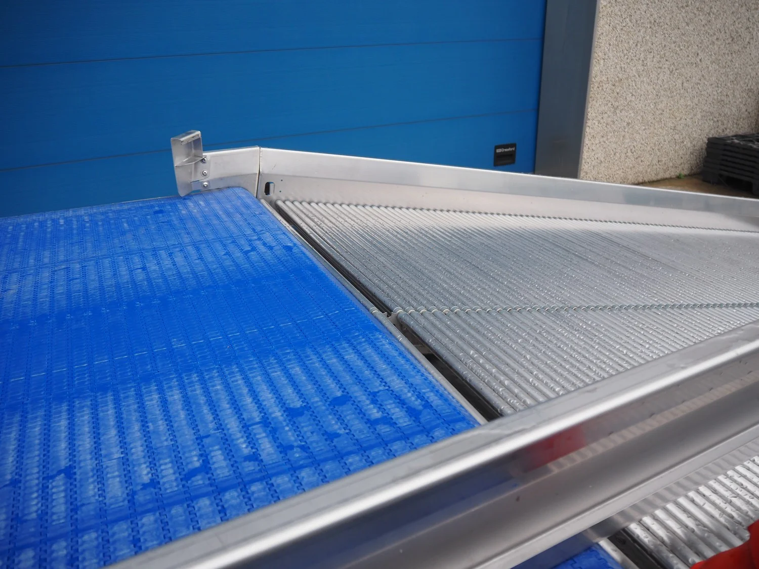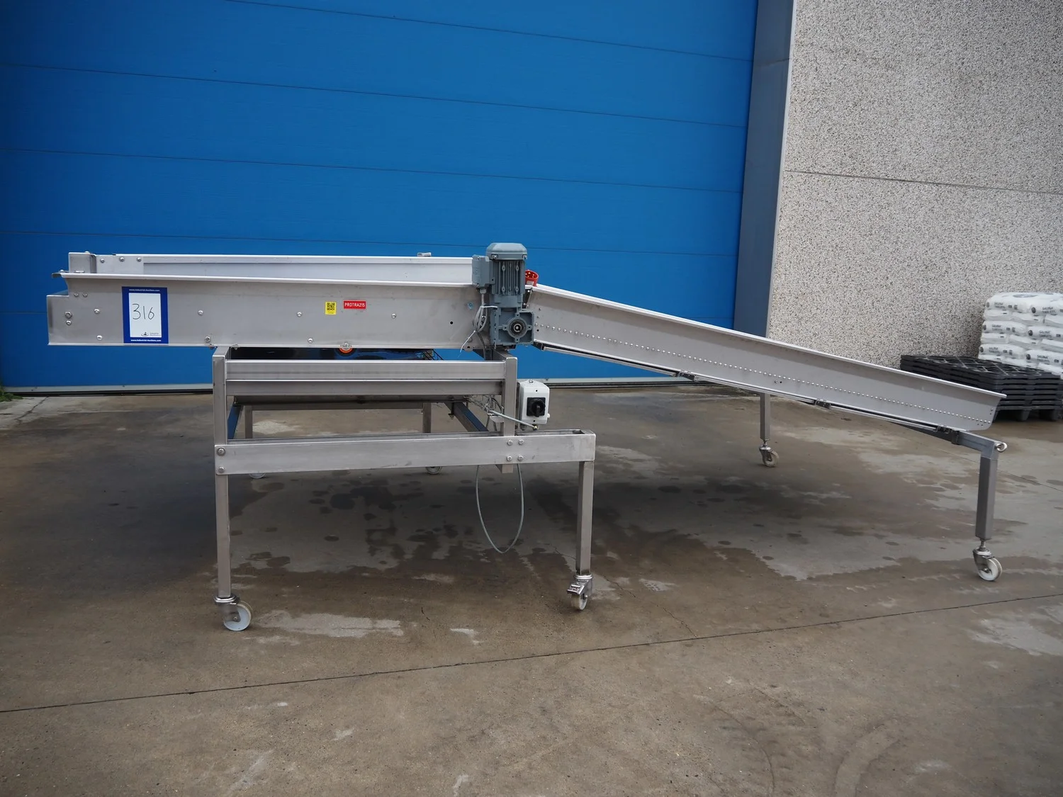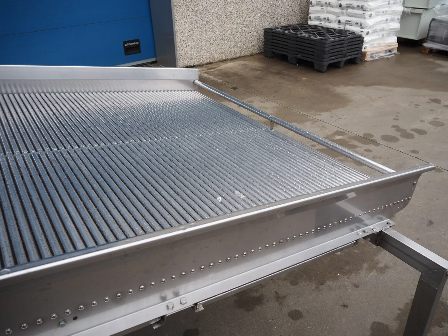 Mobile dividing belt, s/s frame, plastic belt, belt width: 1460 mm, s/s rollers, roller width: (2x) 720 mm, total dimensions: 3900 mm x 2000 mm x 1350 mm.