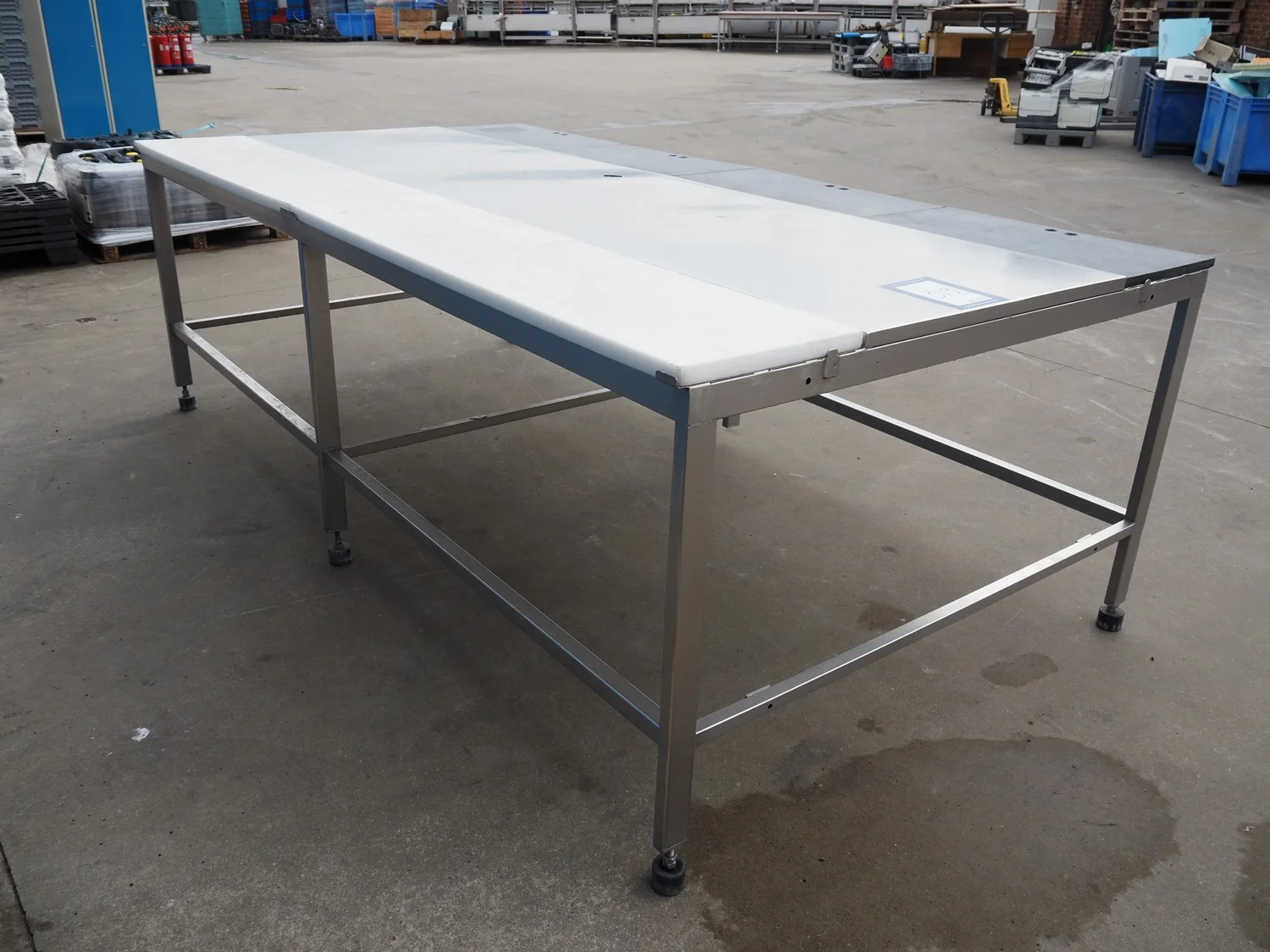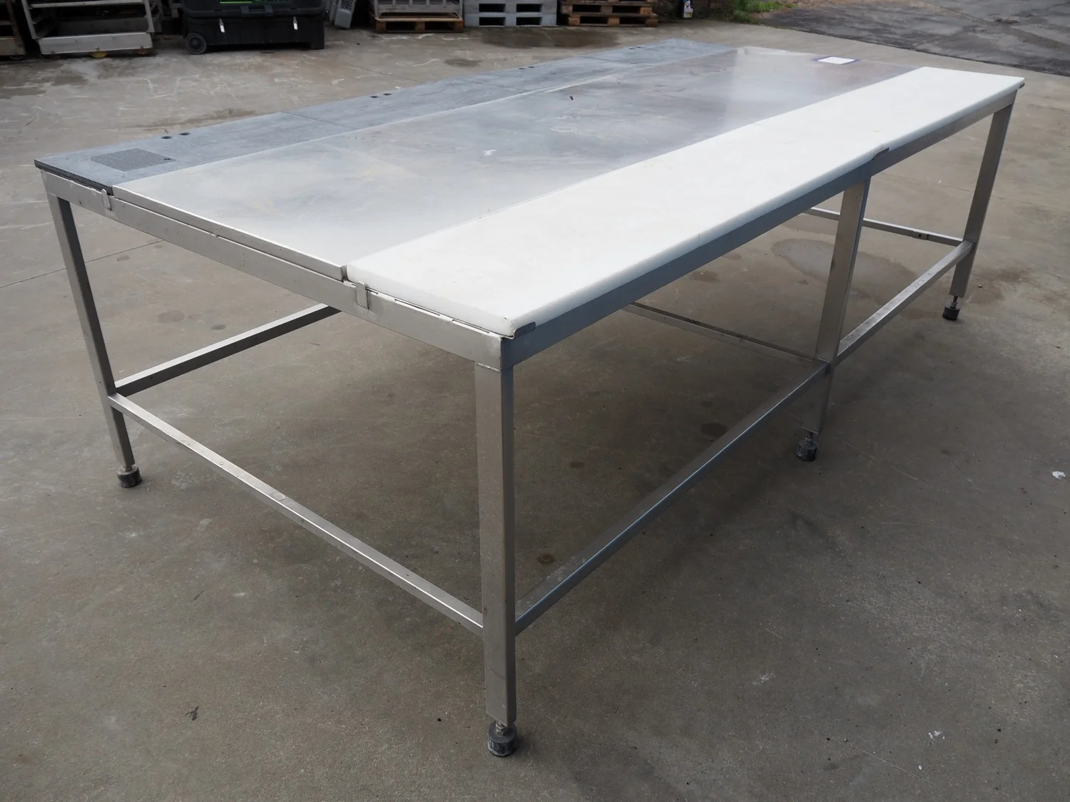 S/s table with plastic work top, dimensions: 3000 mm x 1580 mm x 990 mm.