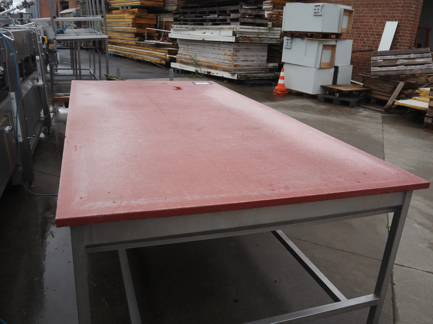 S/s table with plastic work top, dimensions: 3000 mm x 1500 mm x 910 mm.
